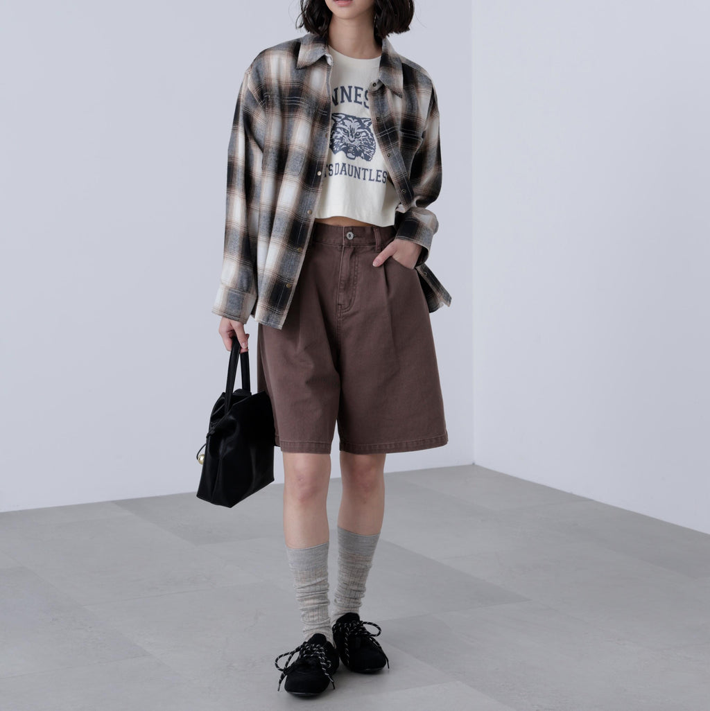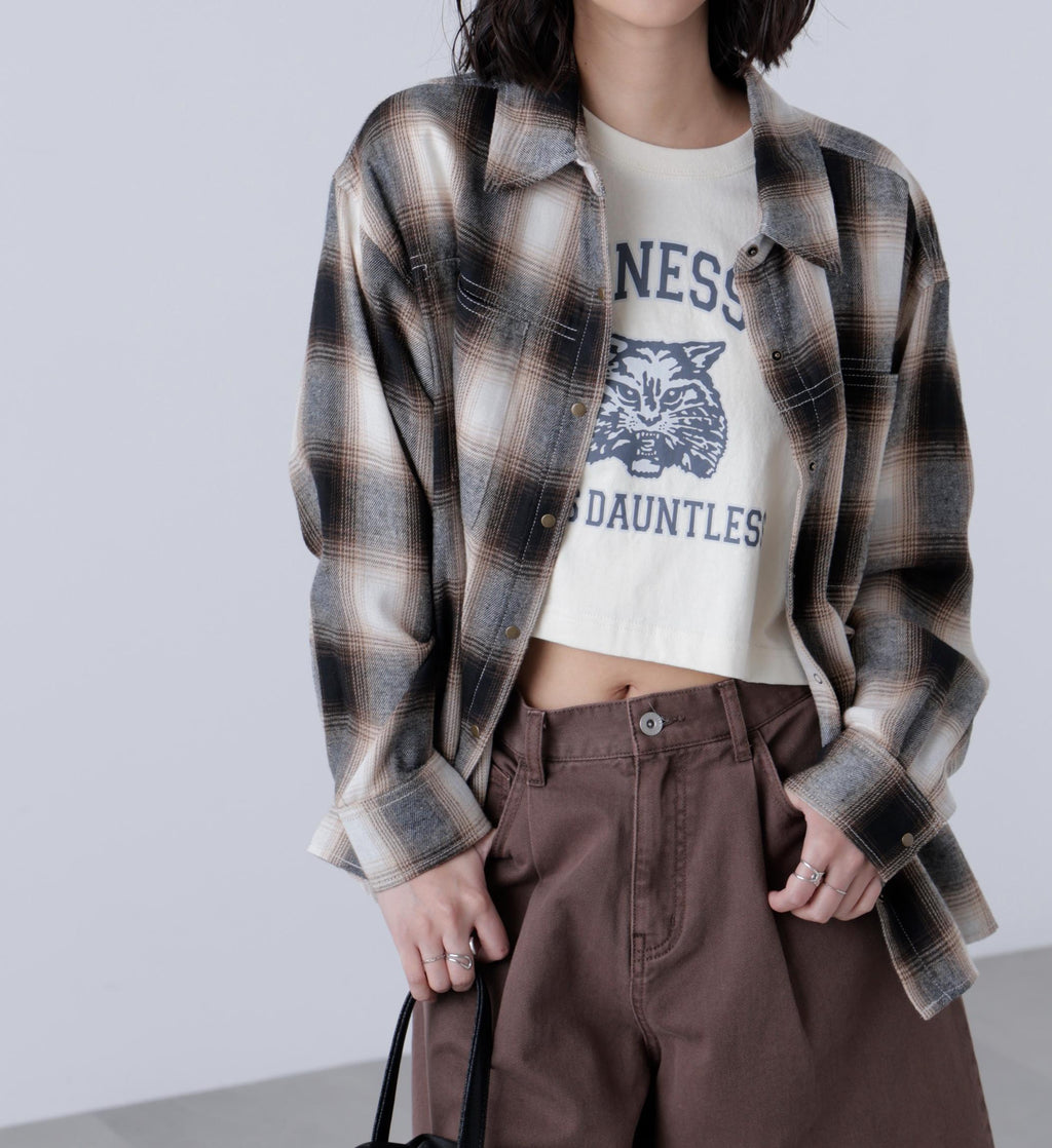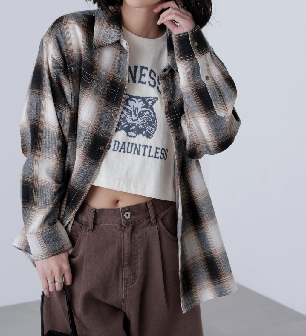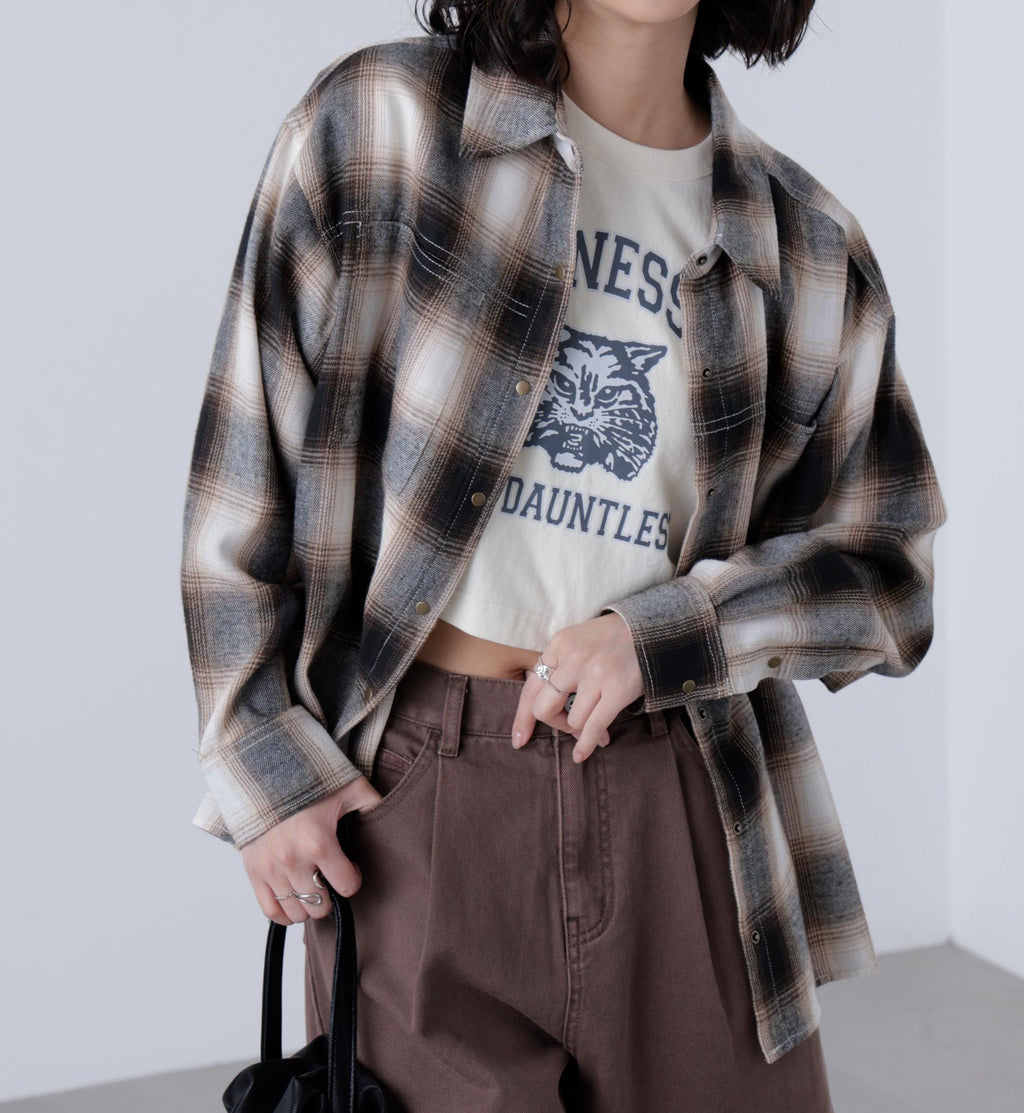 A looser shirt with a more modest silhouette than traditional over-shirts, while still maintaining a relaxed feel. It has a season-appropriate size that pairs well with pants styles. Features vintage-inspired antique gold-colored snap buttons and stitched detailing. For a casual look, pair with denim pants, or for a Y2K style, match with pleated skirts. In autumn, layering with a leather blazer creates a cute look. Made from soft material that feels good on the skin, it is easy to wear alone or as a layering piece, and also comfortable as an inner layer under outerwear. Available in suede-like beige and an on-blend check pattern in black and brown.