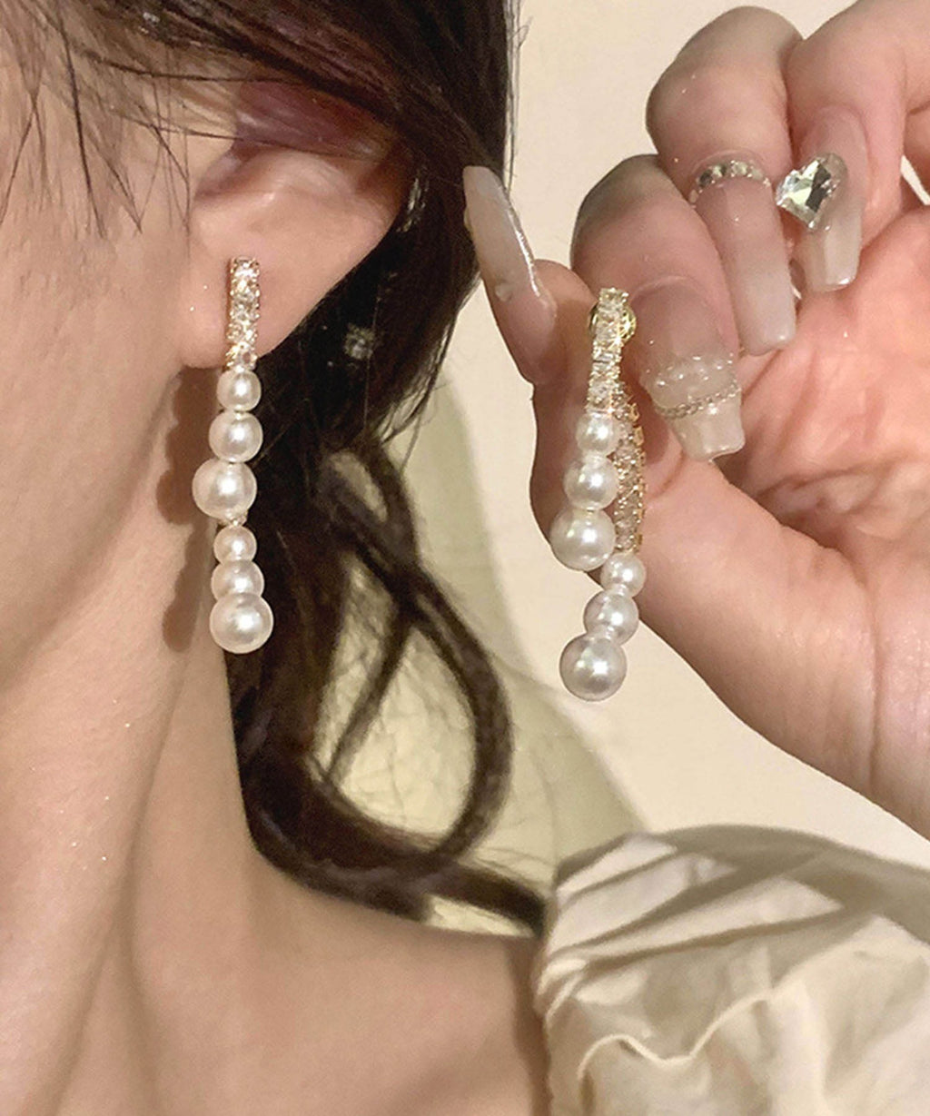 Pearls and stones of moderate size that sway and emit beautiful shine, creating a glamorous presence.
