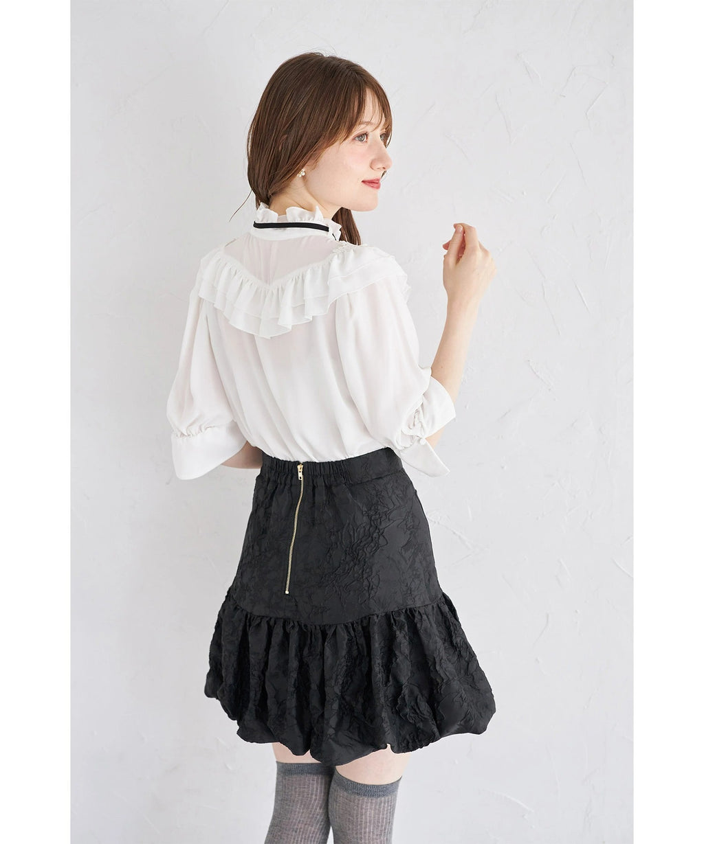 A fluffy balloon skirt made of a glossy, classical jacquard fabric that looks elegant and cute.