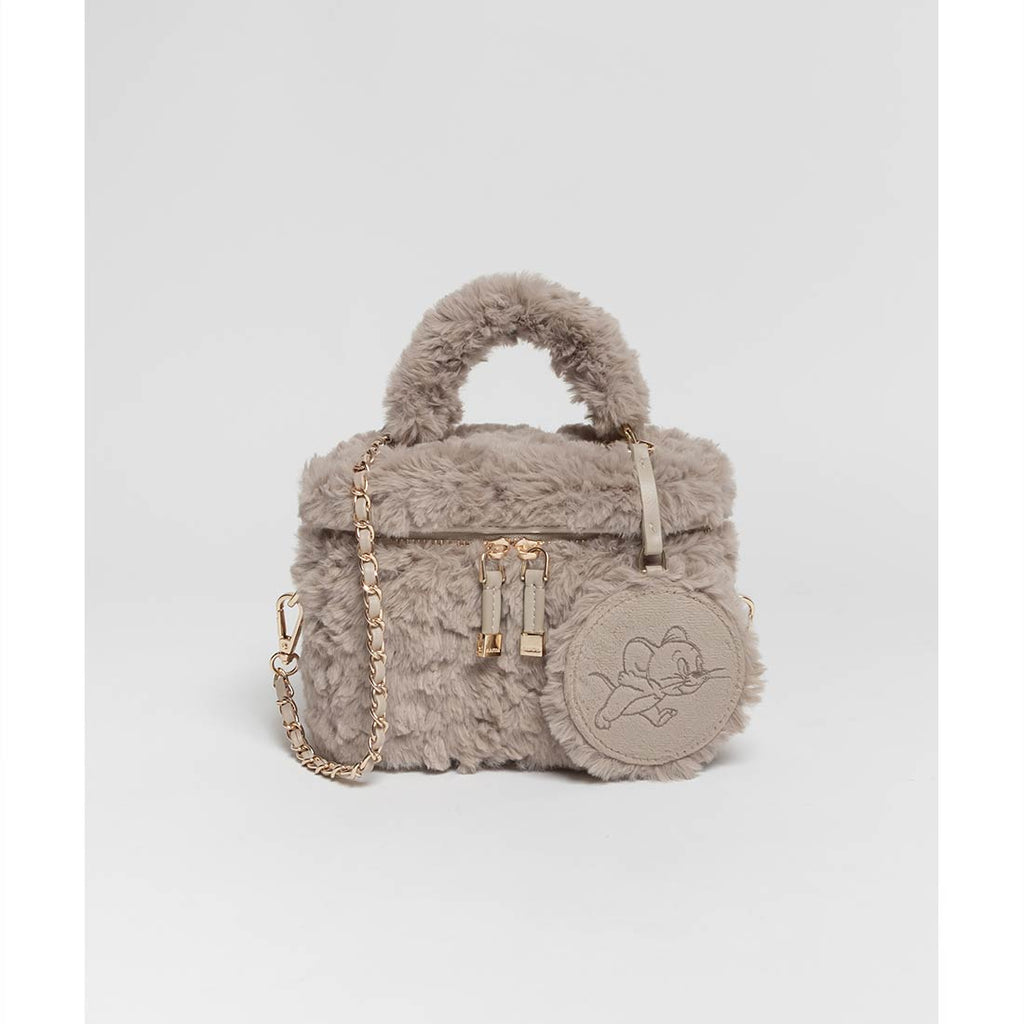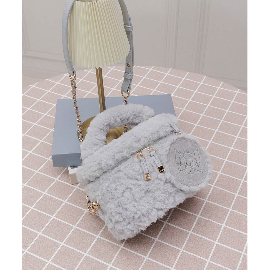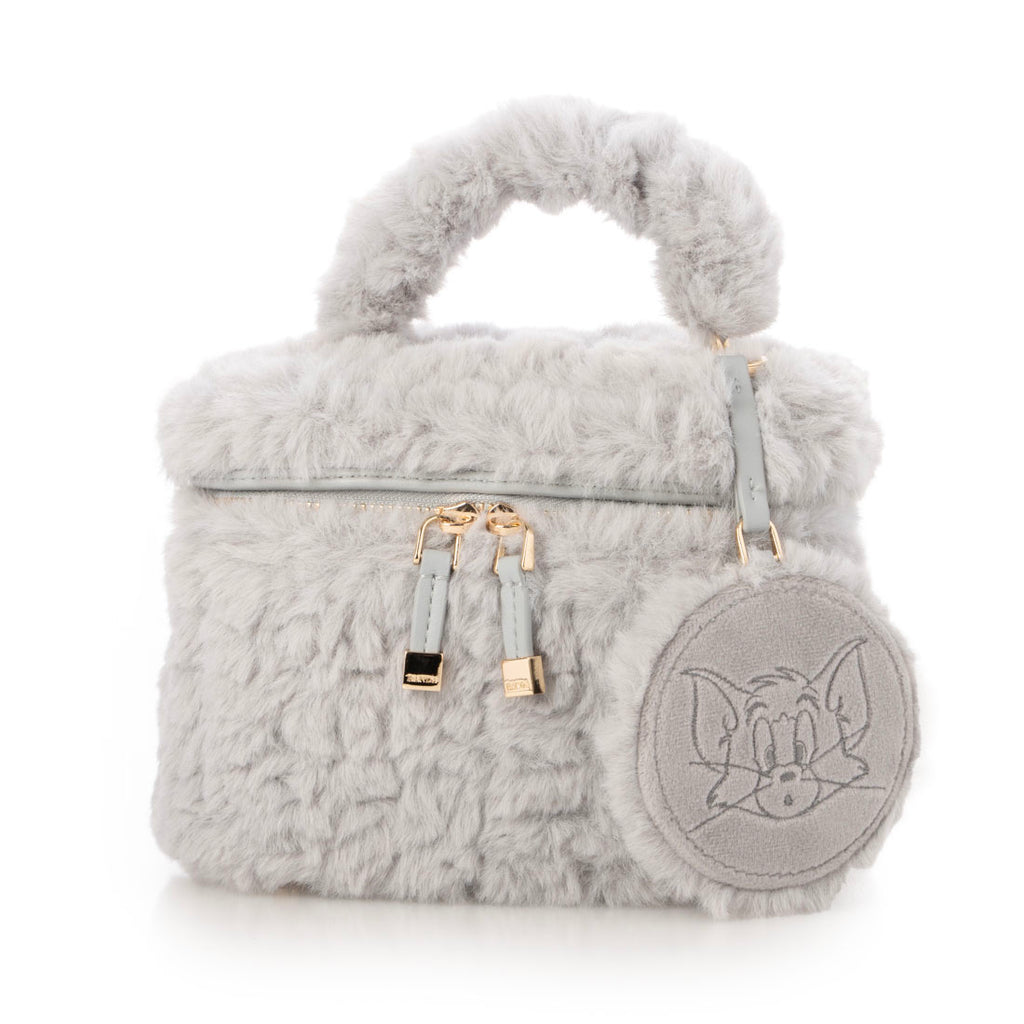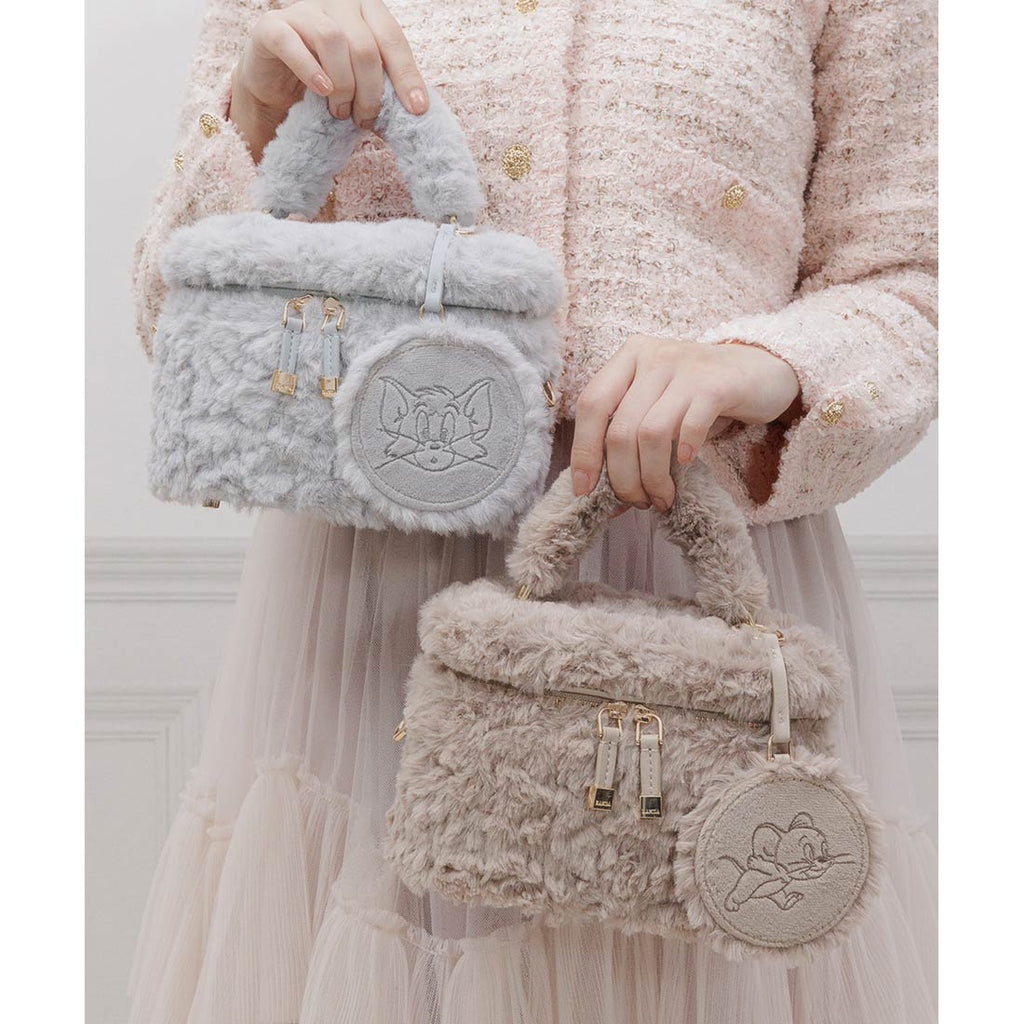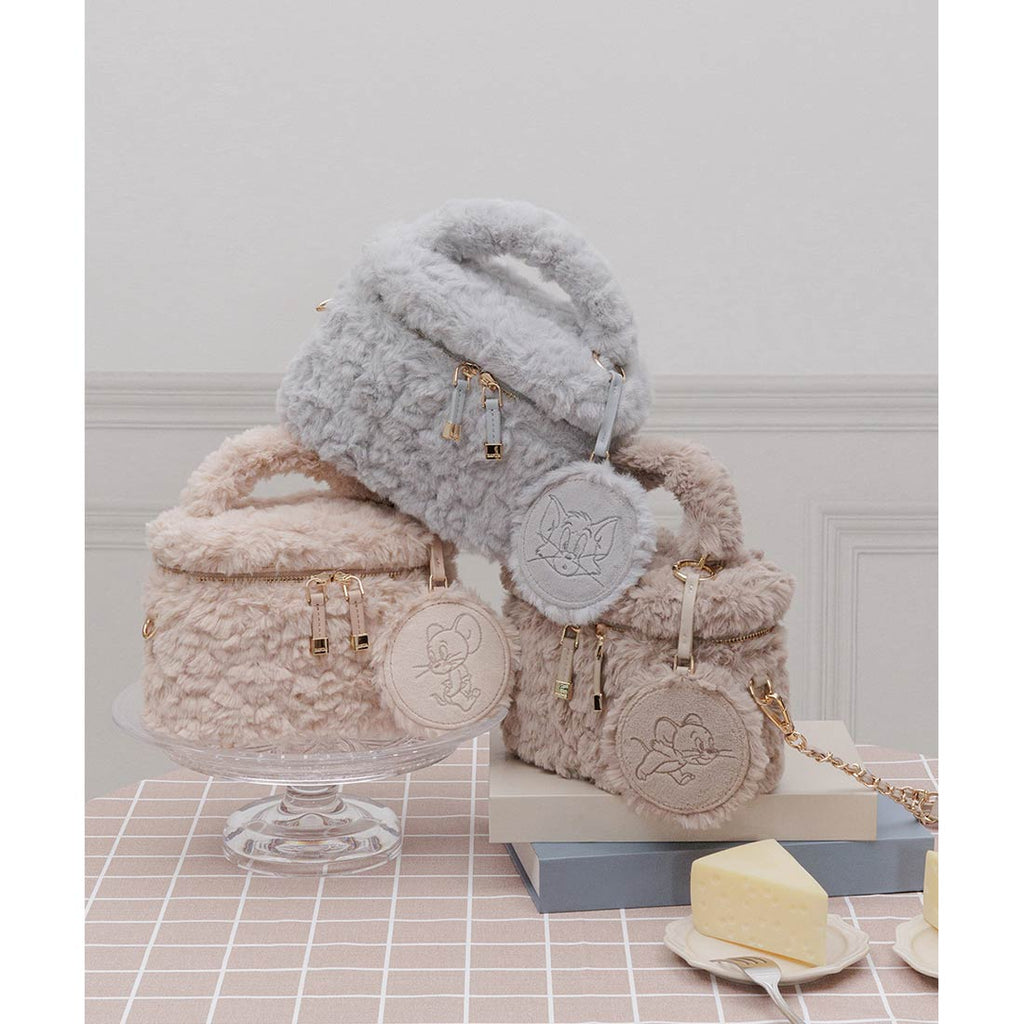 ・Tom is expressed with gray, Jerry with beige, and Tuffy with pink fluffy fur, all on a vanity bag