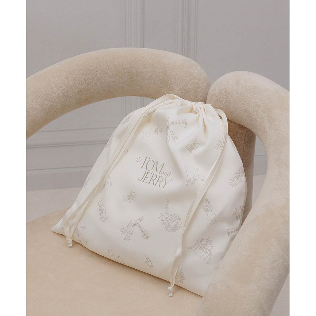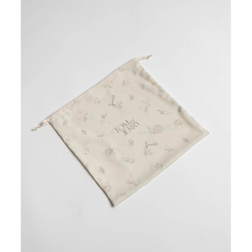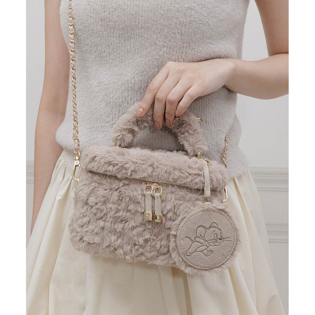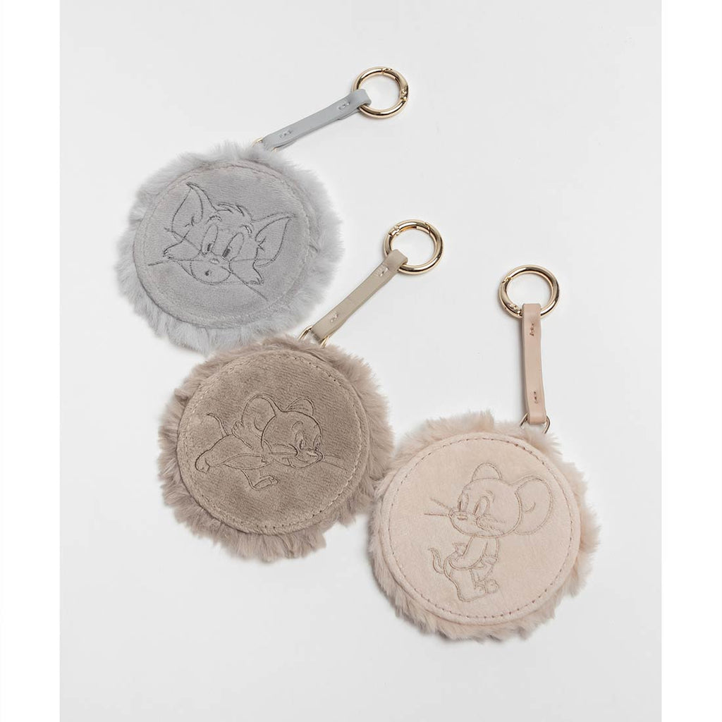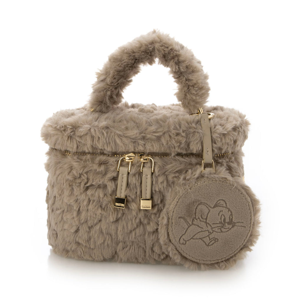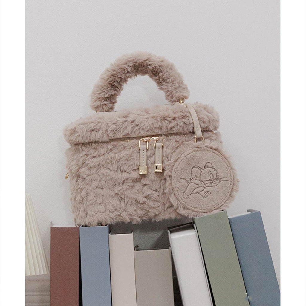 ・Tom is expressed with gray, Jerry with beige, and Tuffy with pink fluffy fur, all on a vanity bag