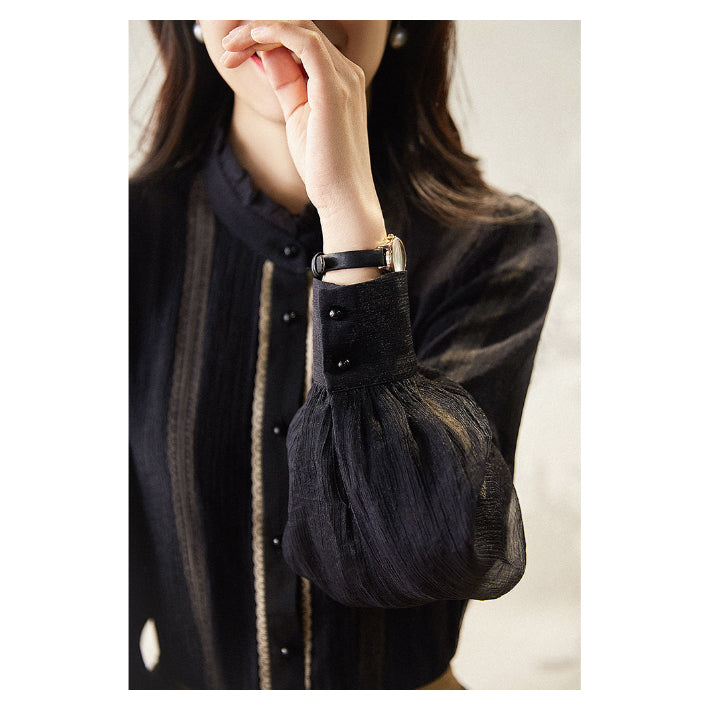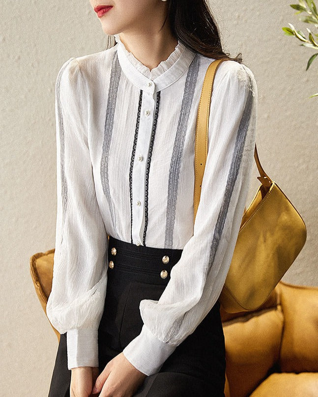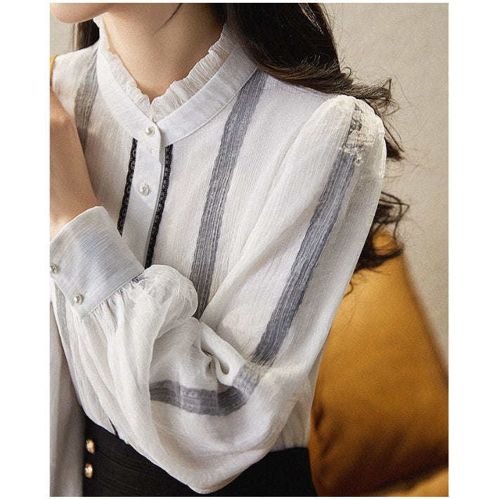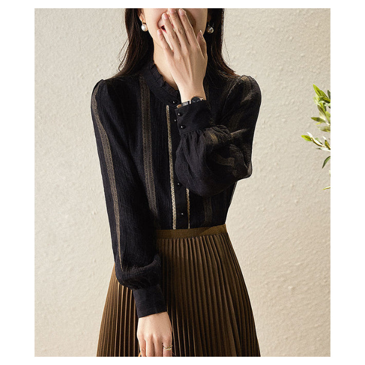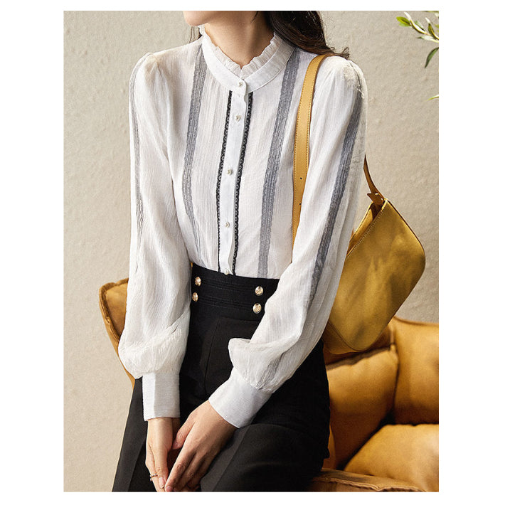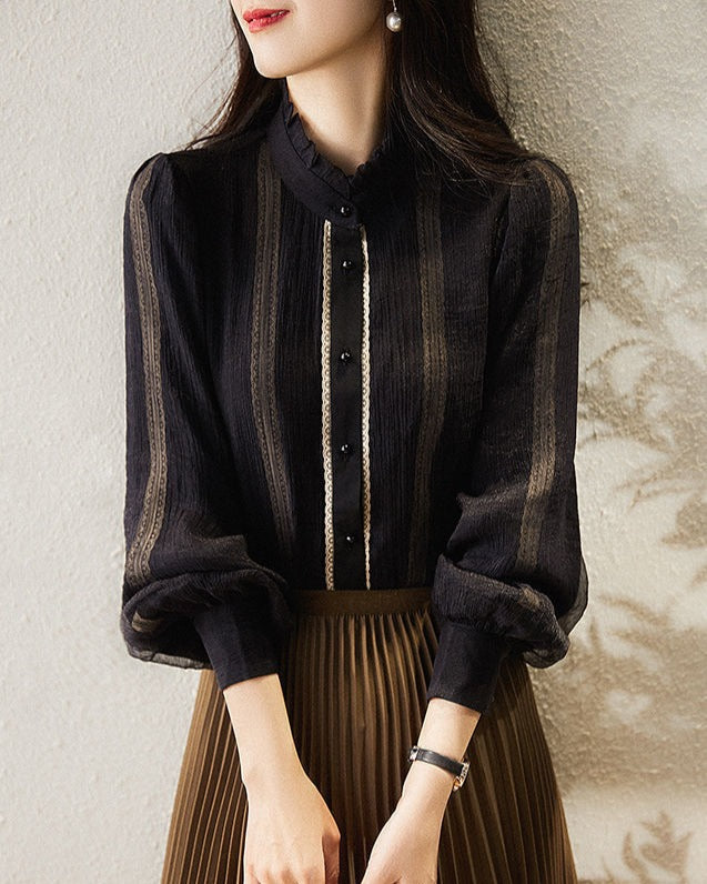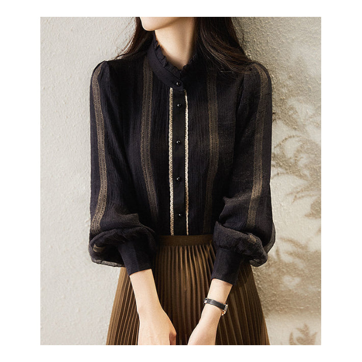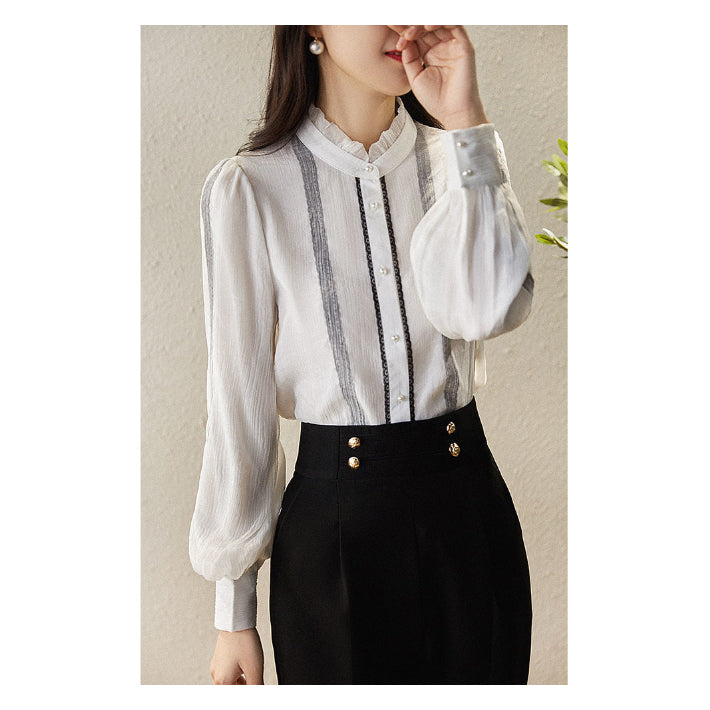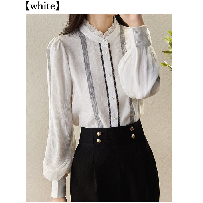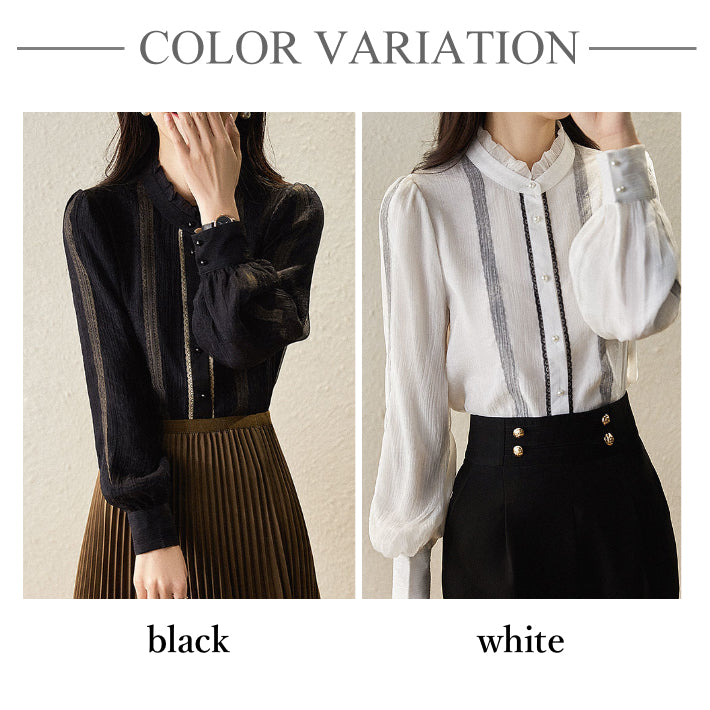 Lily of Valley high-neck frill chiffon blouse long-sleeve top elegant refined pure casual