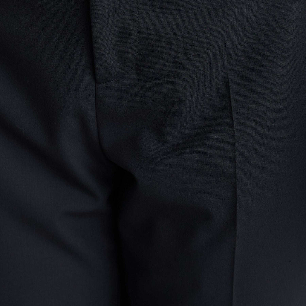 This is a stick pant characterized by a clean texture made from a material that uses fine wool mixed with other fibers.