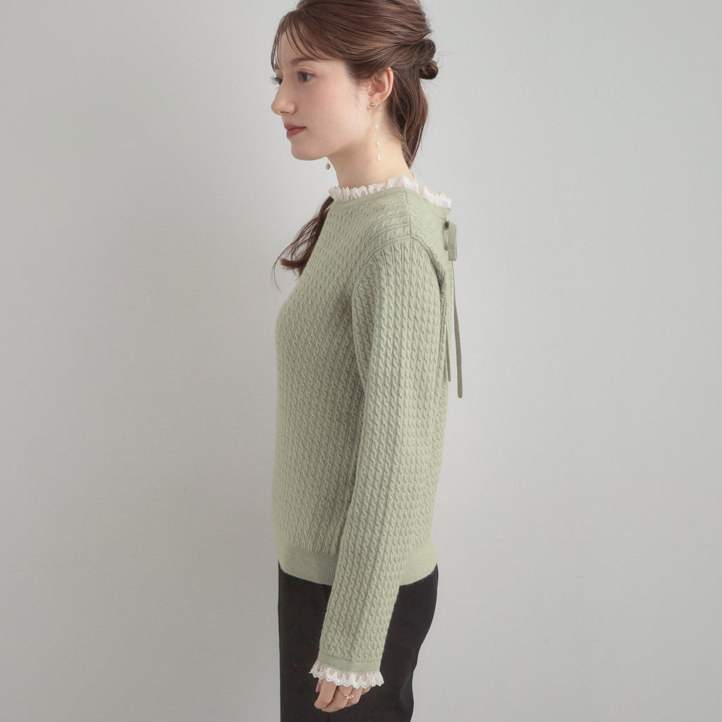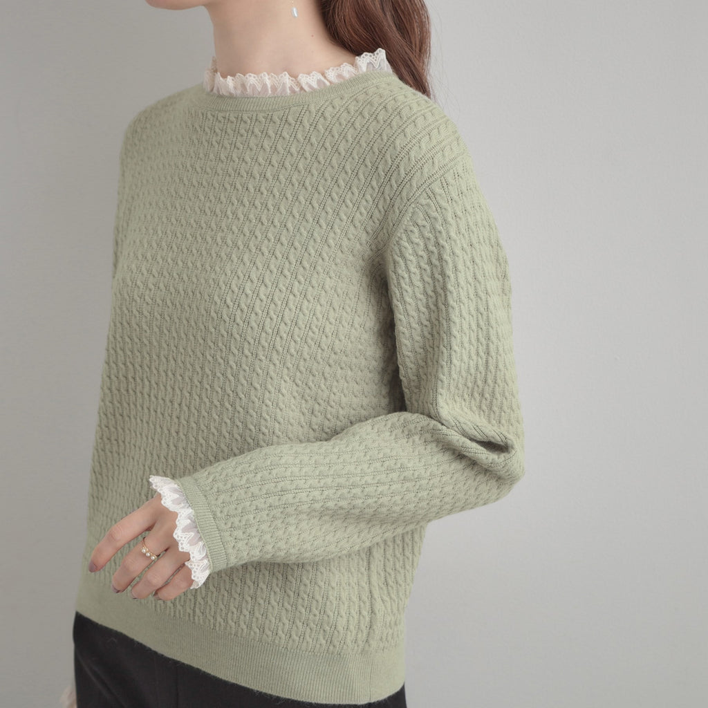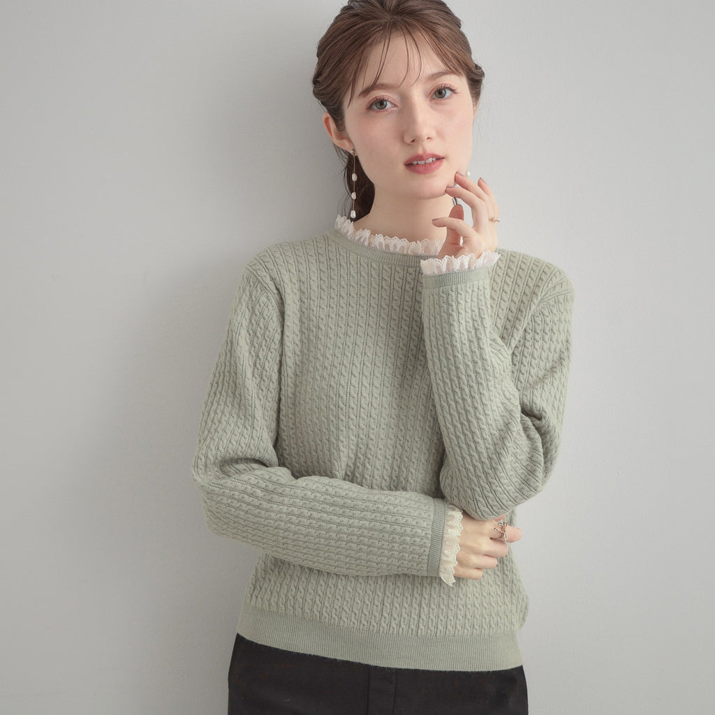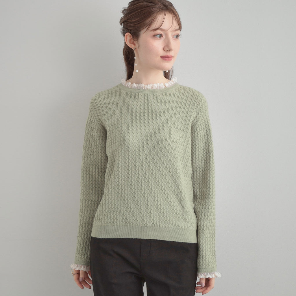 A fine cable knit top adorned with frills of embroidered tulle lace at the cuffs and collar.