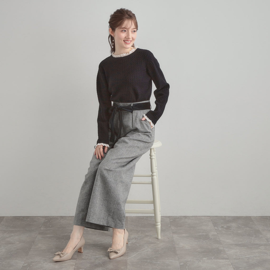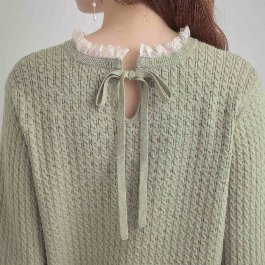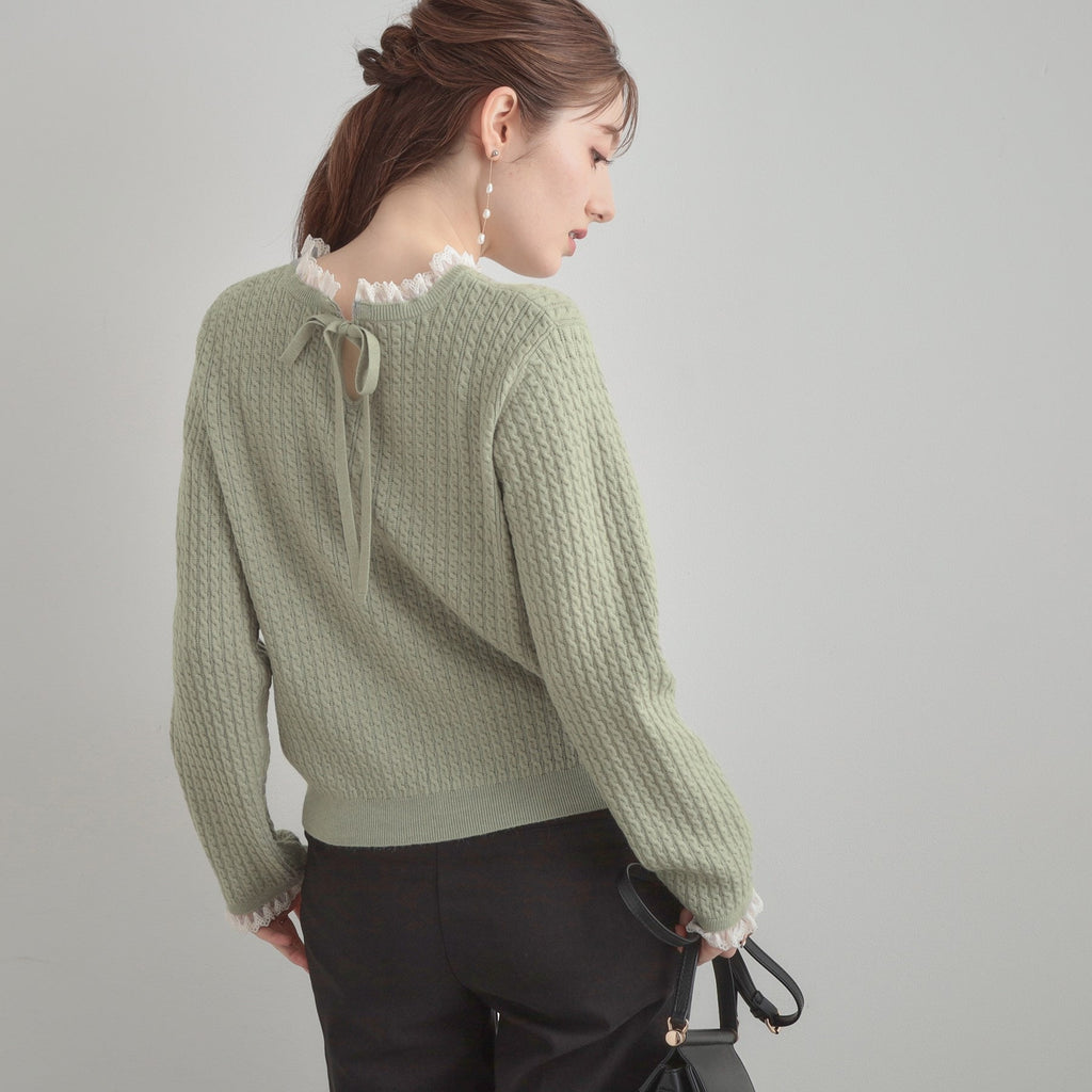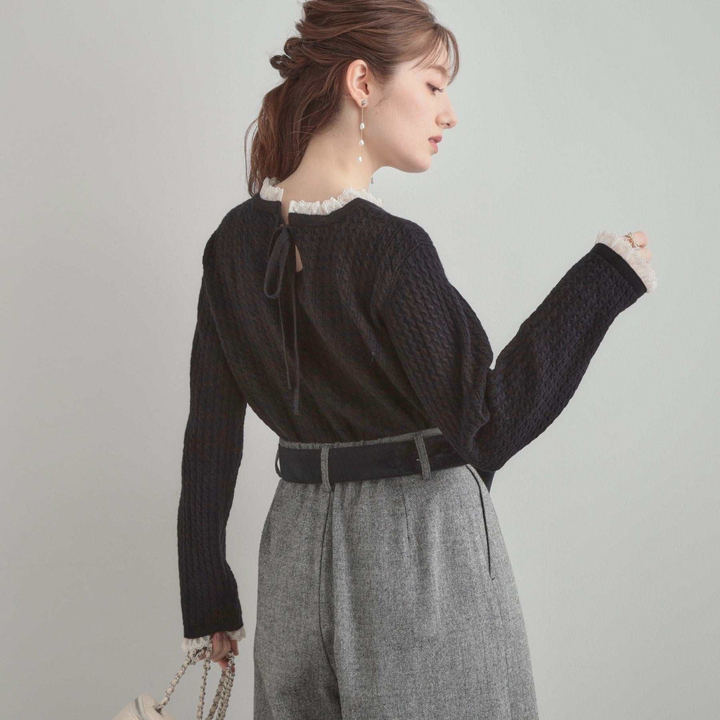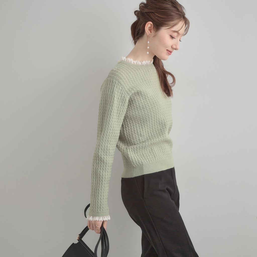 A fine cable knit top adorned with frills of embroidered tulle lace at the cuffs and collar.