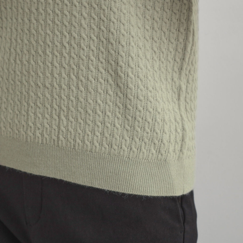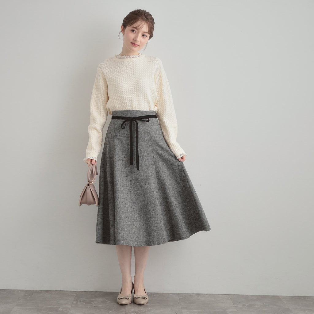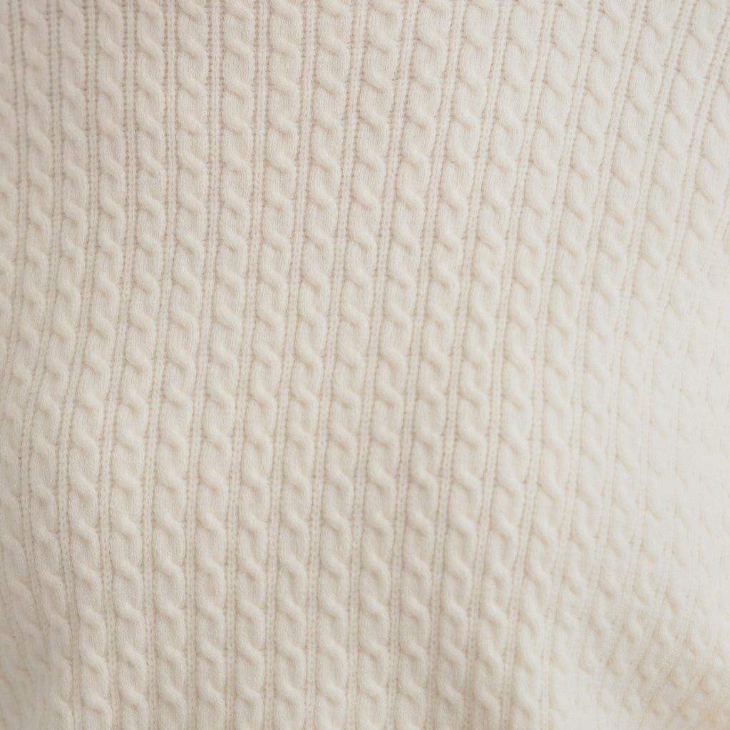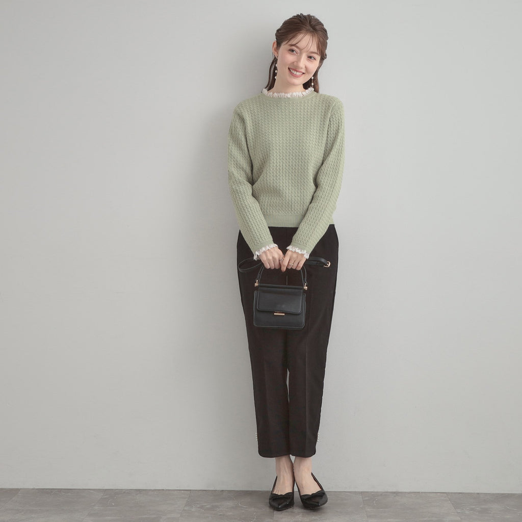 A fine cable knit top adorned with frills of embroidered tulle lace at the cuffs and collar.