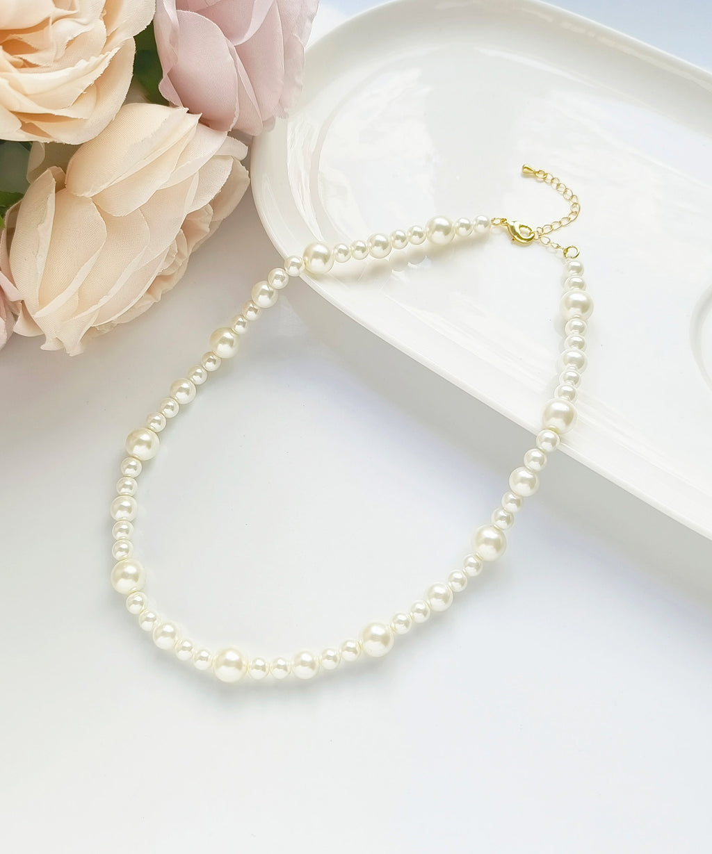 This is a short pearl necklace with large, medium, and small pearls arranged in the same balance.