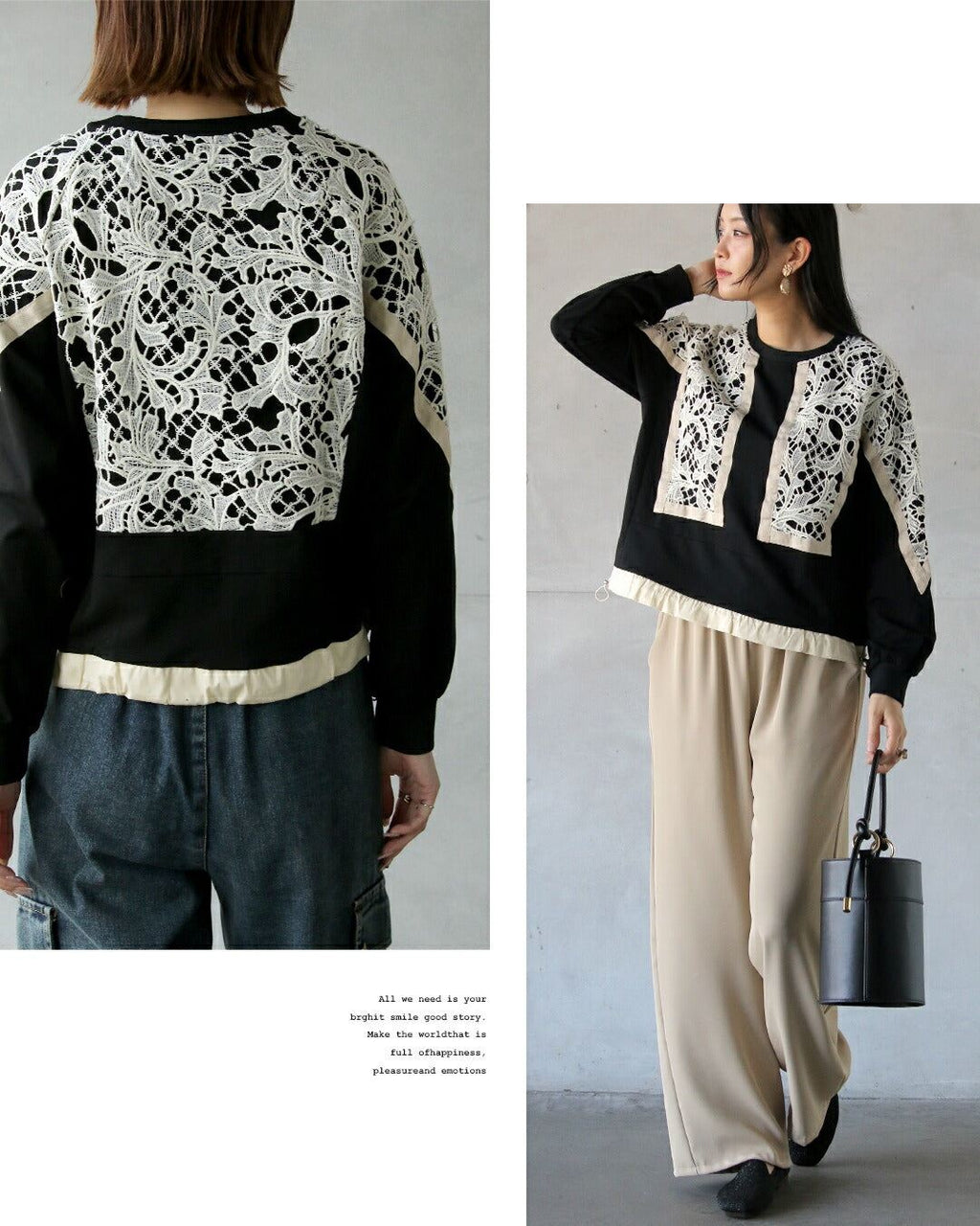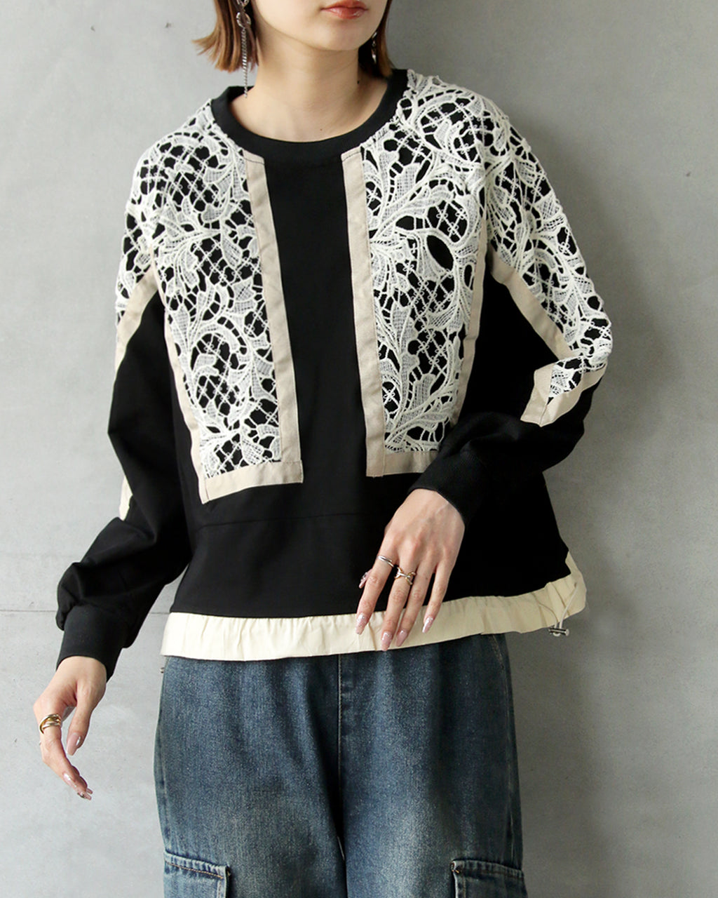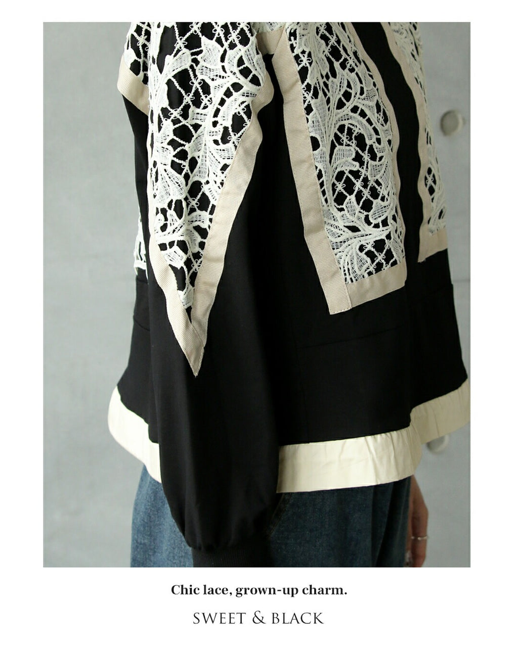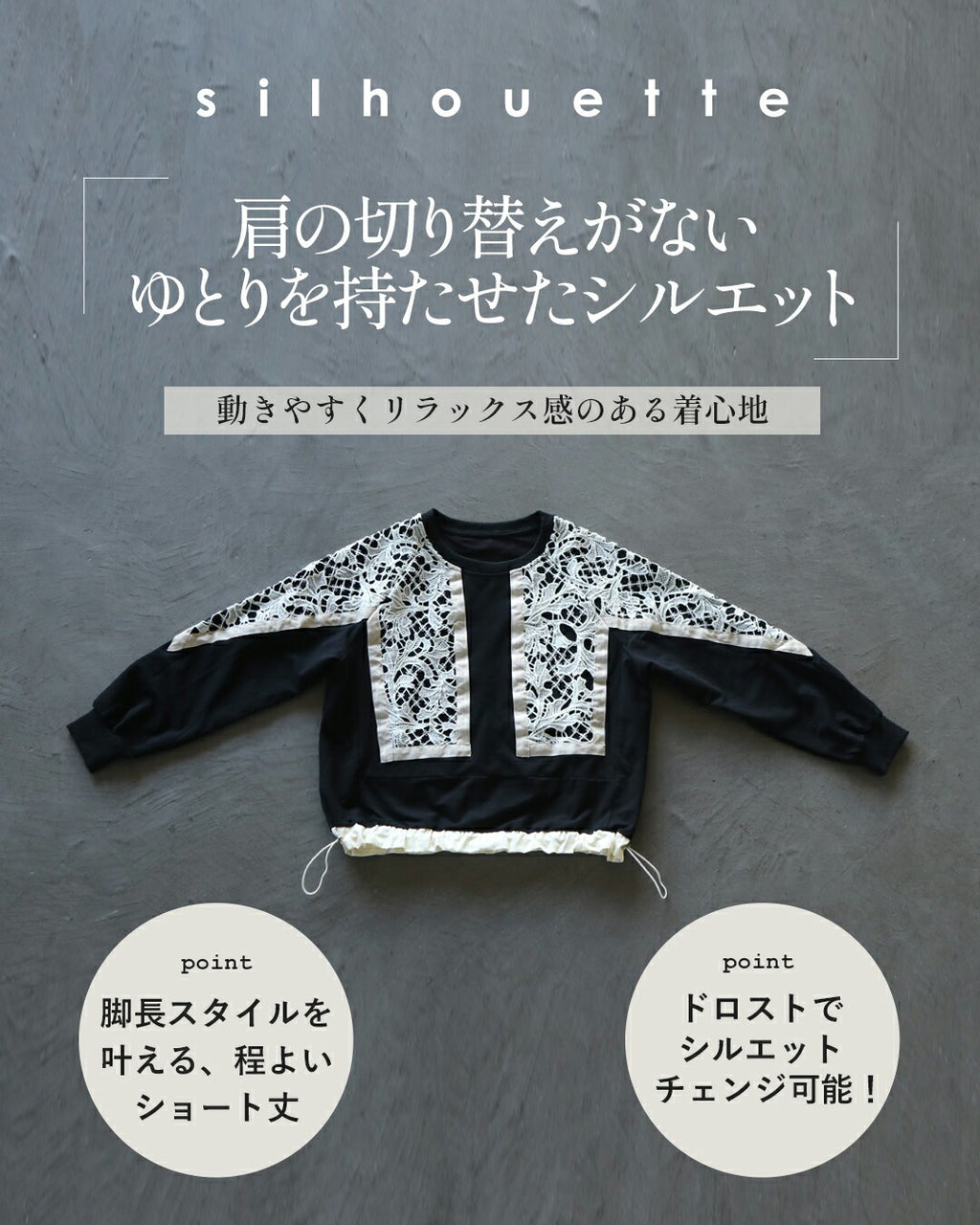 A top with a bold lace design from the front to the sleeves, reminiscent of stained glass. By using black as the BASE and highlighting it with an Ivory trim, it creates a contrast that exudes a sophisticated adult mode. It adds a touch of elegance to the simplicity. The silhouette can be freely adjusted with a drawstring.