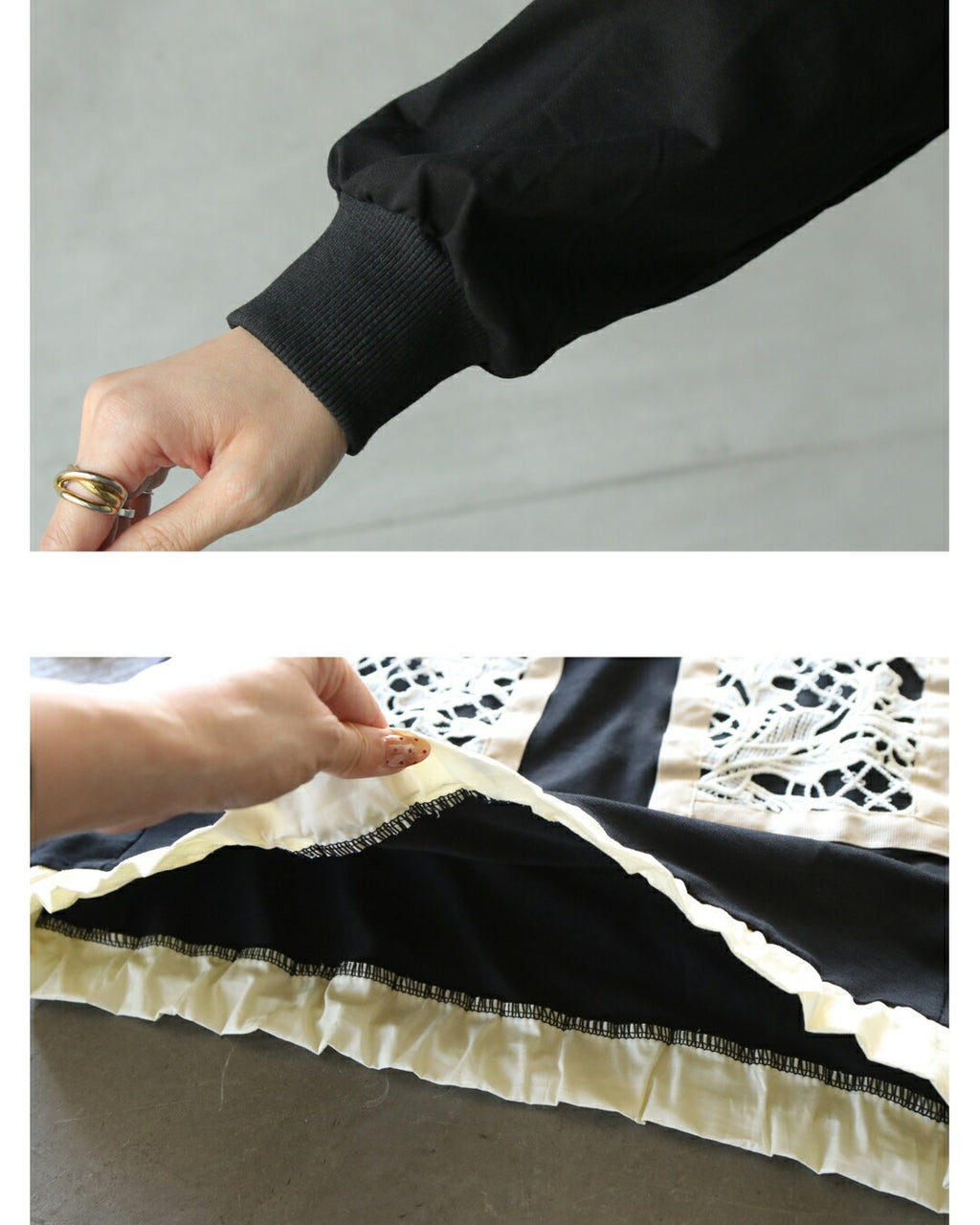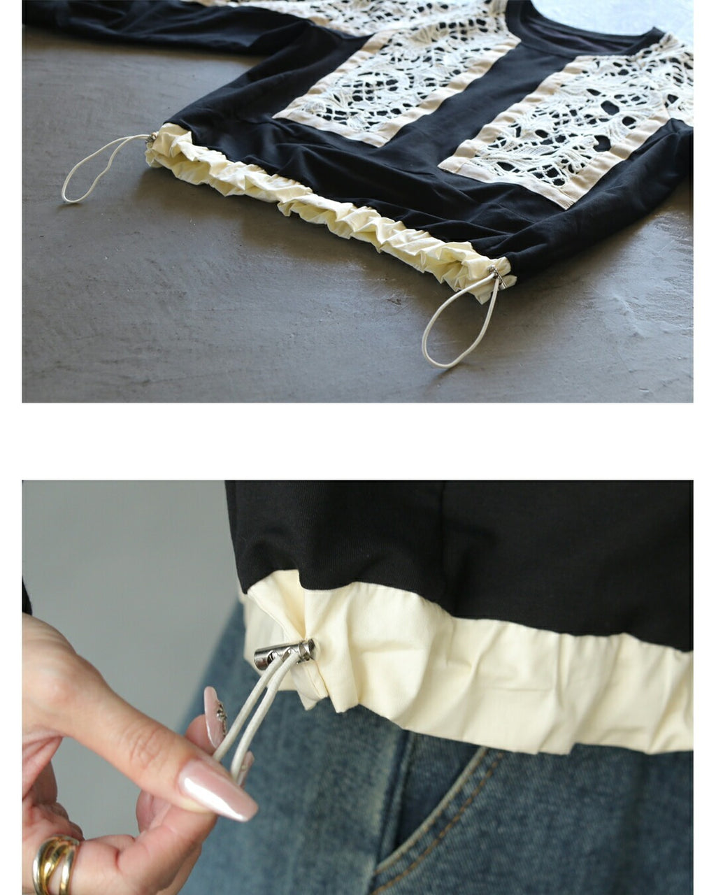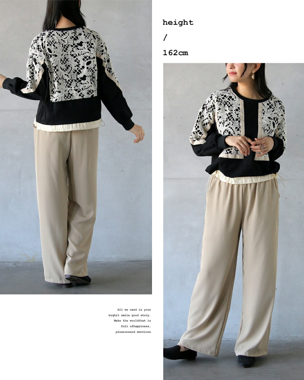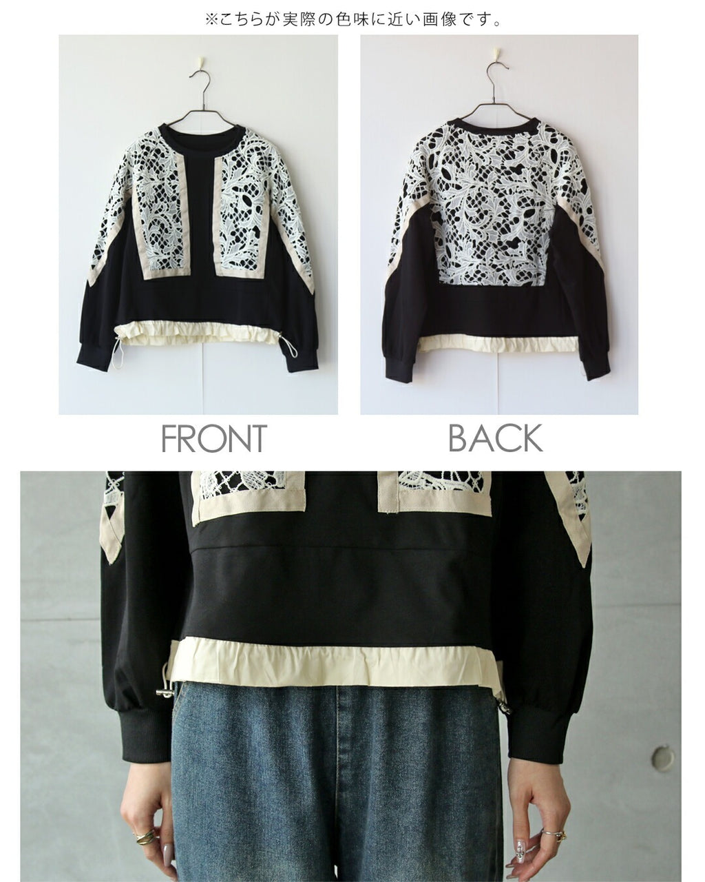 A top with a bold lace design from the front to the sleeves, reminiscent of stained glass. By using black as the BASE and highlighting it with an Ivory trim, it creates a contrast that exudes a sophisticated adult mode. It adds a touch of elegance to the simplicity. The silhouette can be freely adjusted with a drawstring.