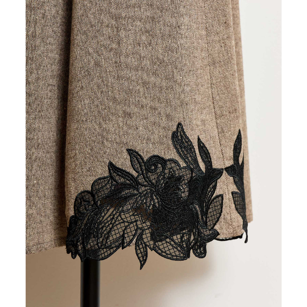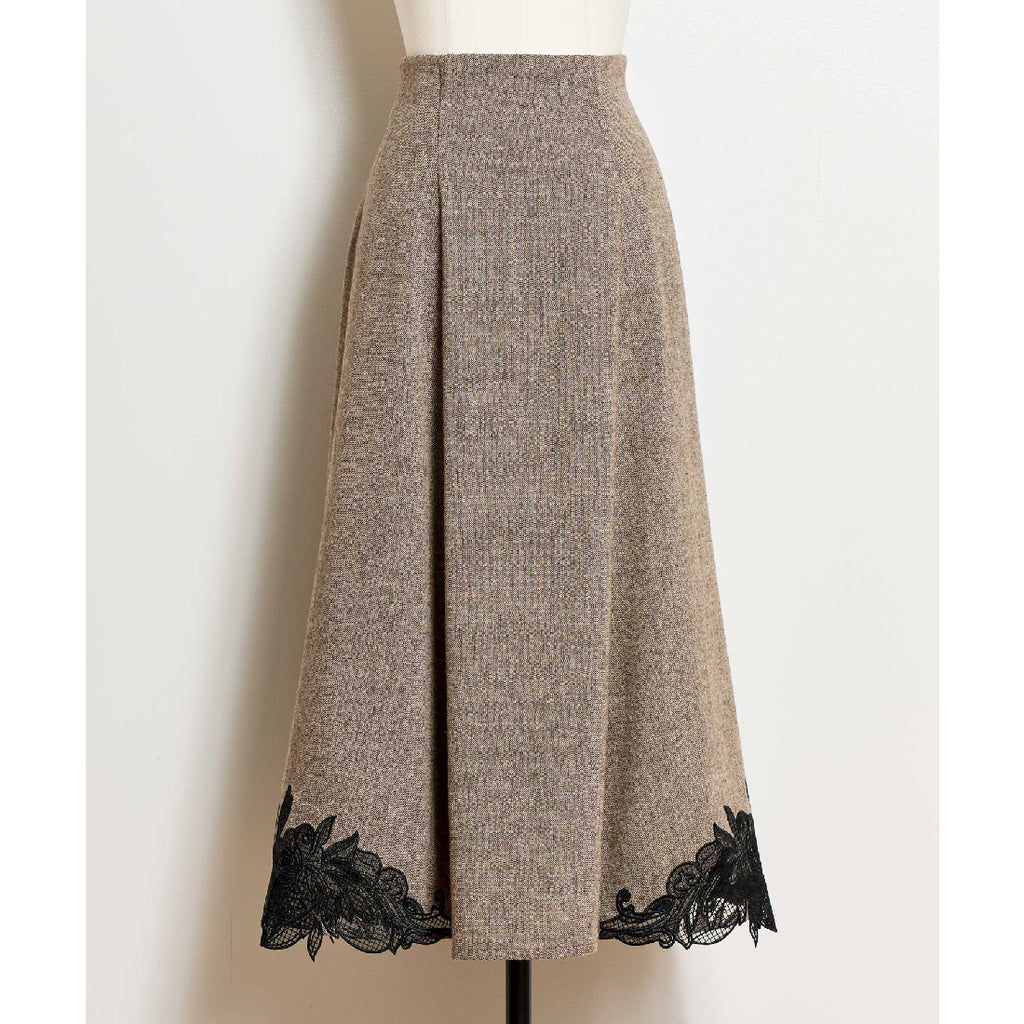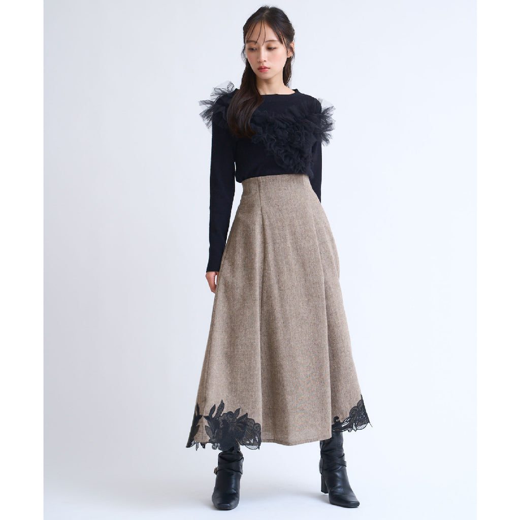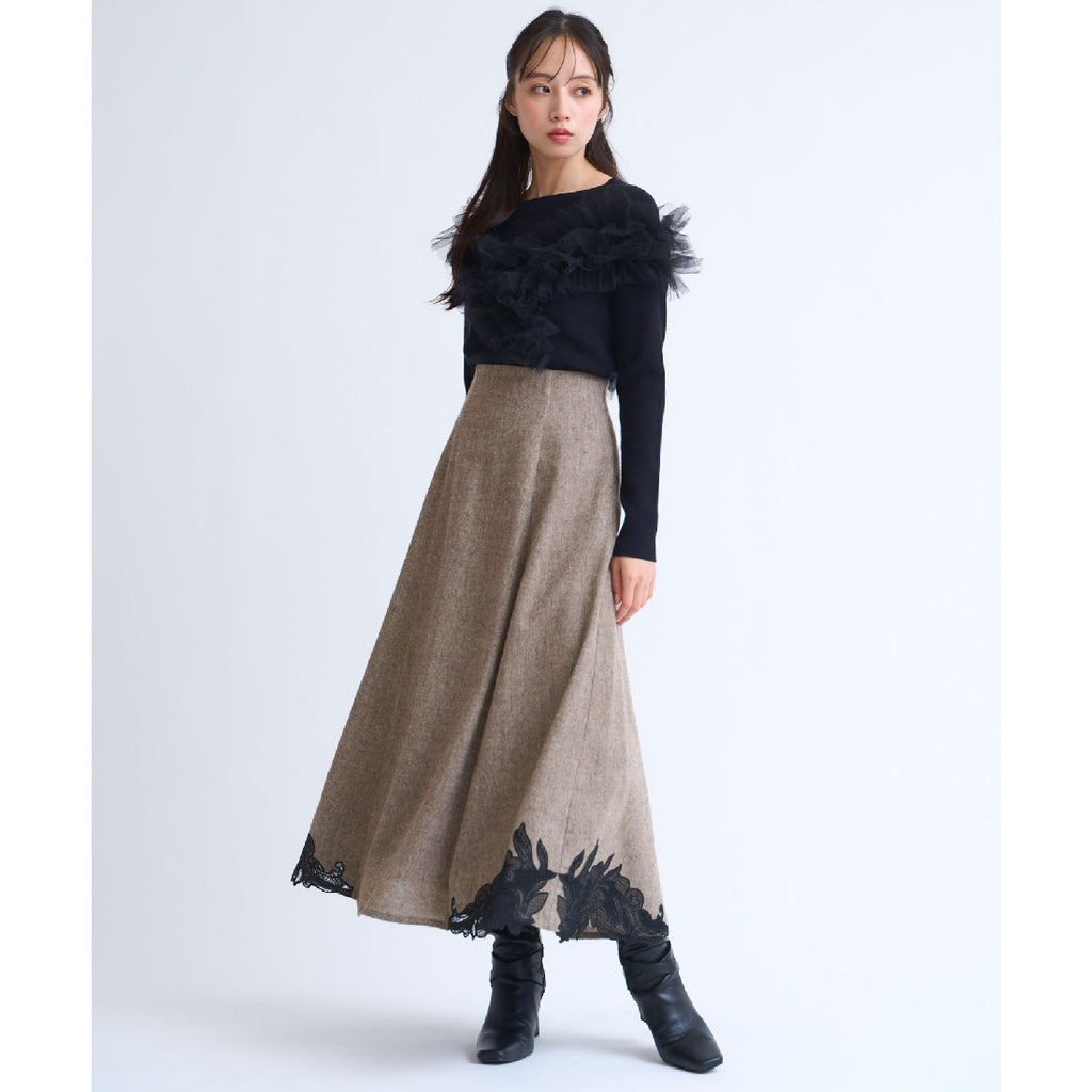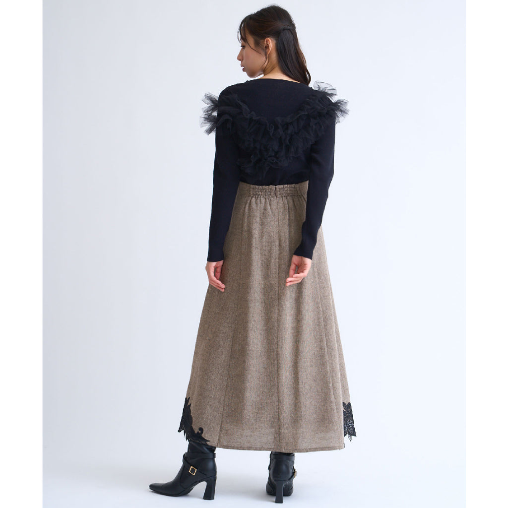 A tweed-like skirt finished with original embroidery, incorporating tulle.