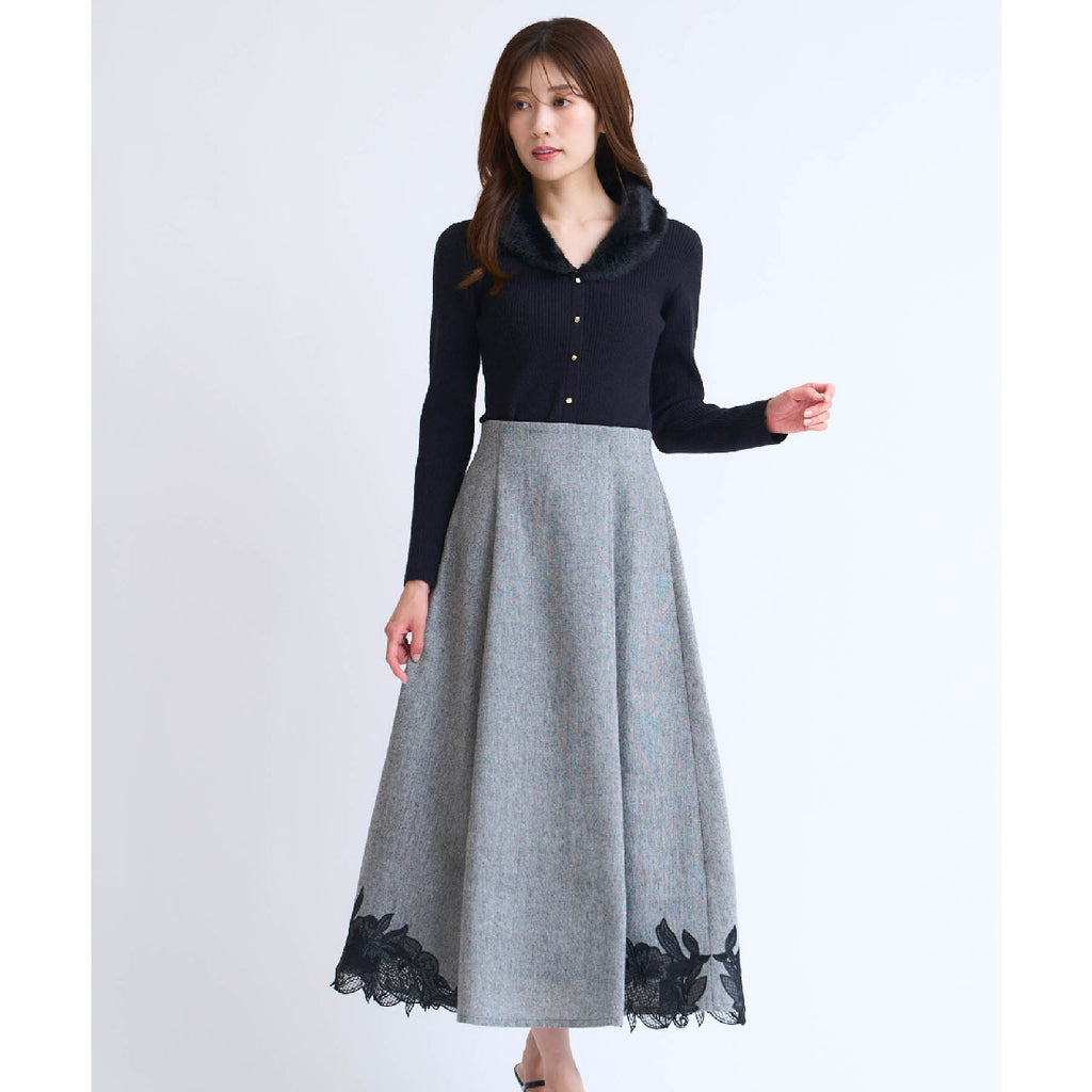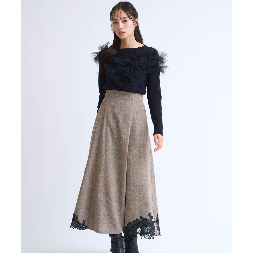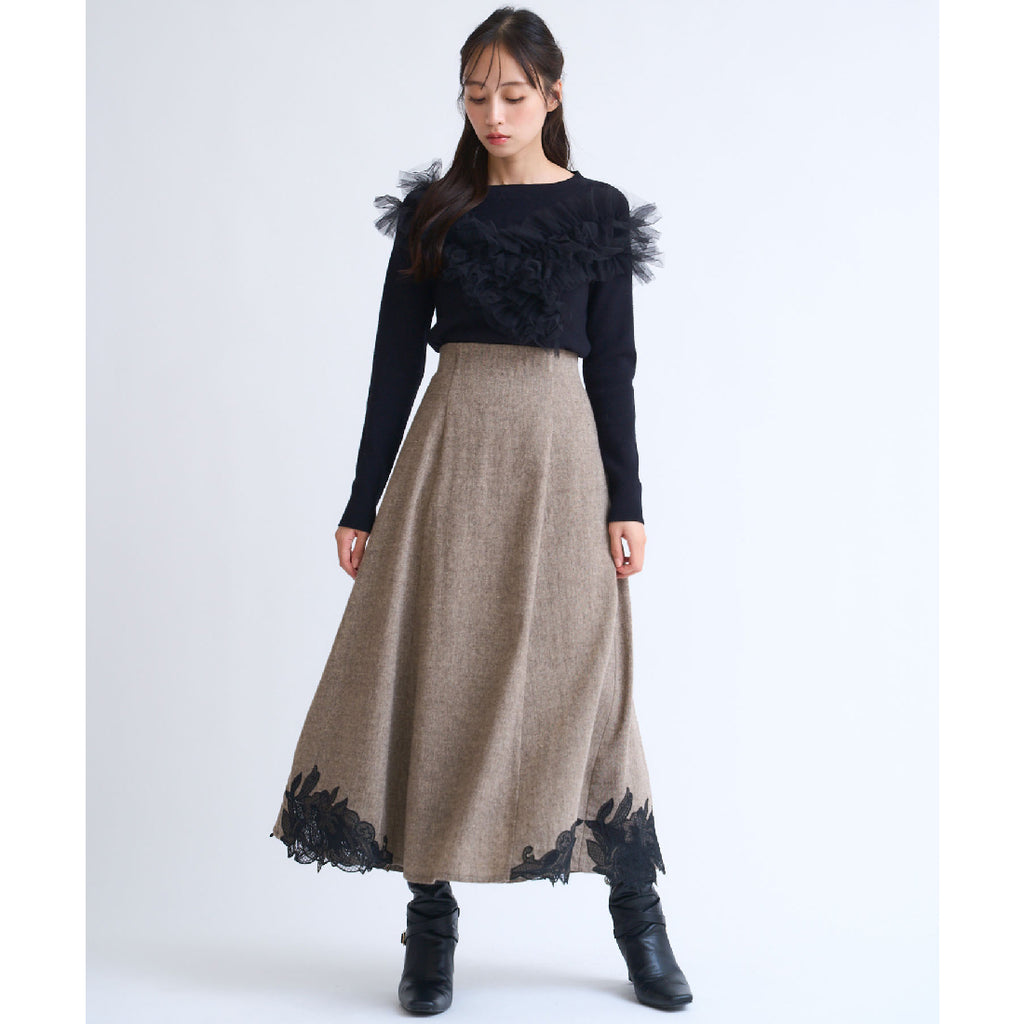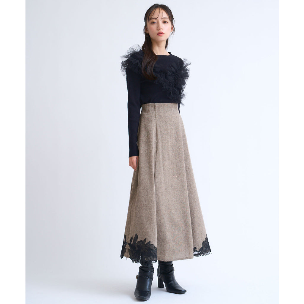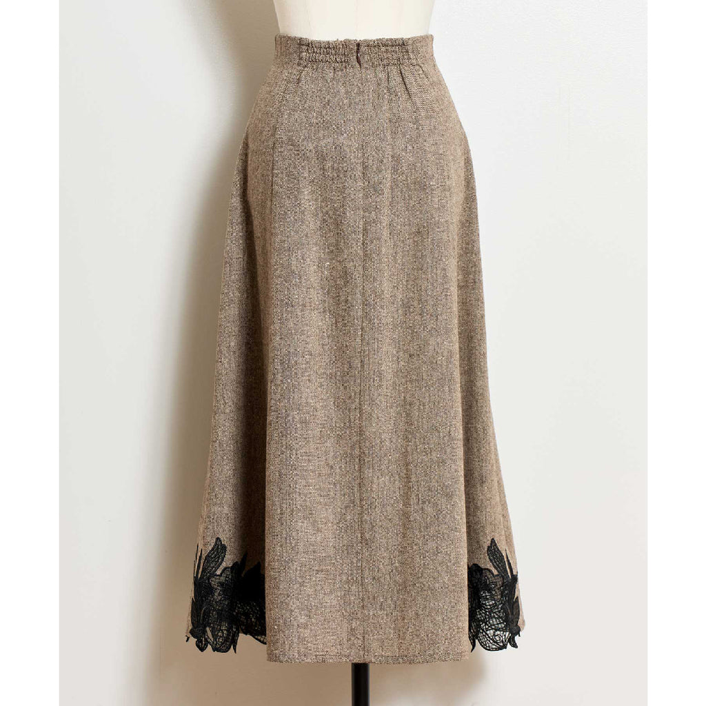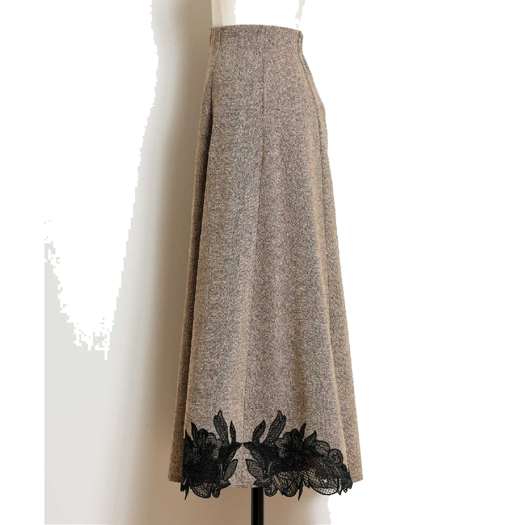 A tweed-like skirt finished with original embroidery, incorporating tulle.