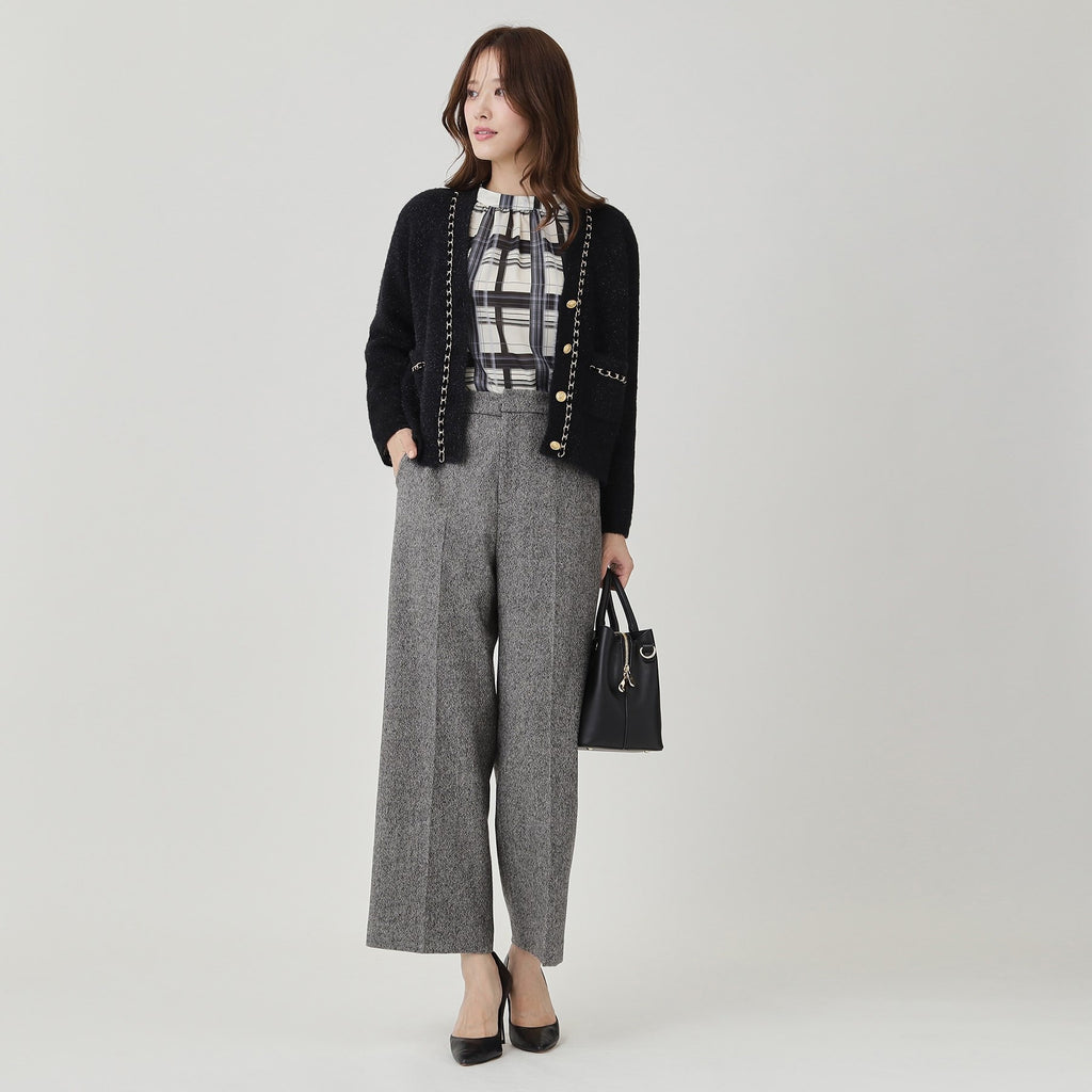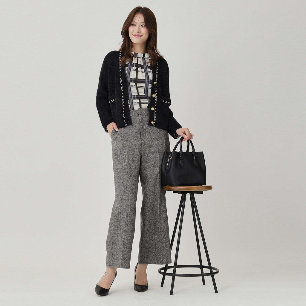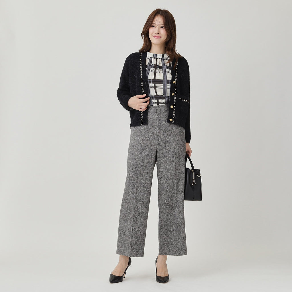 This is a pair of pants made from tweed material with a subtle sparkle mixed with wool.
