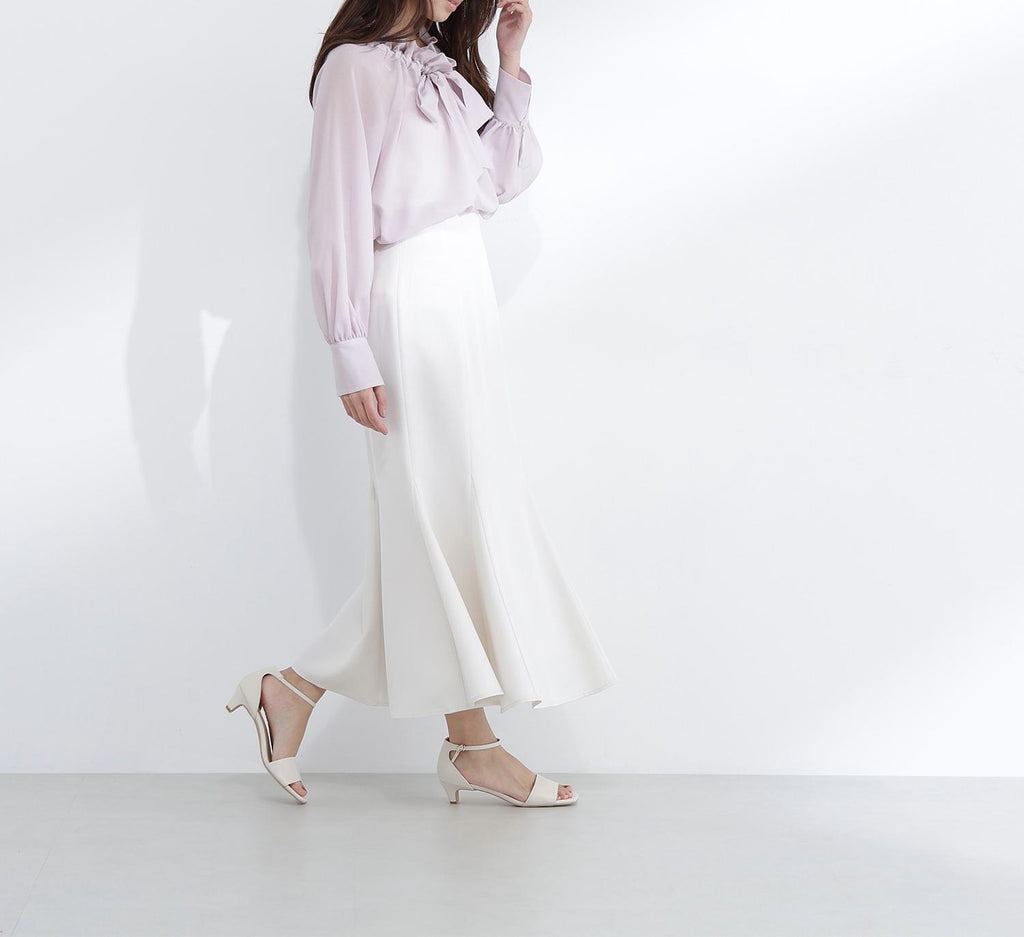 A bow tie blouse made of sheer material that can be worn in two ways, front and back. When the bow tie is in front, it gives a glamorous look, and when worn at the back, it presents a neat impression. The material has a moderate transparency that is light and adds a feminine touch. The design can be styled both elegantly and casually.
