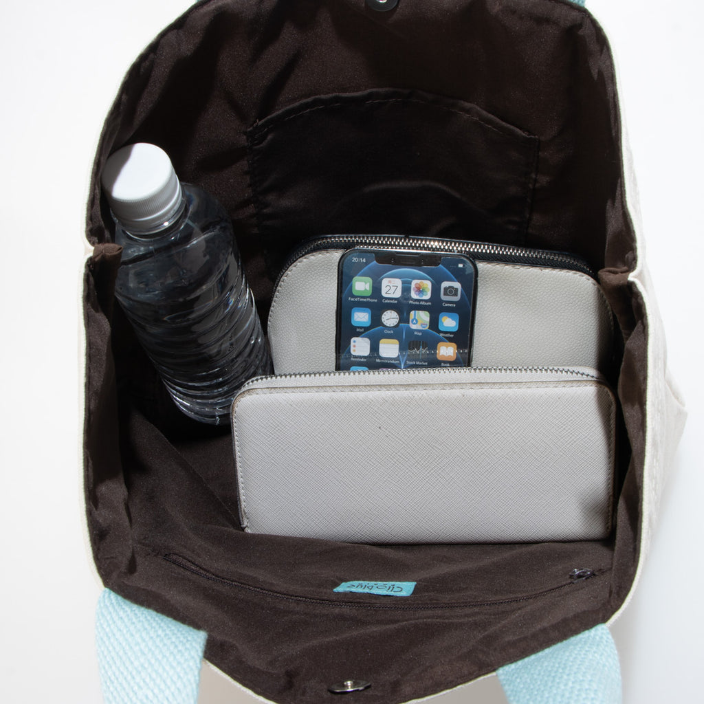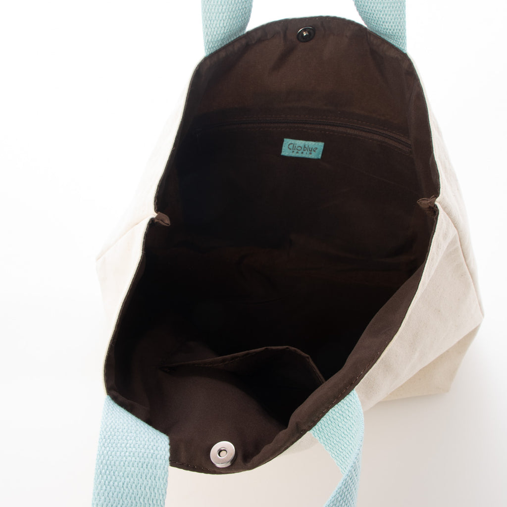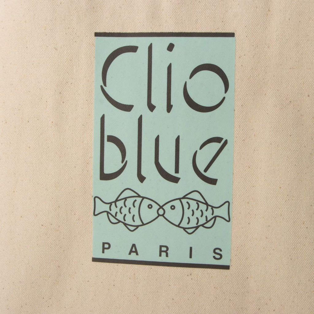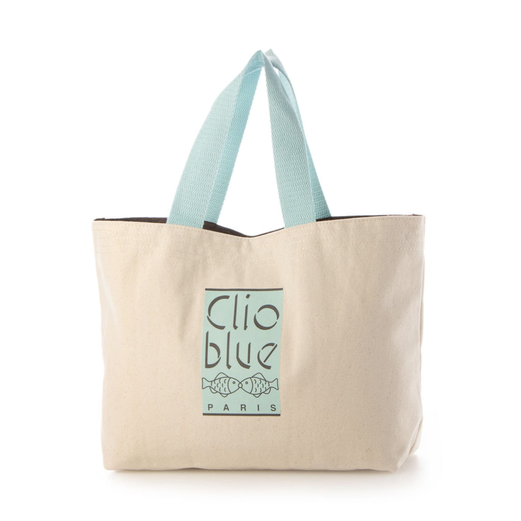 This is a cute tote bag with the Clio blue logo printed on the front.