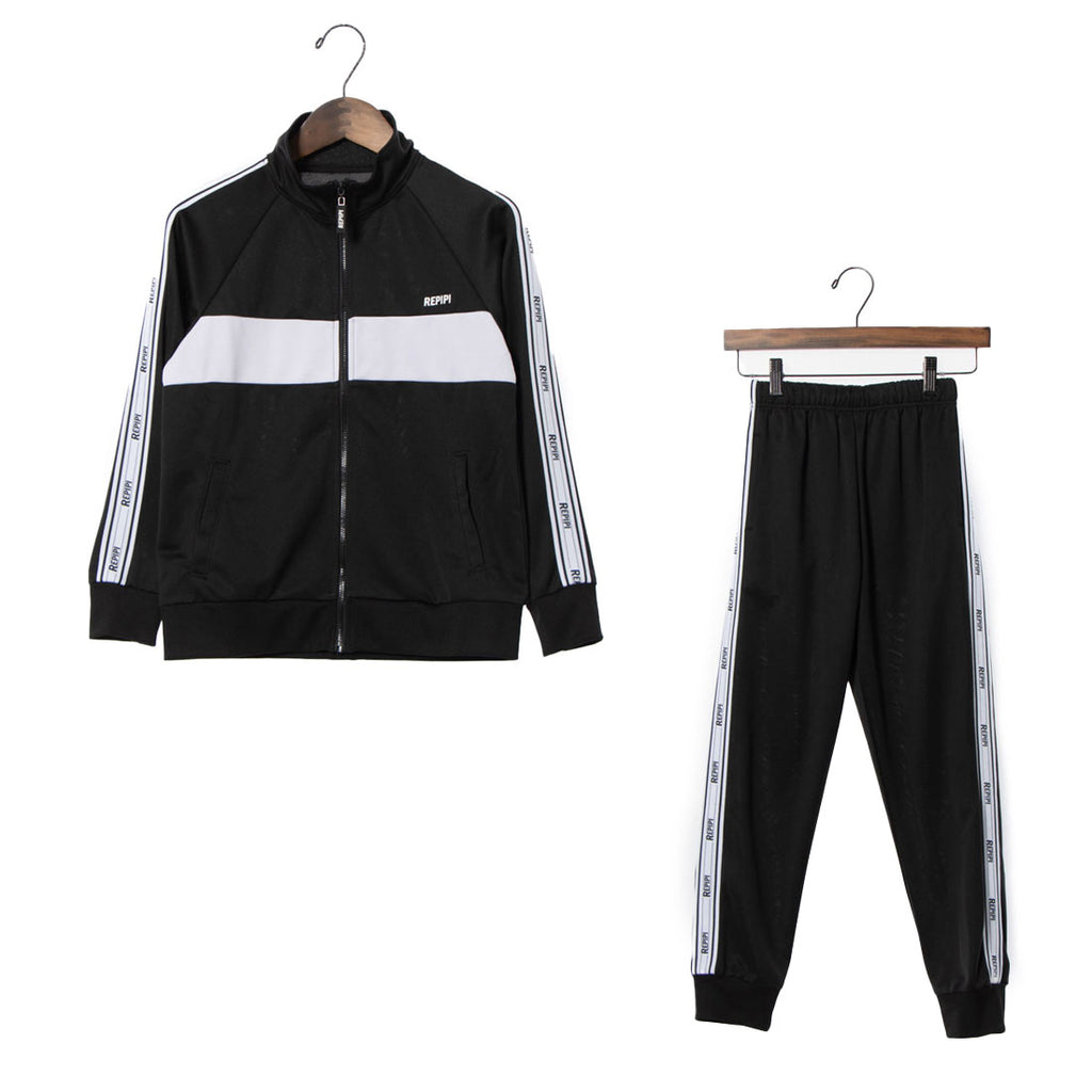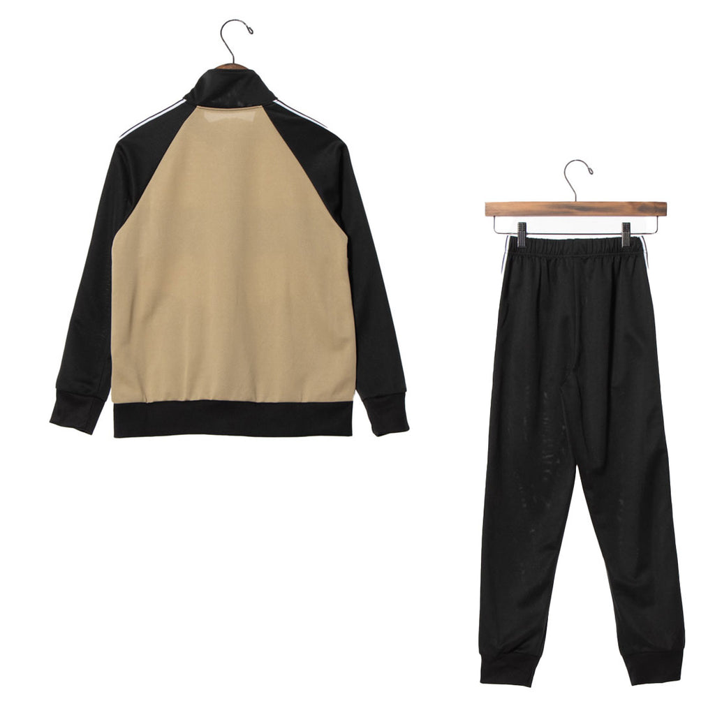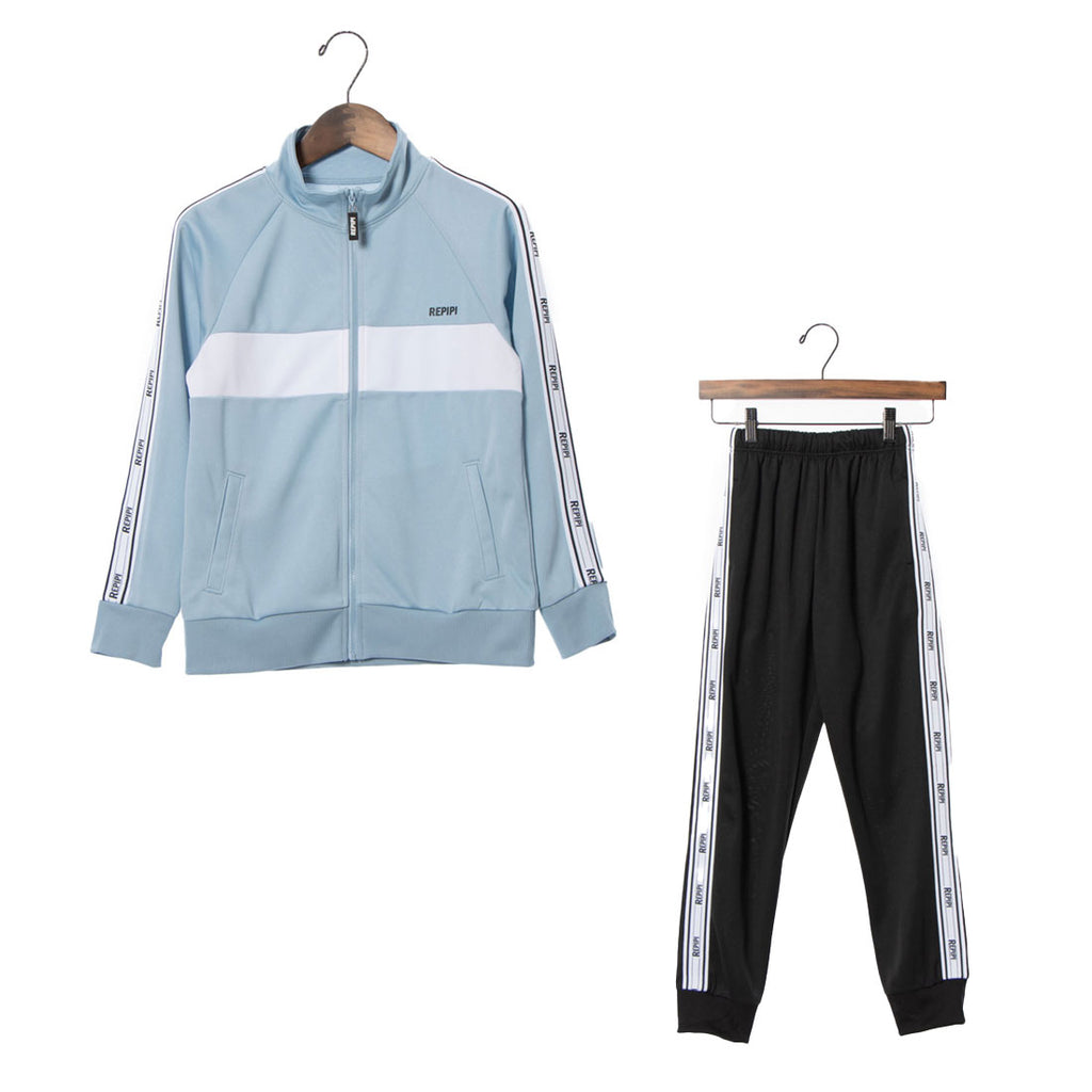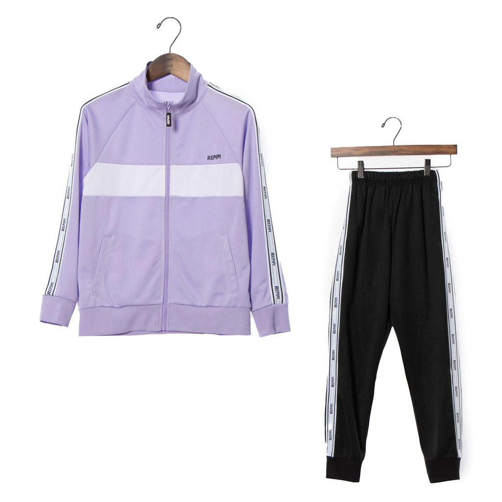 A tracksuit set with a relaxed fit and soft, flexible fabric is the key feature.