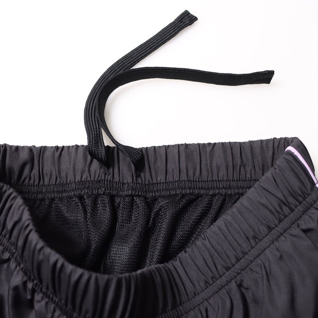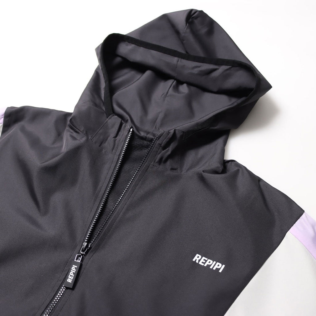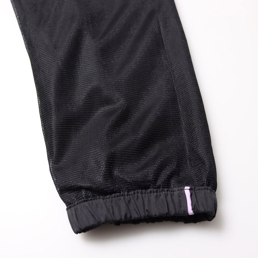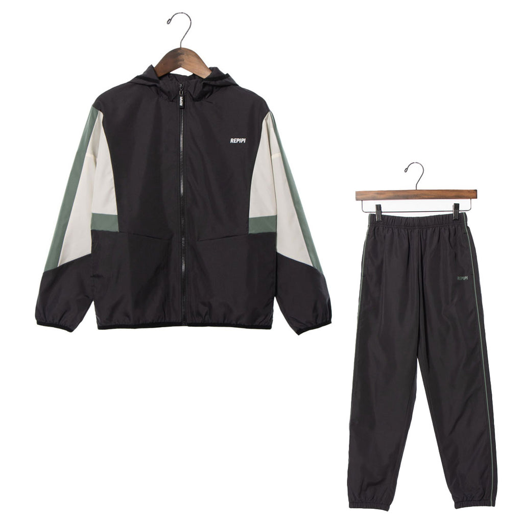 The set item consisting of a thin and lightweight polyester hoodie and pants features a mesh lining, making it less likely to stick to the skin even when sweating, and is recommended for sports.