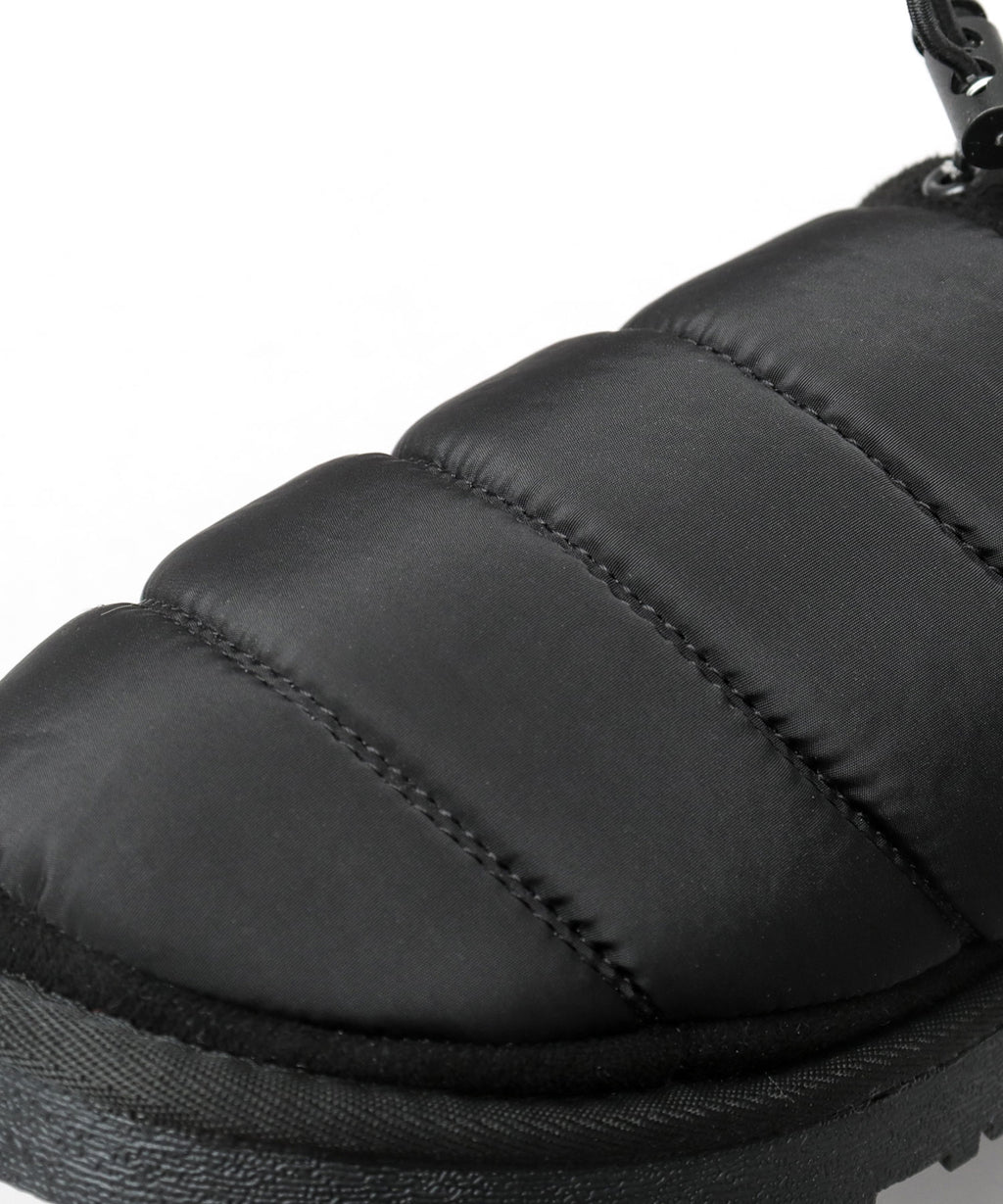 A pair of clog sandals featuring a combination of fluffy padded upper with soft fur material, highlighting a material mix that deepens the autumn and winter seasonal mood.