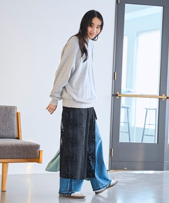 The baggy silhouette with a style-up effect subtly covers the silhouette of the hips and legs.