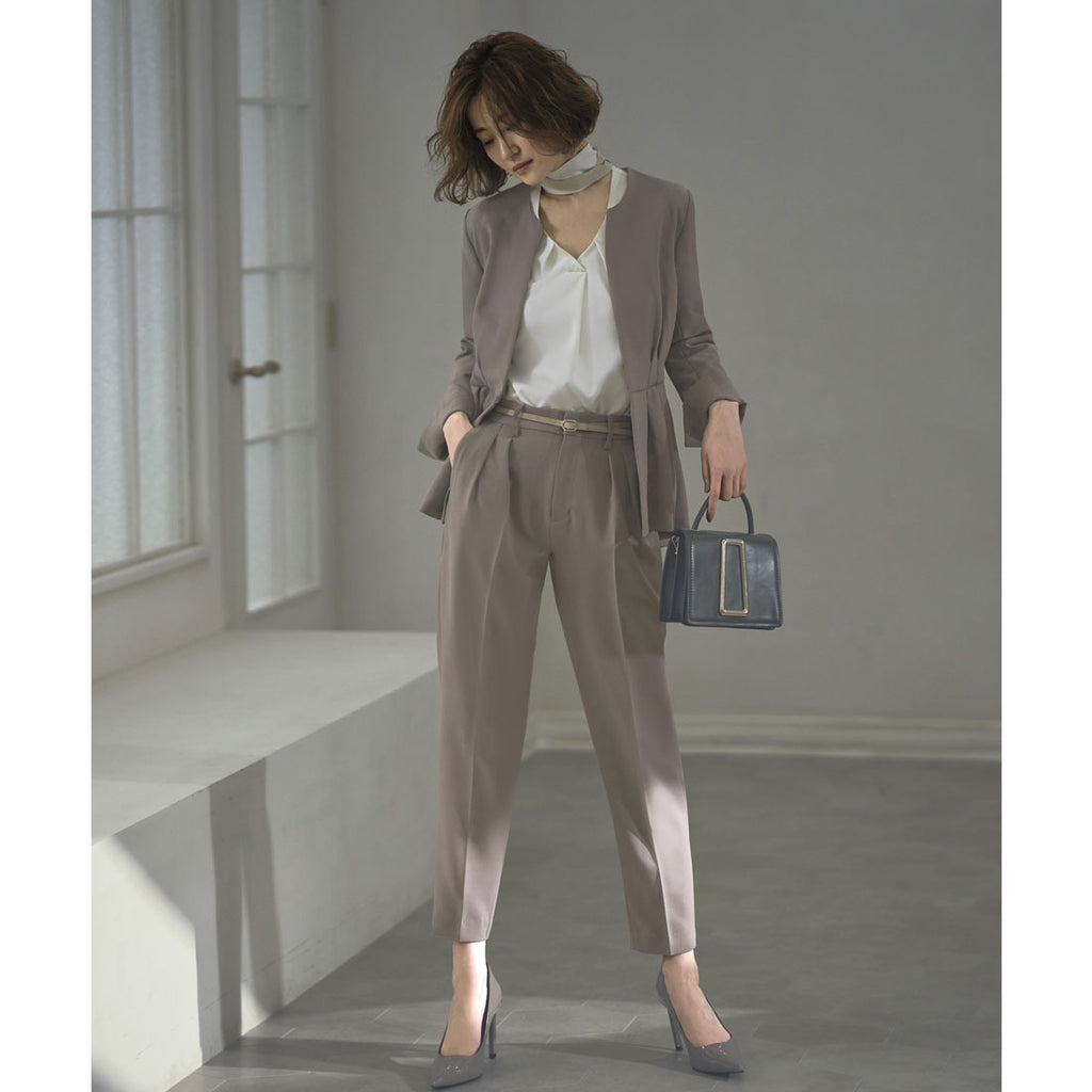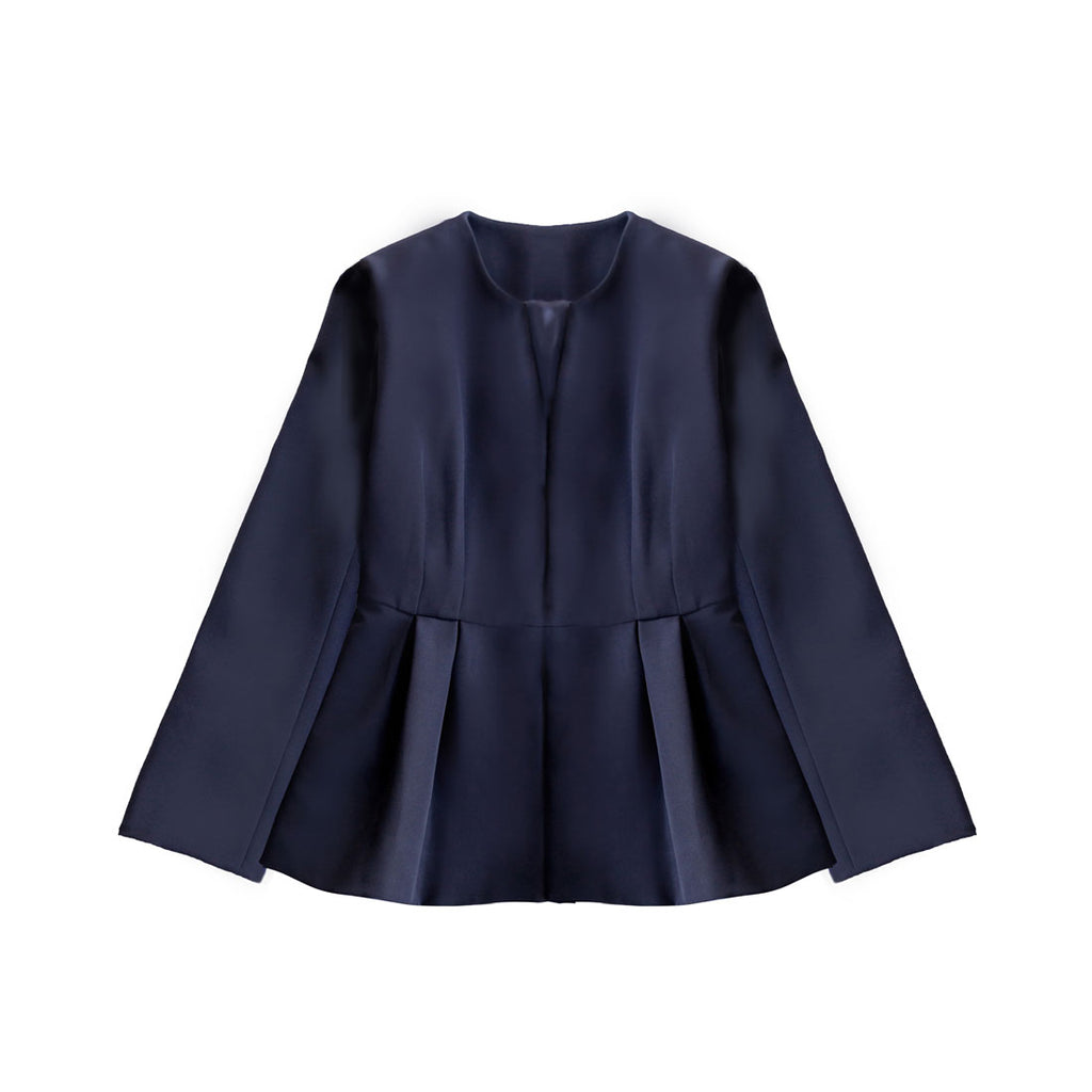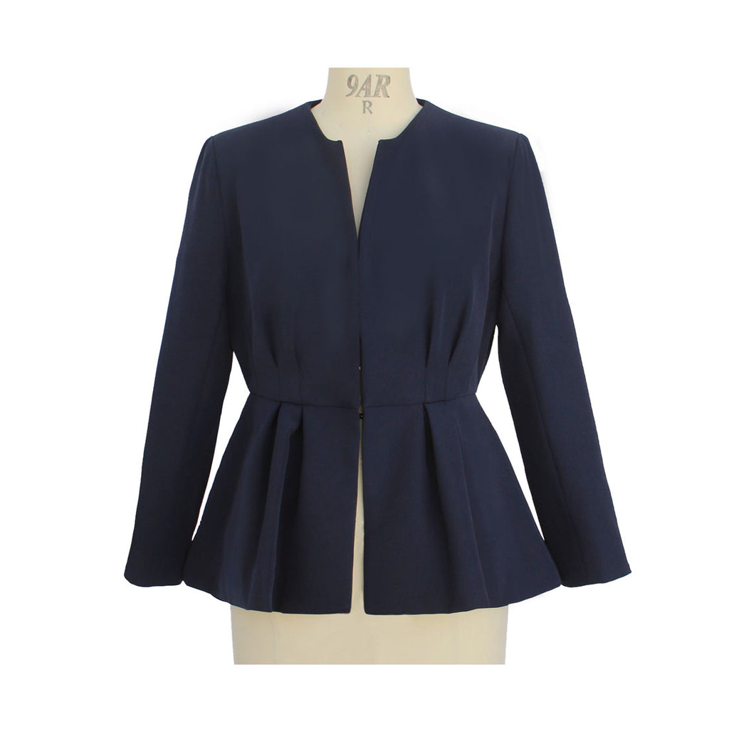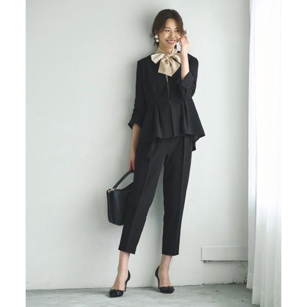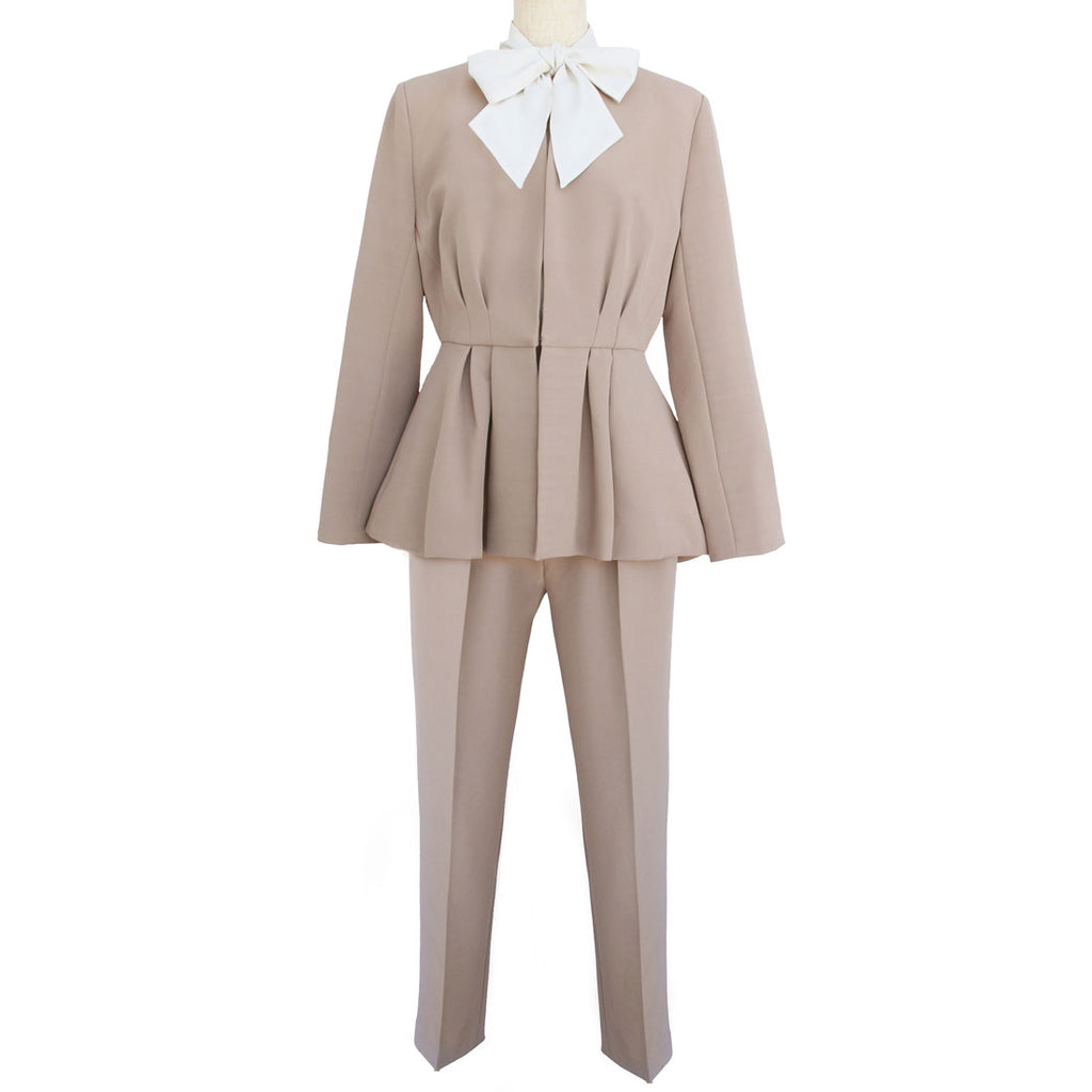 The jacket features a peplum that softly flares out, adding femininity, and comes with a top and pants, forming a three-piece set.