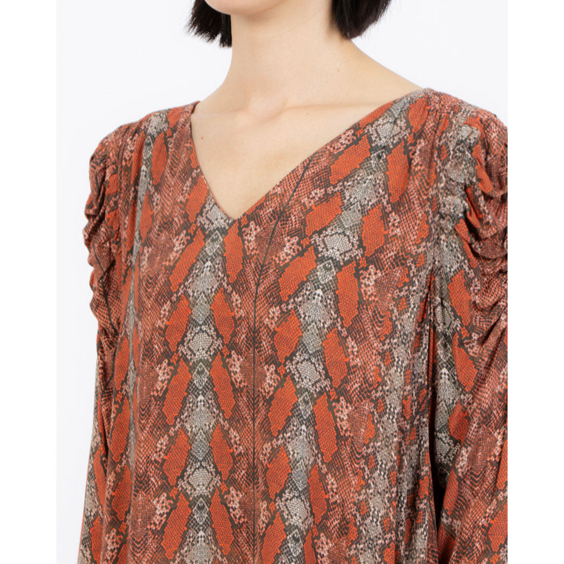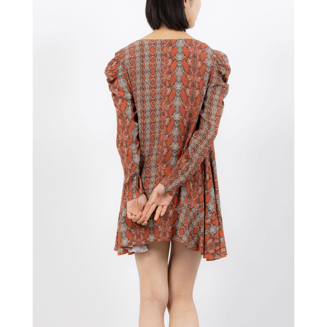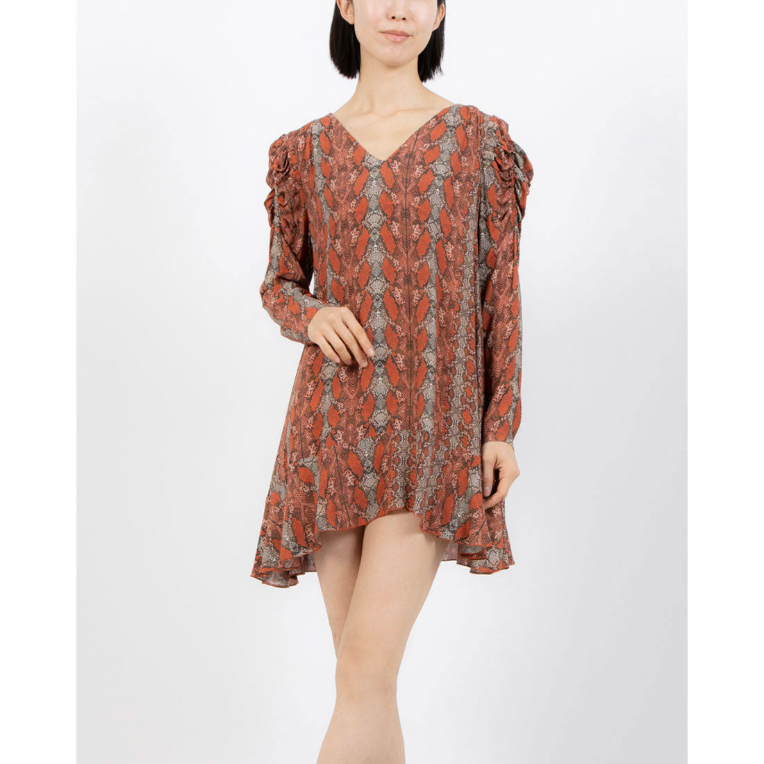 This is an A-line mini dress featuring a python print.