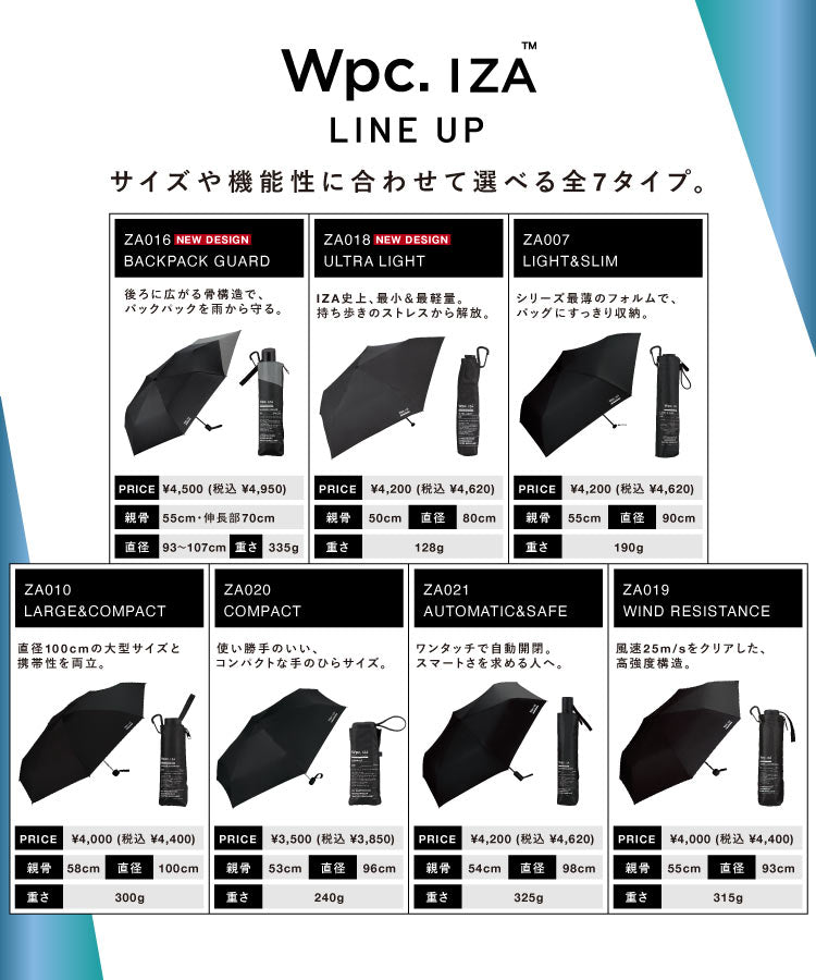 "Wpc. IZA (Double You P C IZA)" series of foldable umbrellas for both sunny and rainy weather.