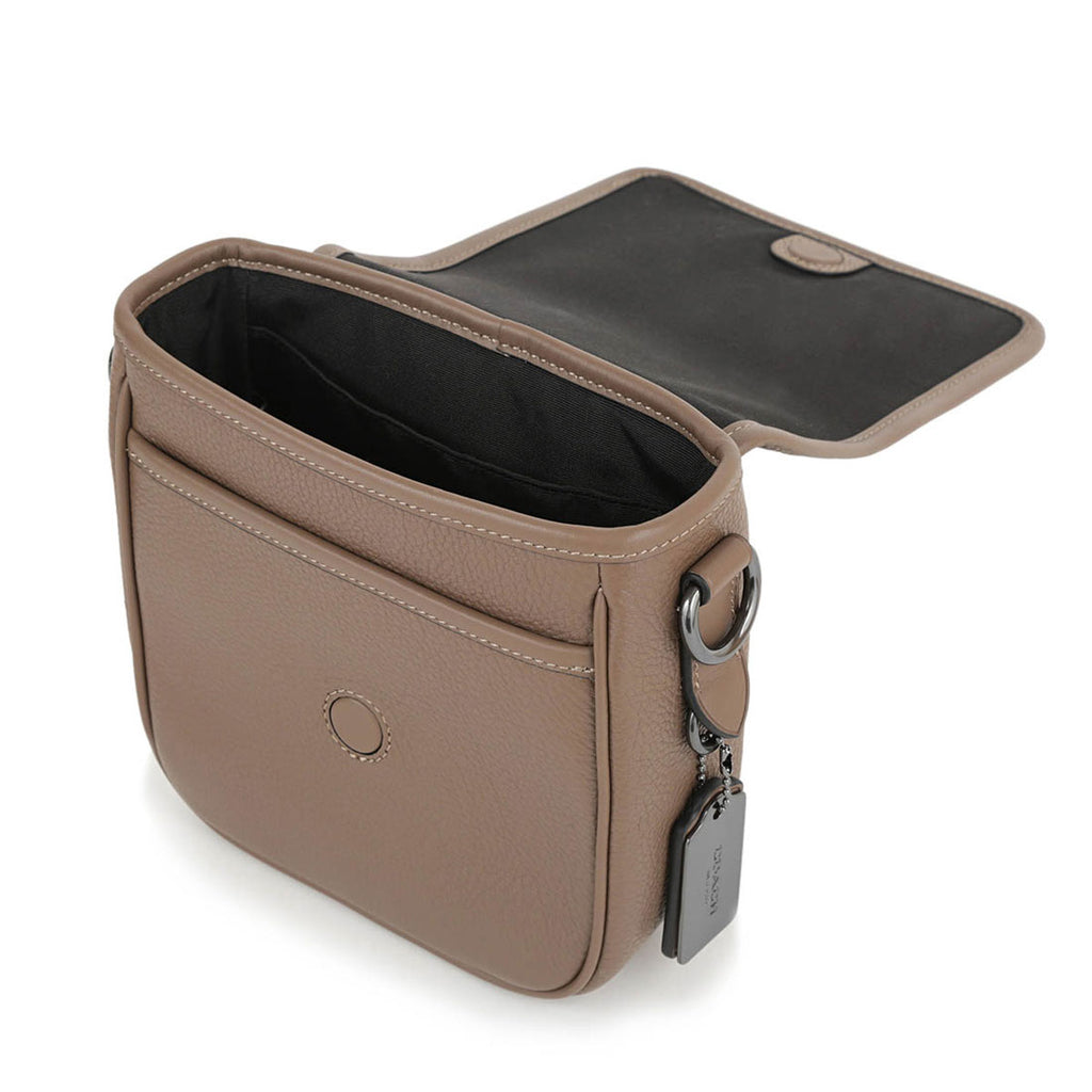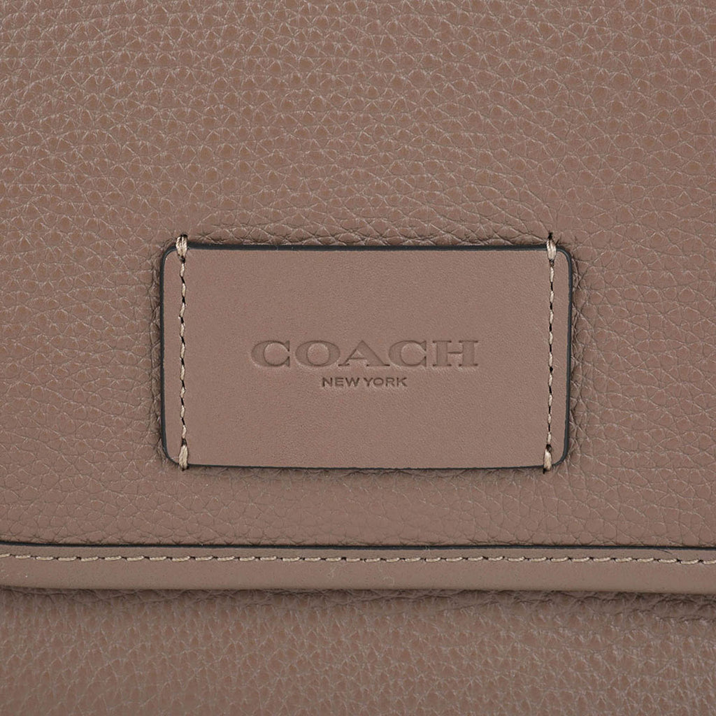 A Coach shoulder bag made of high-quality refined pebble leather, featuring a patch with the brand logo embossed as an accent.