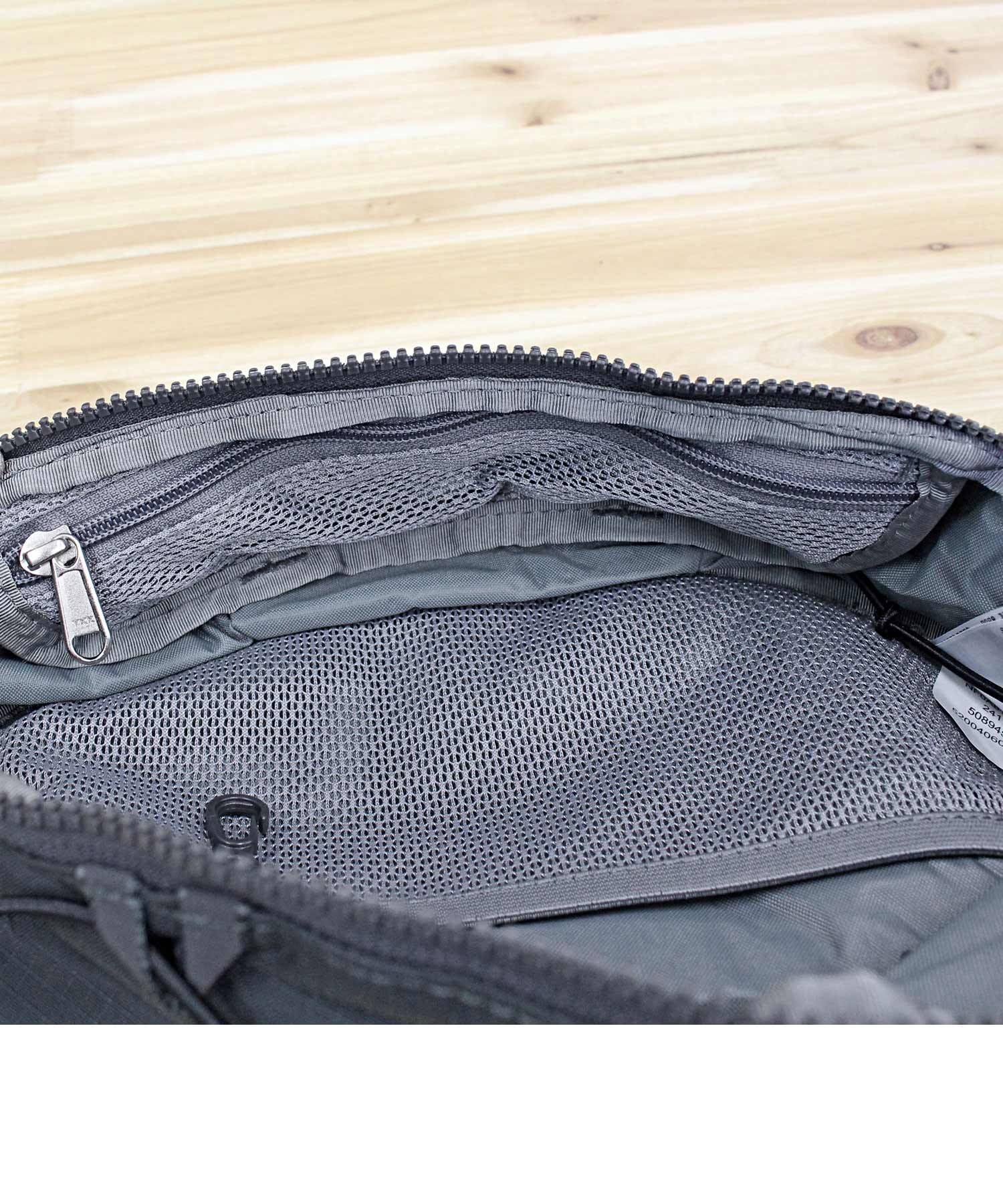 Inside, it features a zipper pocket and a mesh pocket with a key hook.