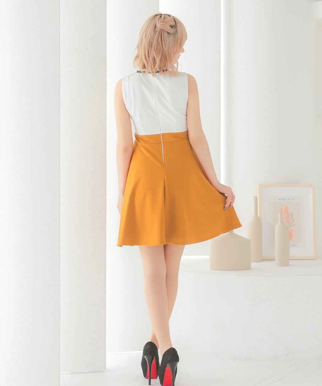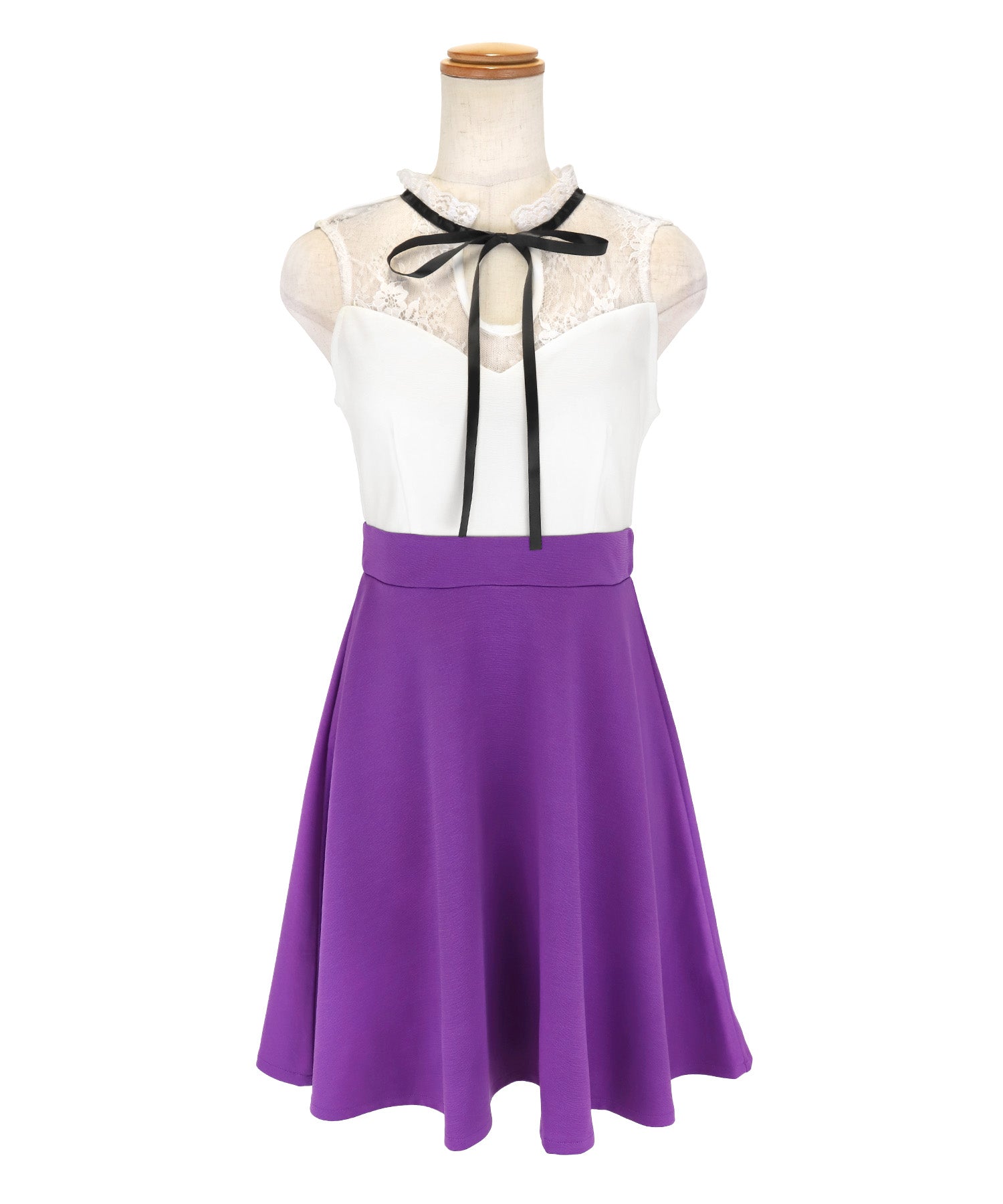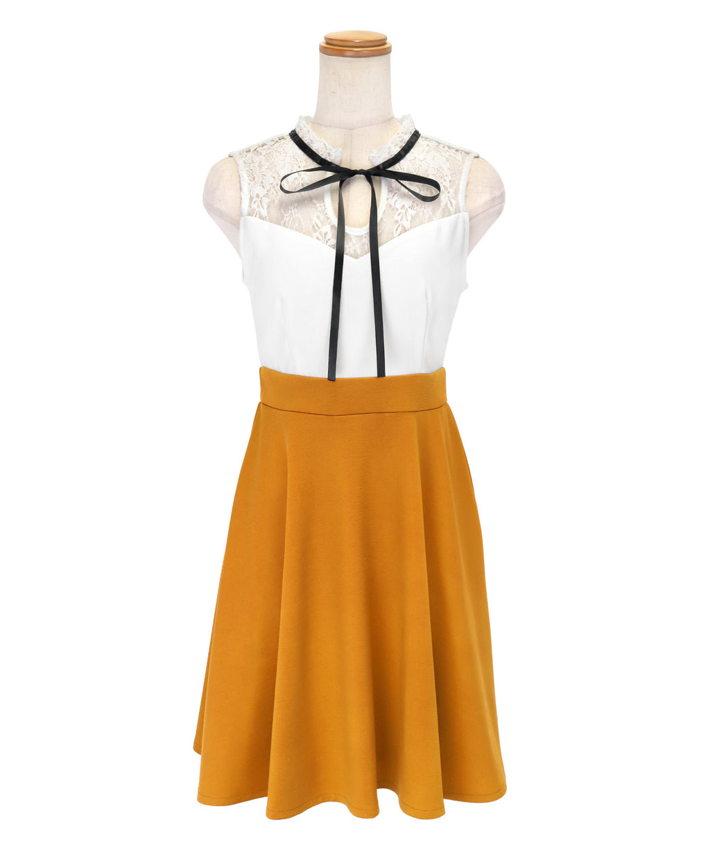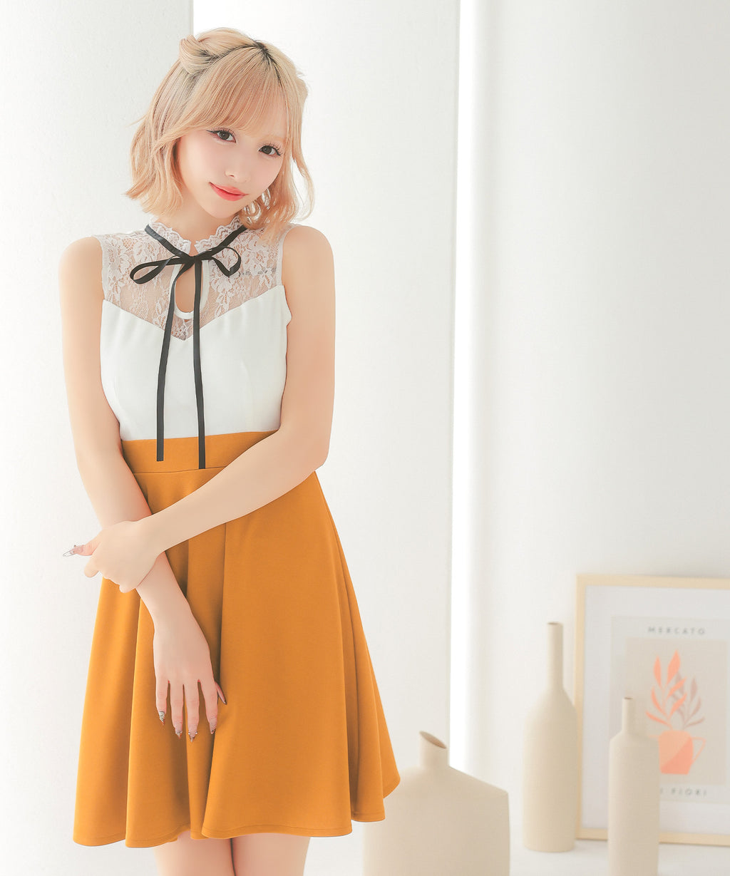 A flared mini dress that can dramatically enhance the cuteness around your face with a girly neck ribbon.