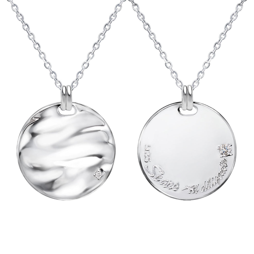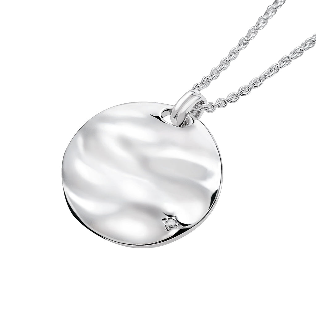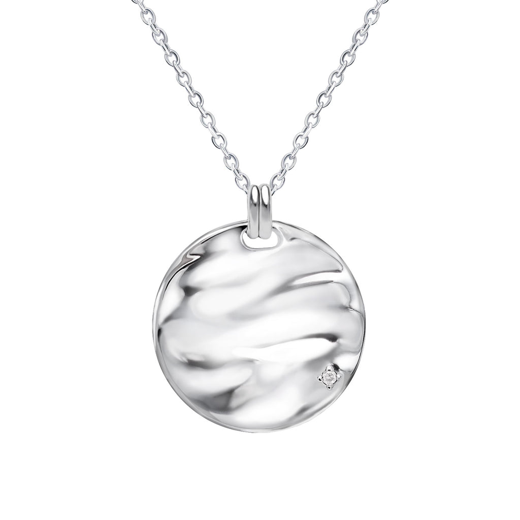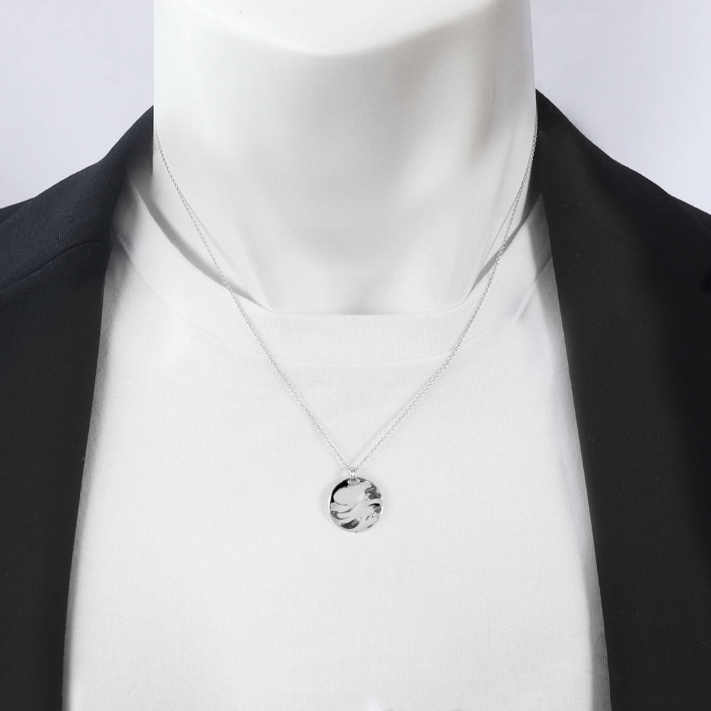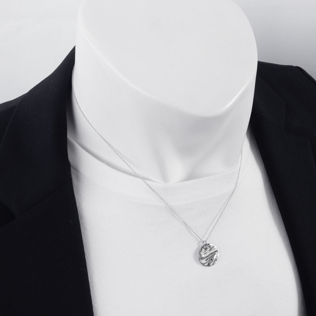 A coin-shaped necklace that seems to have captured the undulations of the waves as they are.