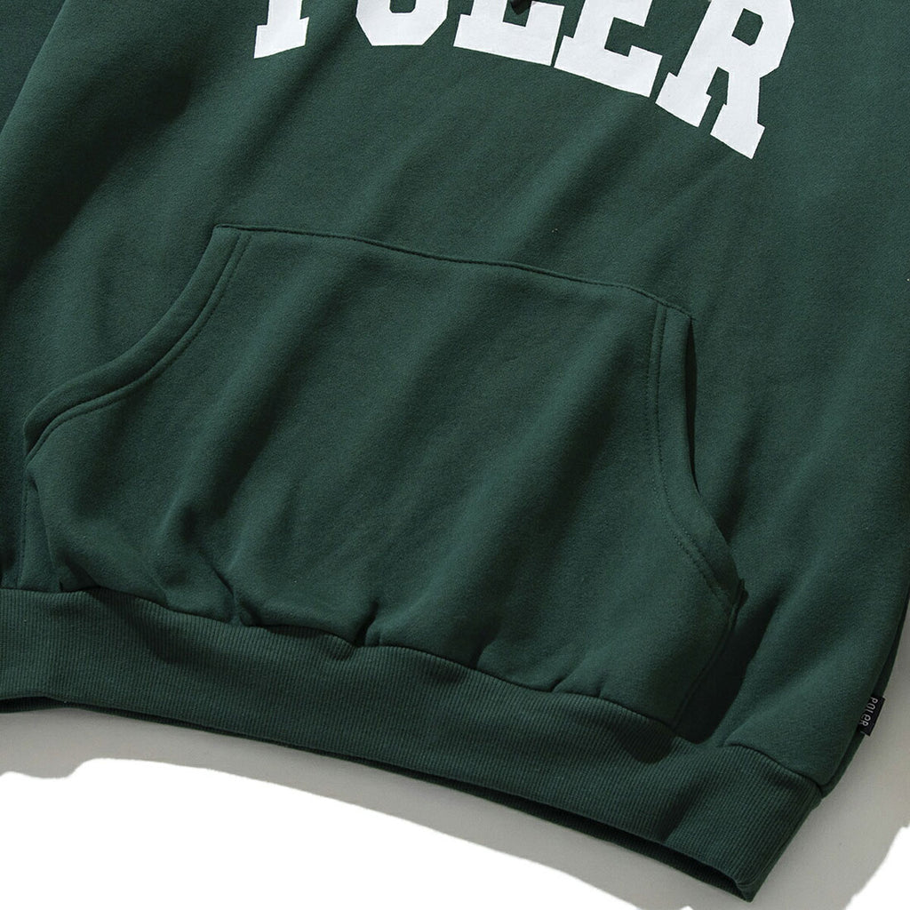 This hoodie features a front print inspired by college design, exuding an old-school vibe. This item looks great on its own and is expected to shine in 80's style outfits with a varsity jacket and skate shoes, or as a trendy piece to mix and match.