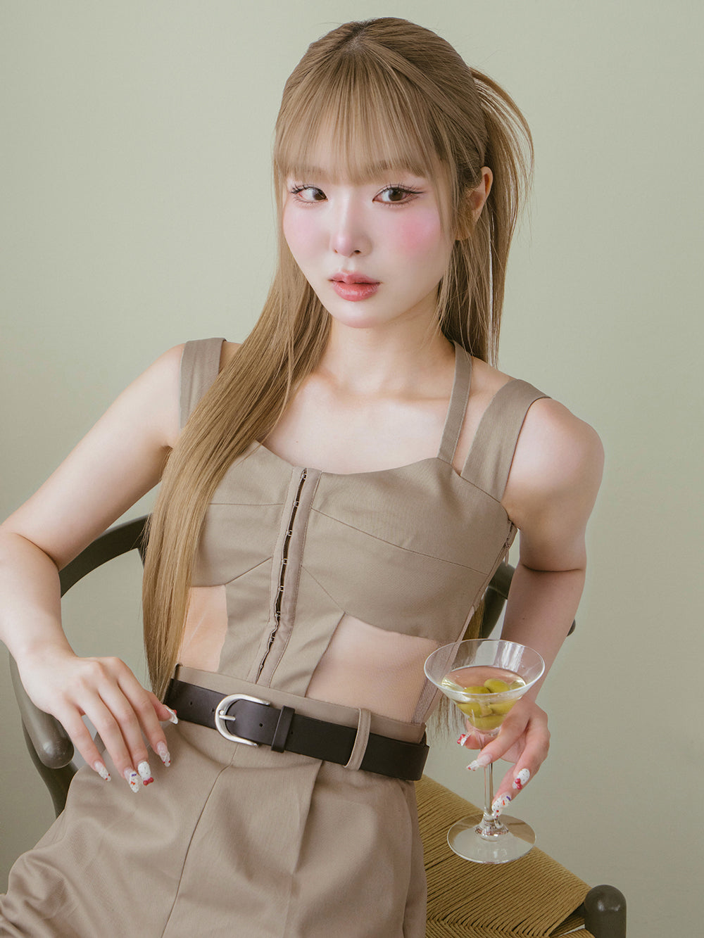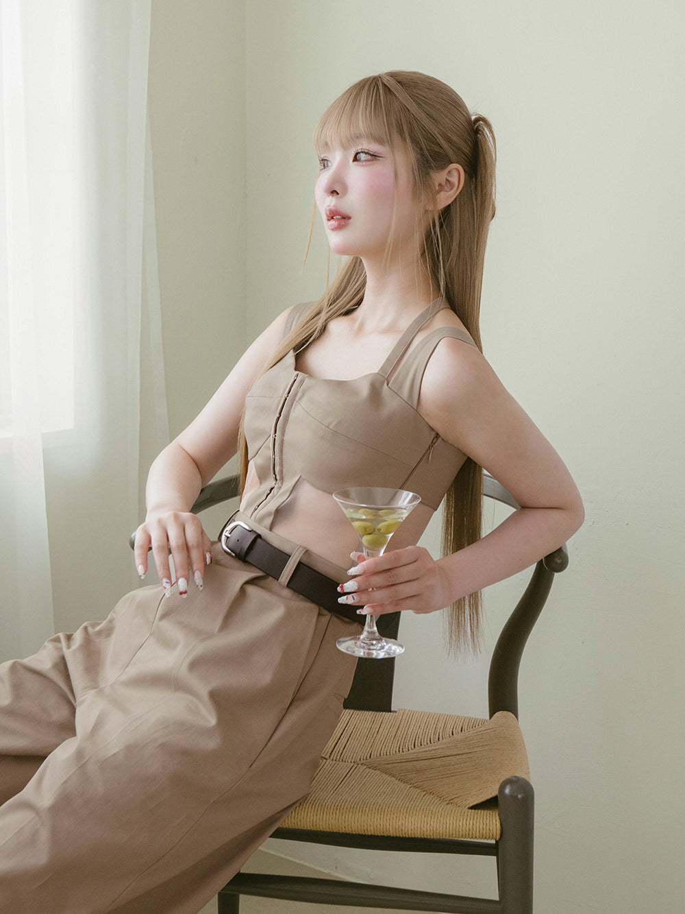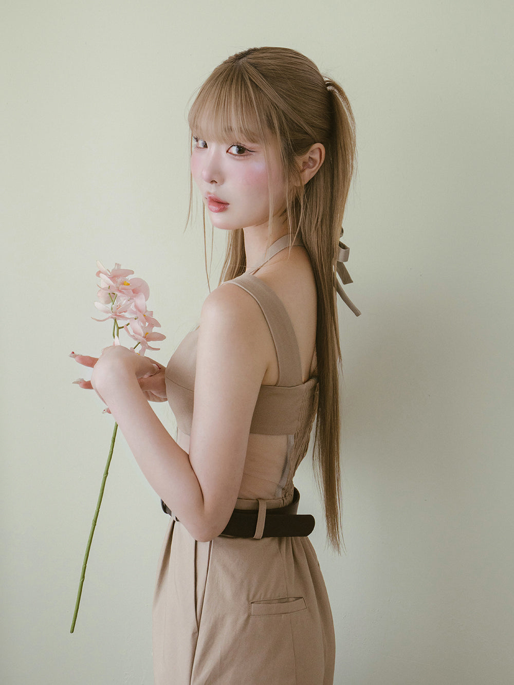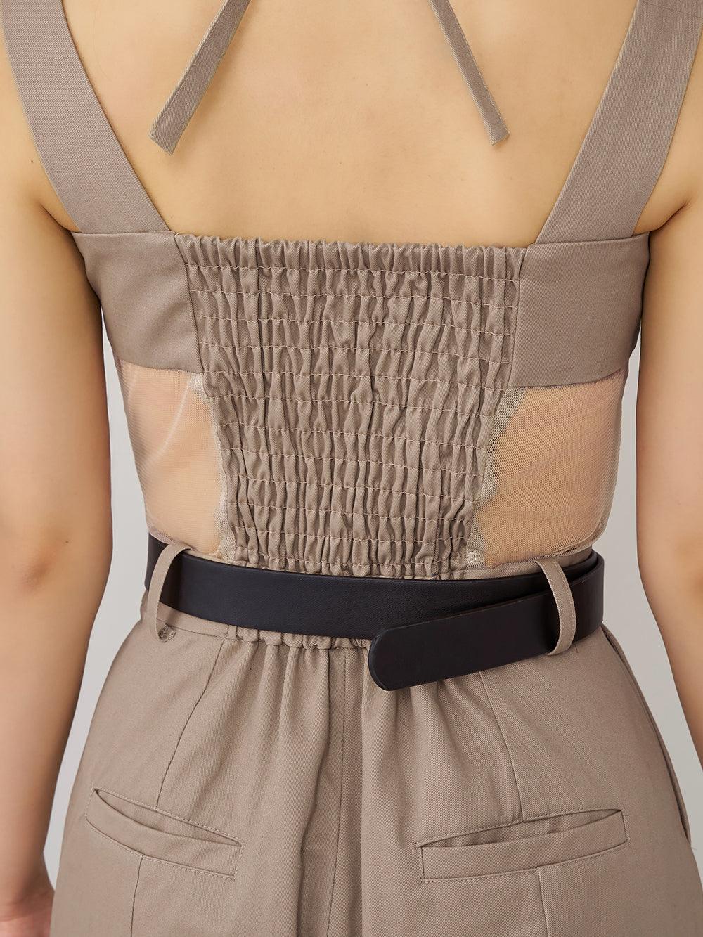 Furthermore, a daring sheer tulle is applied to the sides below the chest, creating a feminine, lingerie-like sense of transparency.