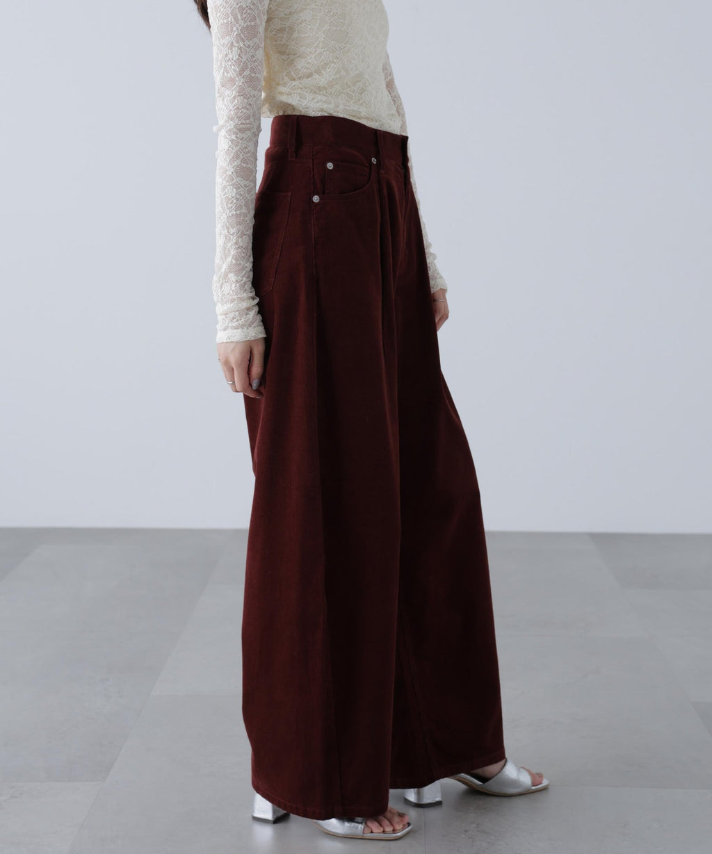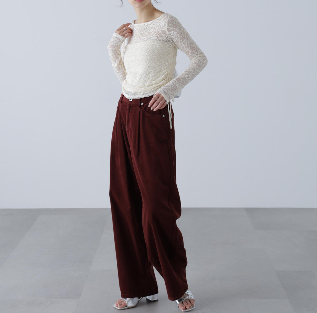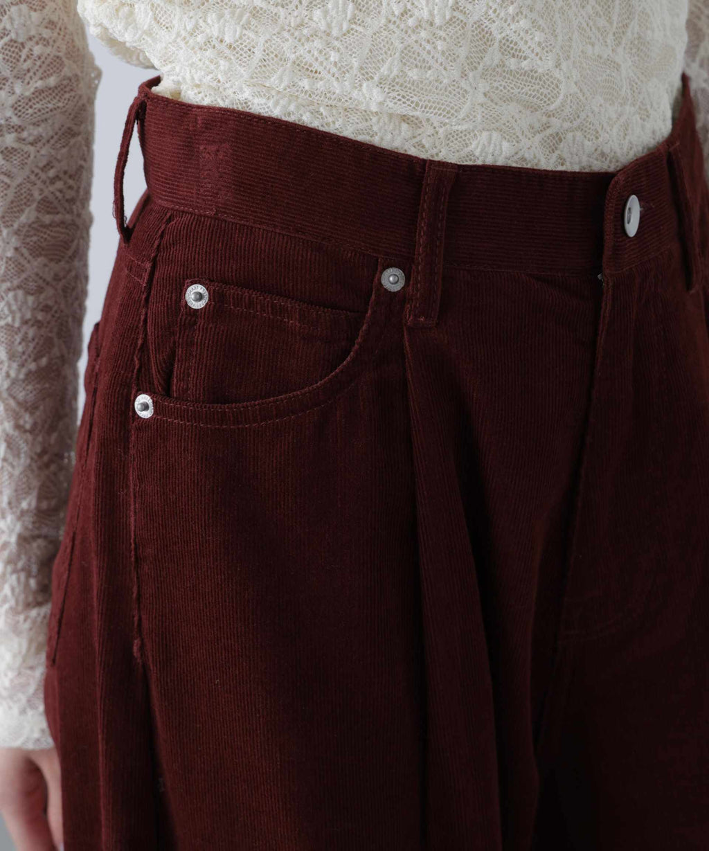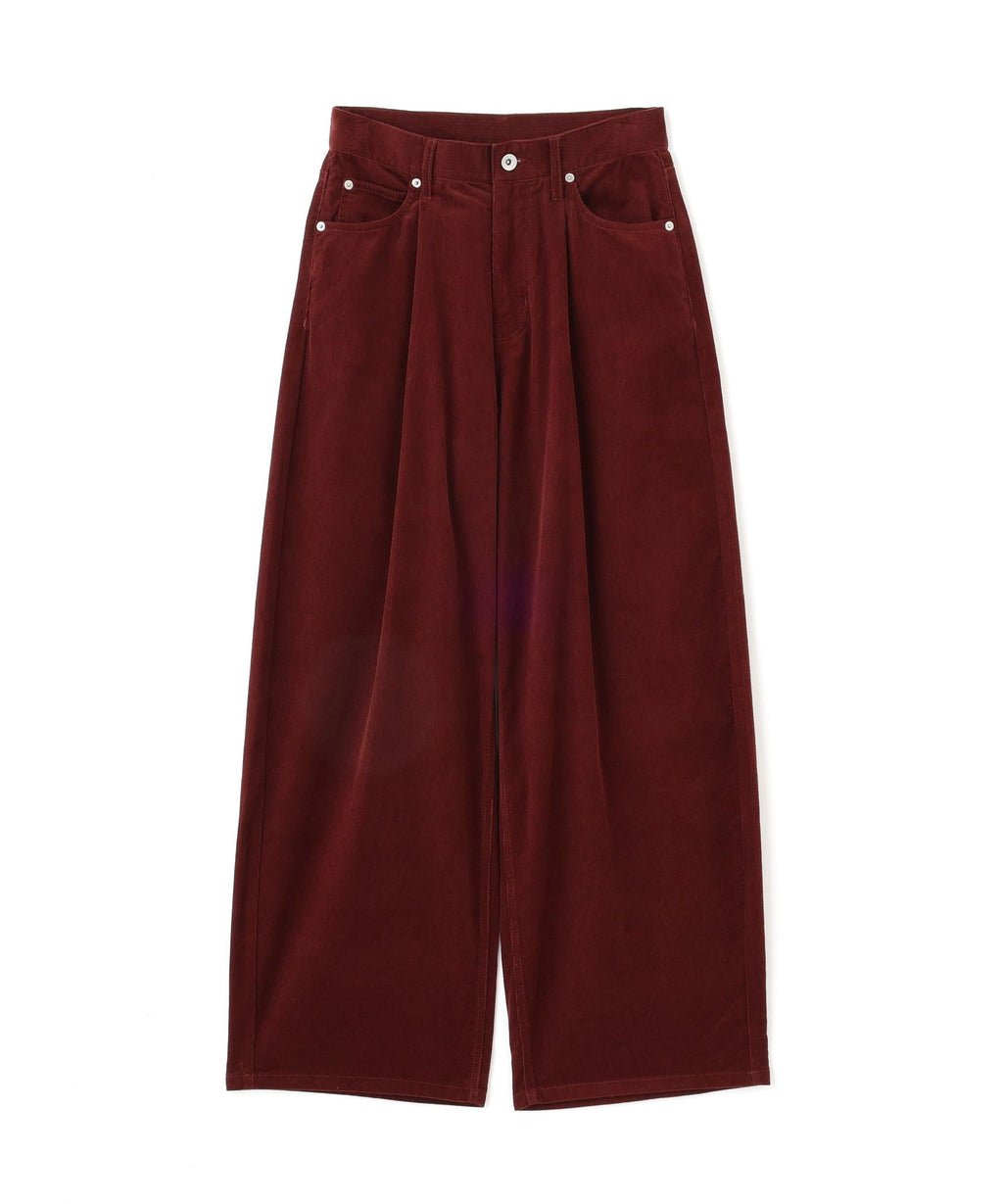 Corduroy pants with cocoon silhouette. Made from soft corduroy material, making them suitable to wear from early autumn when the weather remains warm. The soft texture allows the cocoon silhouette to blend naturally. Features pleats that create a relaxed, stylish look. Recommended to pair with a fitted top or a relaxed shirt or jacket. Trendy layered polo knit for a preppy style is also fashionable this year.