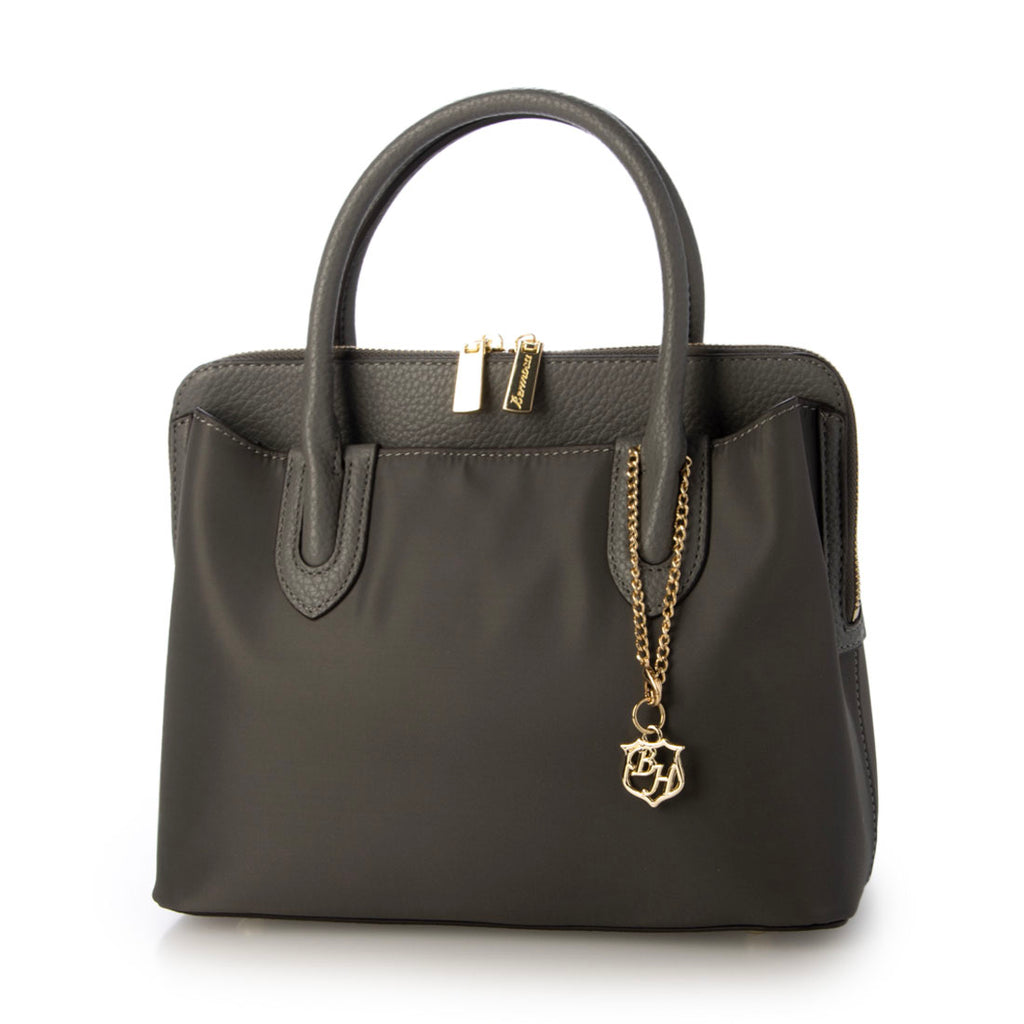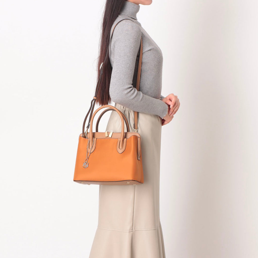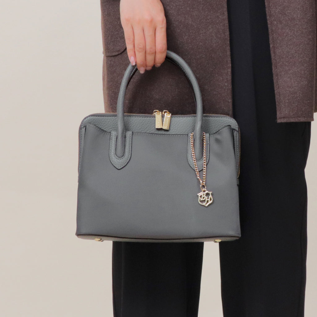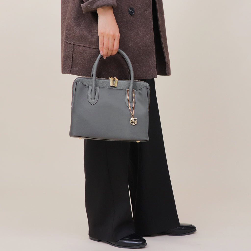 A nylon×leather handbag with a moderate casual feel and an elegant atmosphere.