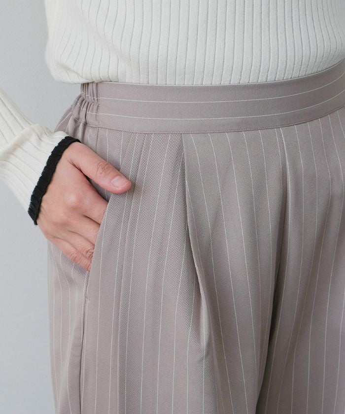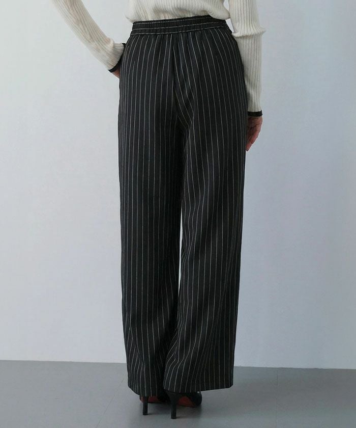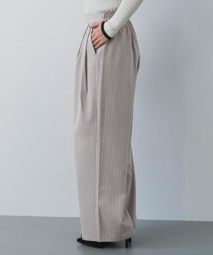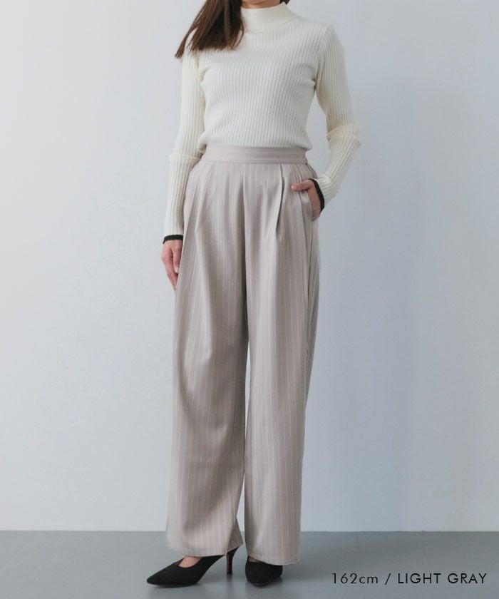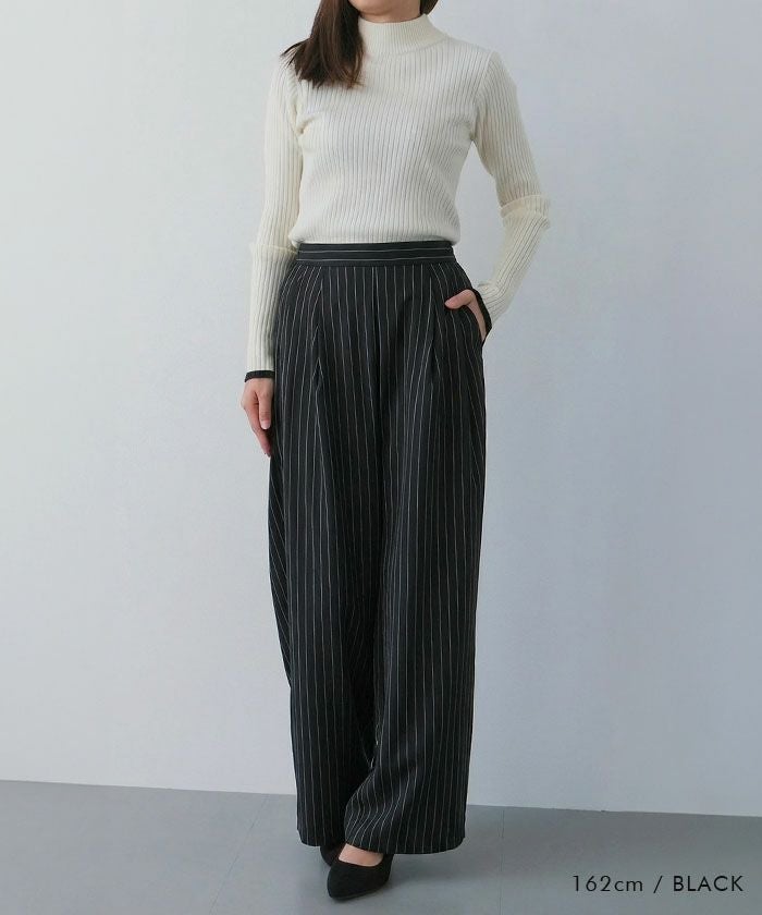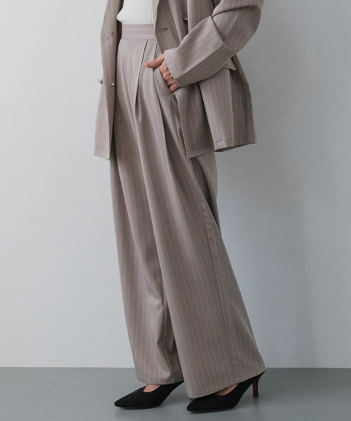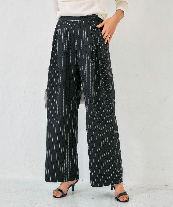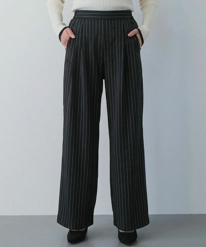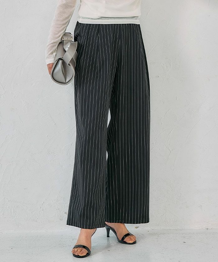 The "Two-Tuck Stripe Wide Pants" create a visually clean look with vertically extending stripes, making the overall silhouette appear neat.