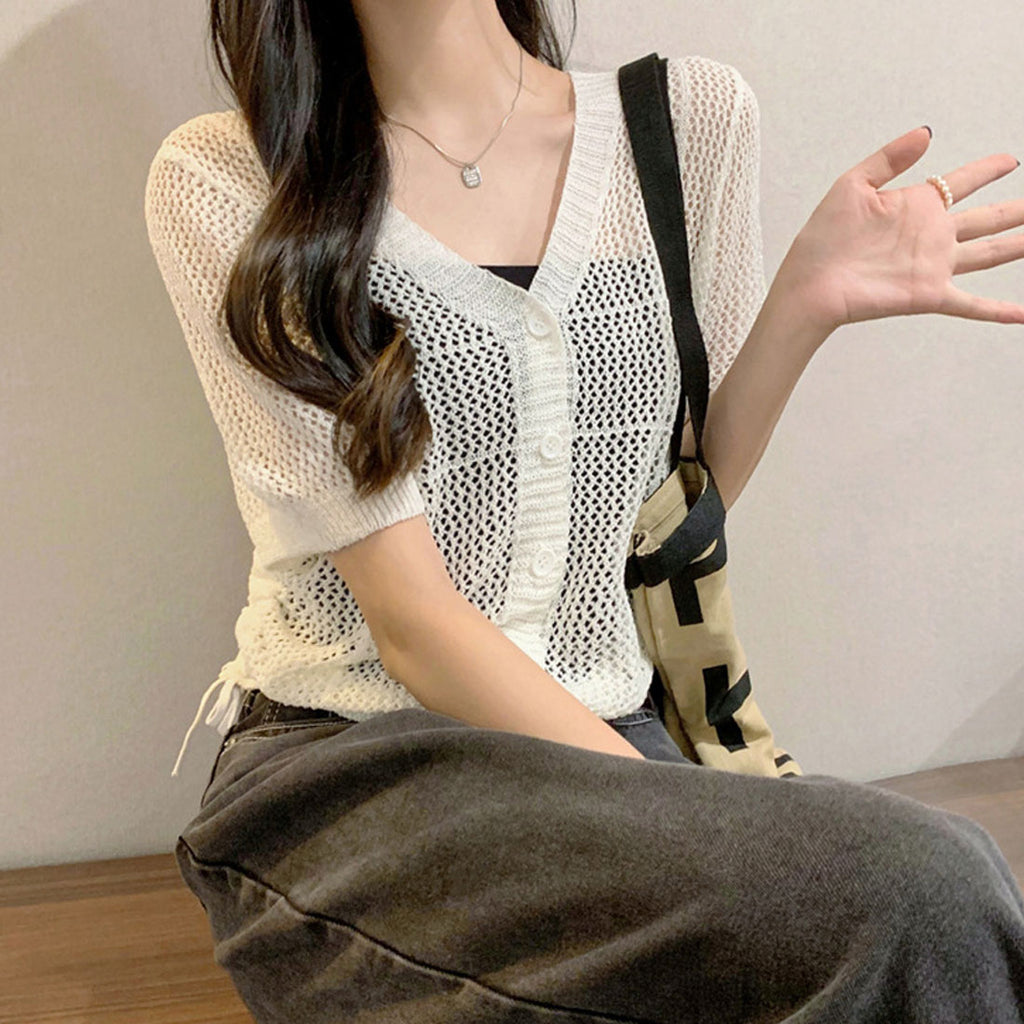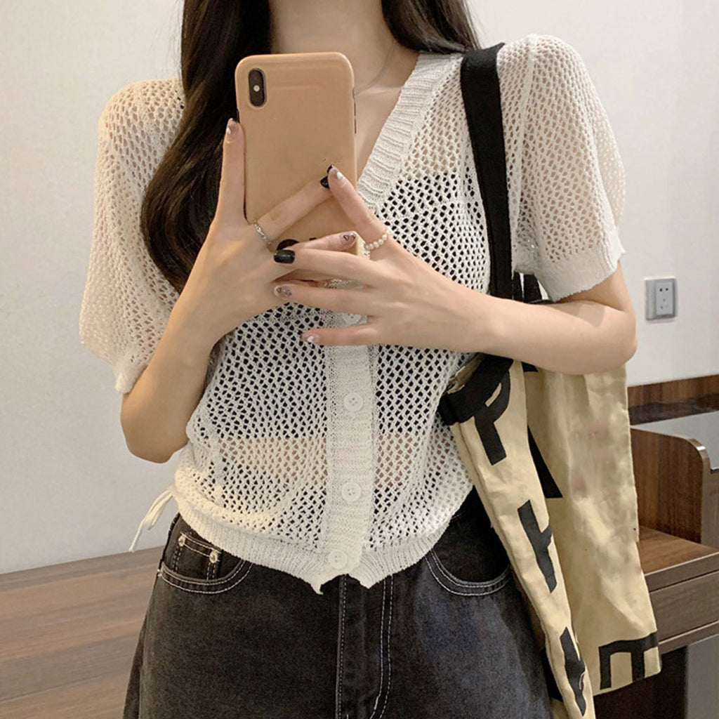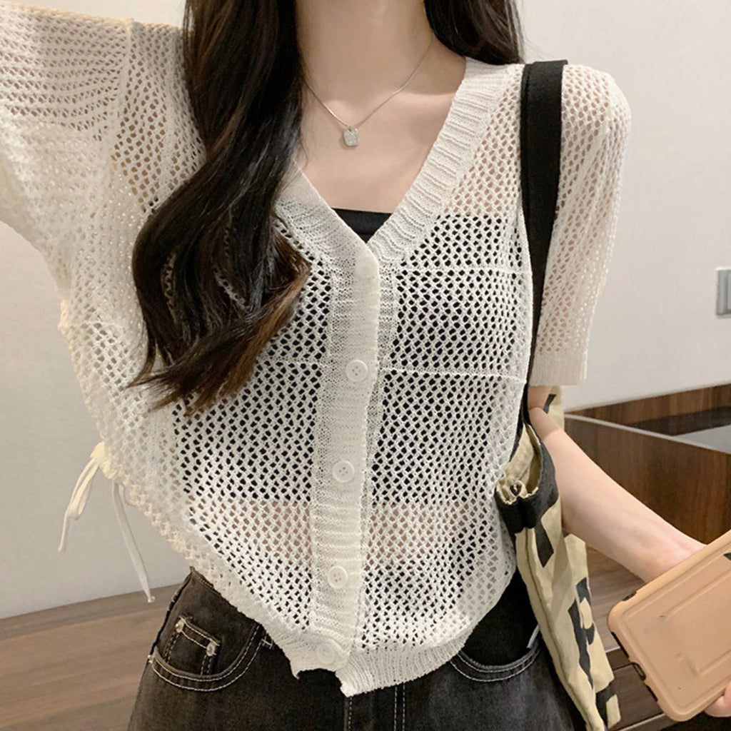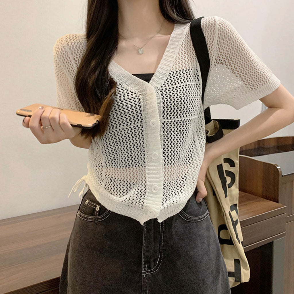 Ladies Cute Summer Cardigan Korean Style Slimming Sheer Top Plain Lightweight V-Neck Summer Knit Top Summer
