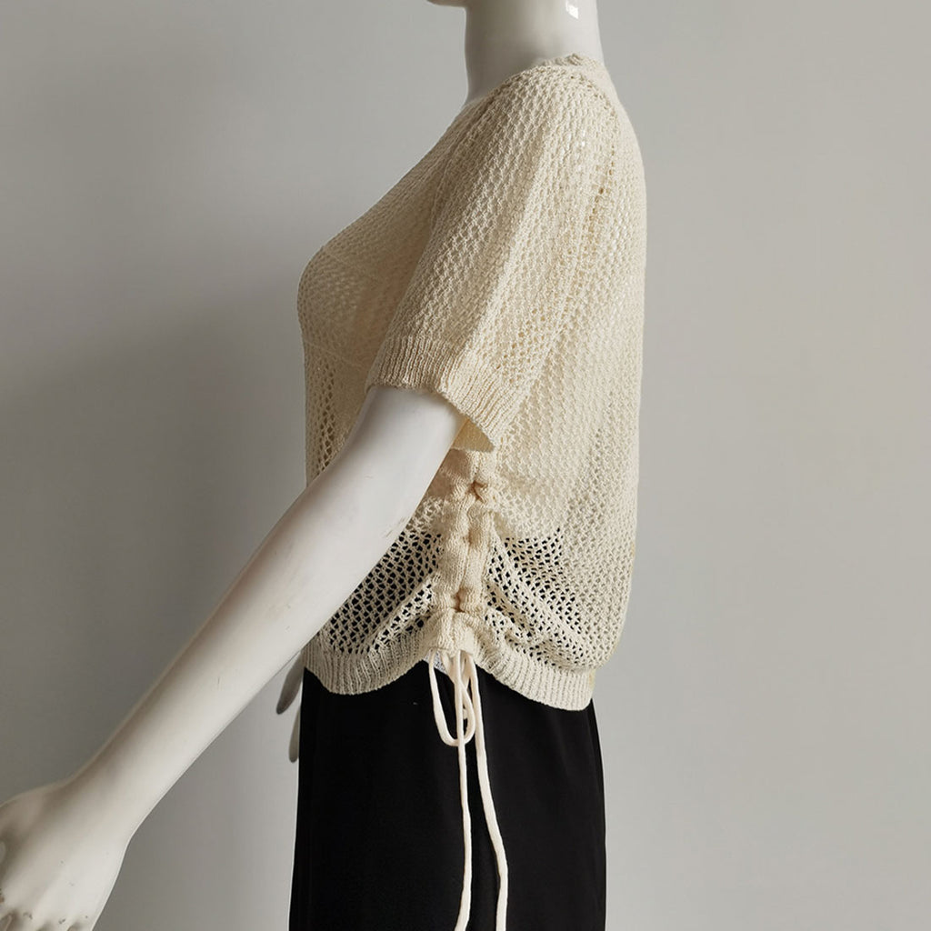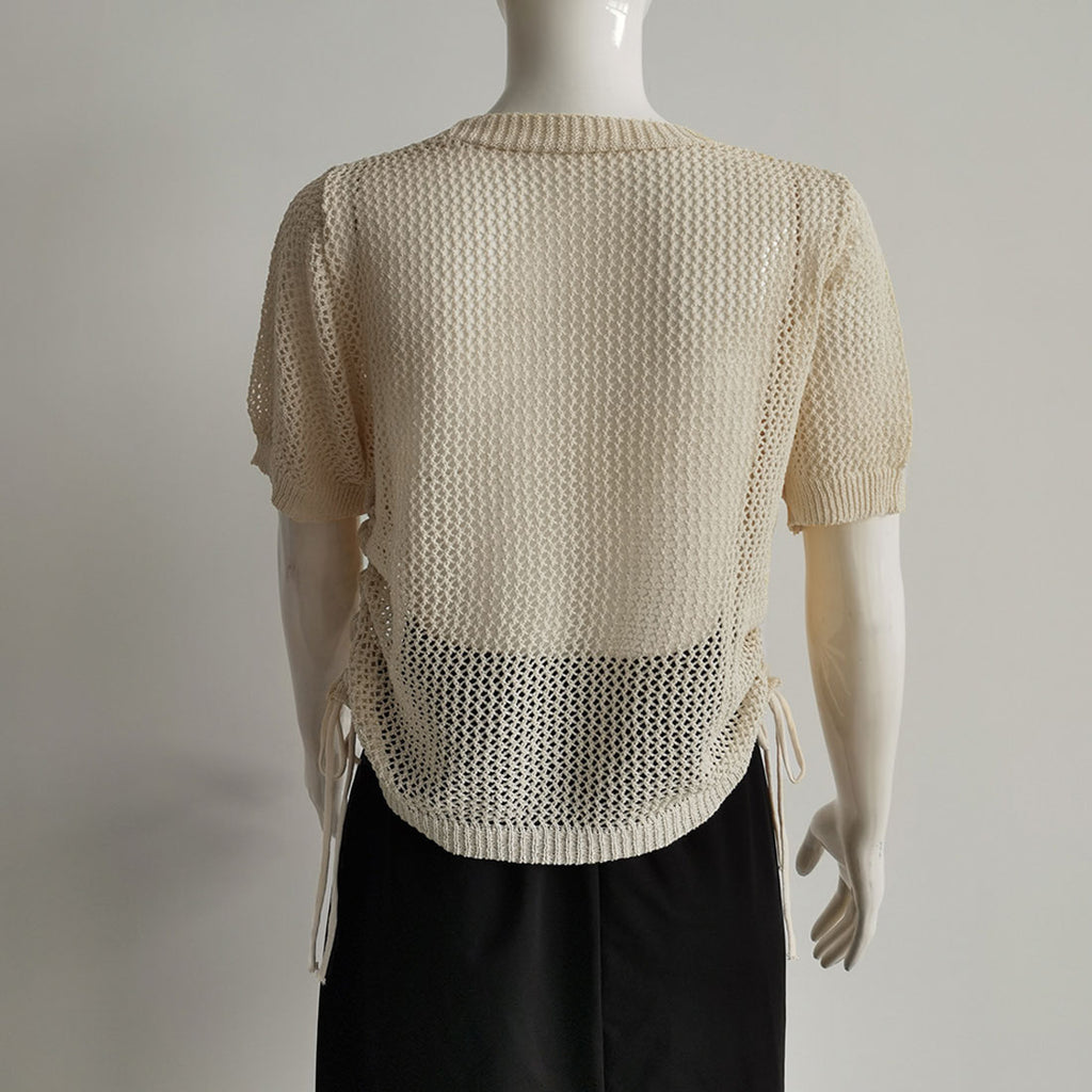 A summer knit cardigan with a refreshing feel, intricately knitted with fine threads in a delicate lace pattern.