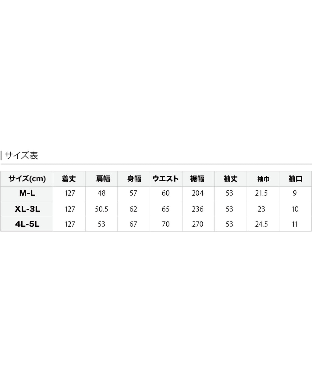| Actual size | M: Length: 127cm, Shoulder Width: 48cm, Sleeve Length: 53cm, Waist: 60cm XL/LL : Length: 127cm, Shoulder Width: 50.5cm, Sleeve Length: 53cm, Waist: 65cm 4L: Length: 127cm, Shoulder Width: 53cm, Sleeve Length: 53cm, Waist: 70cm |