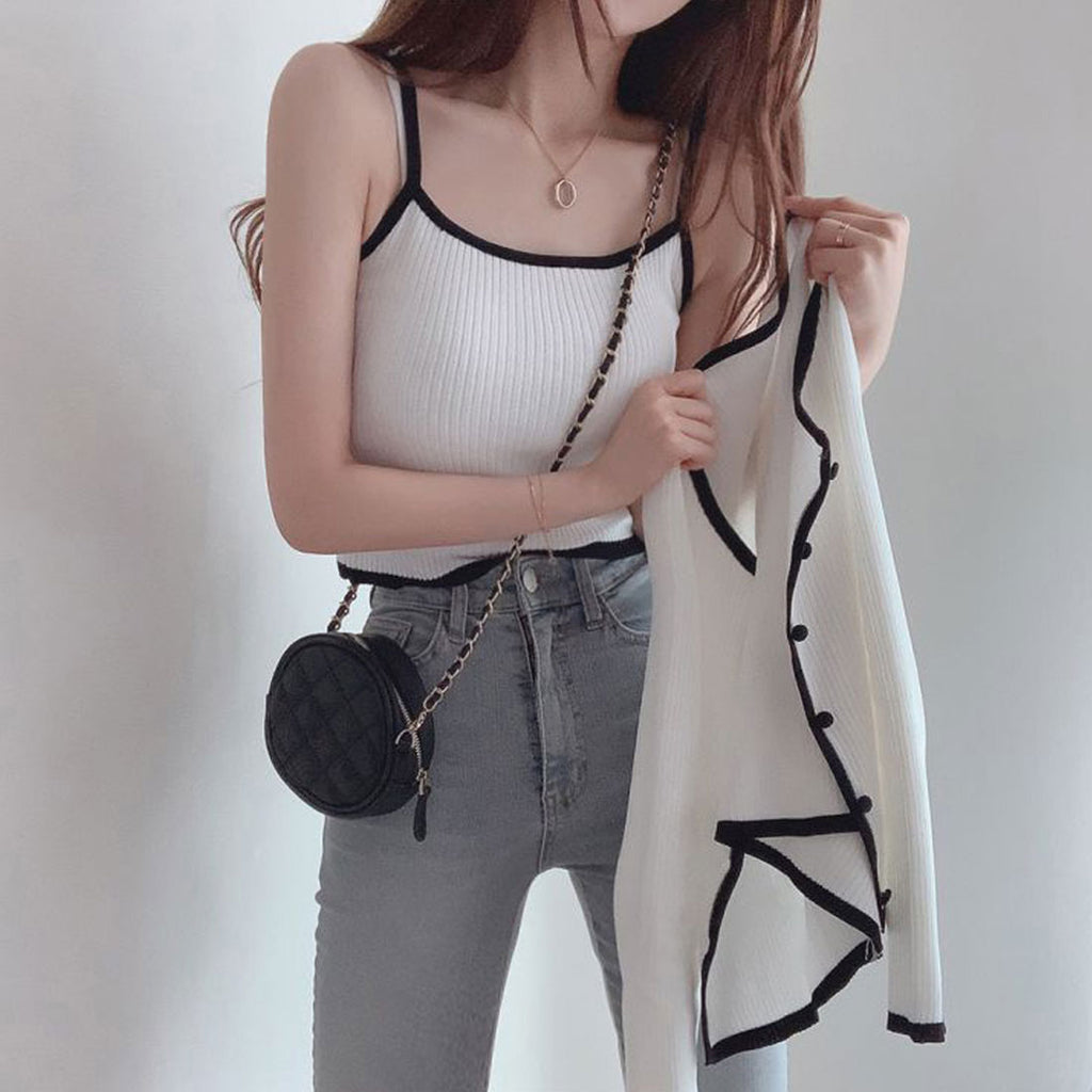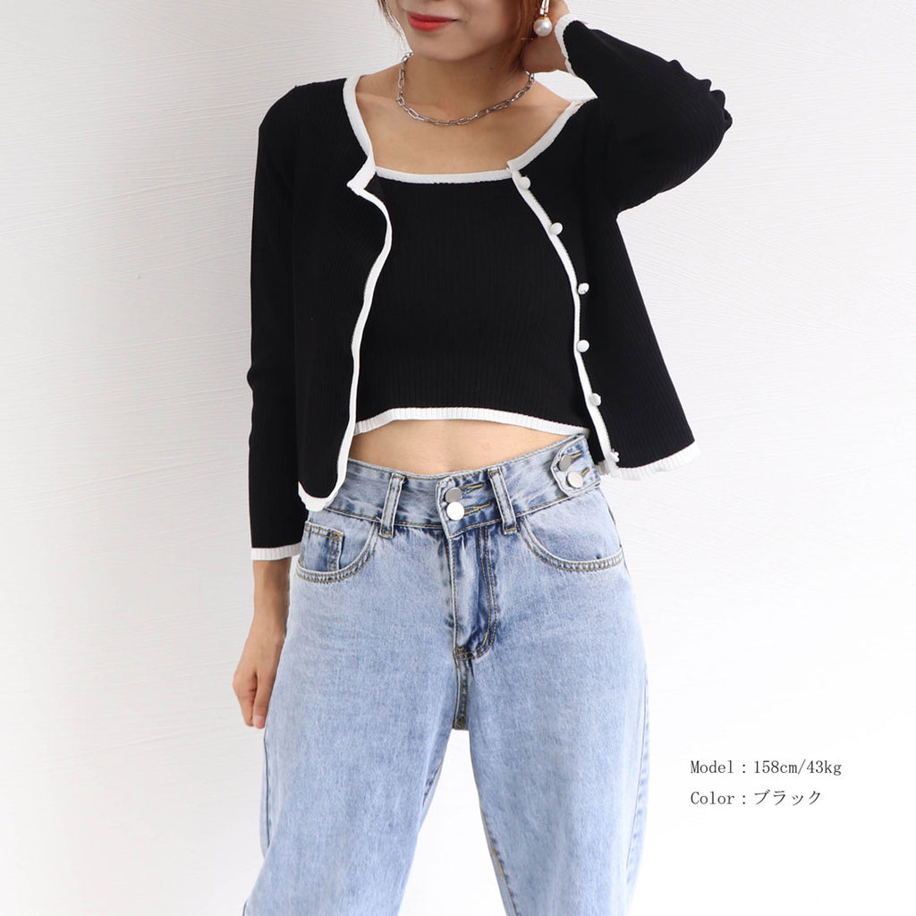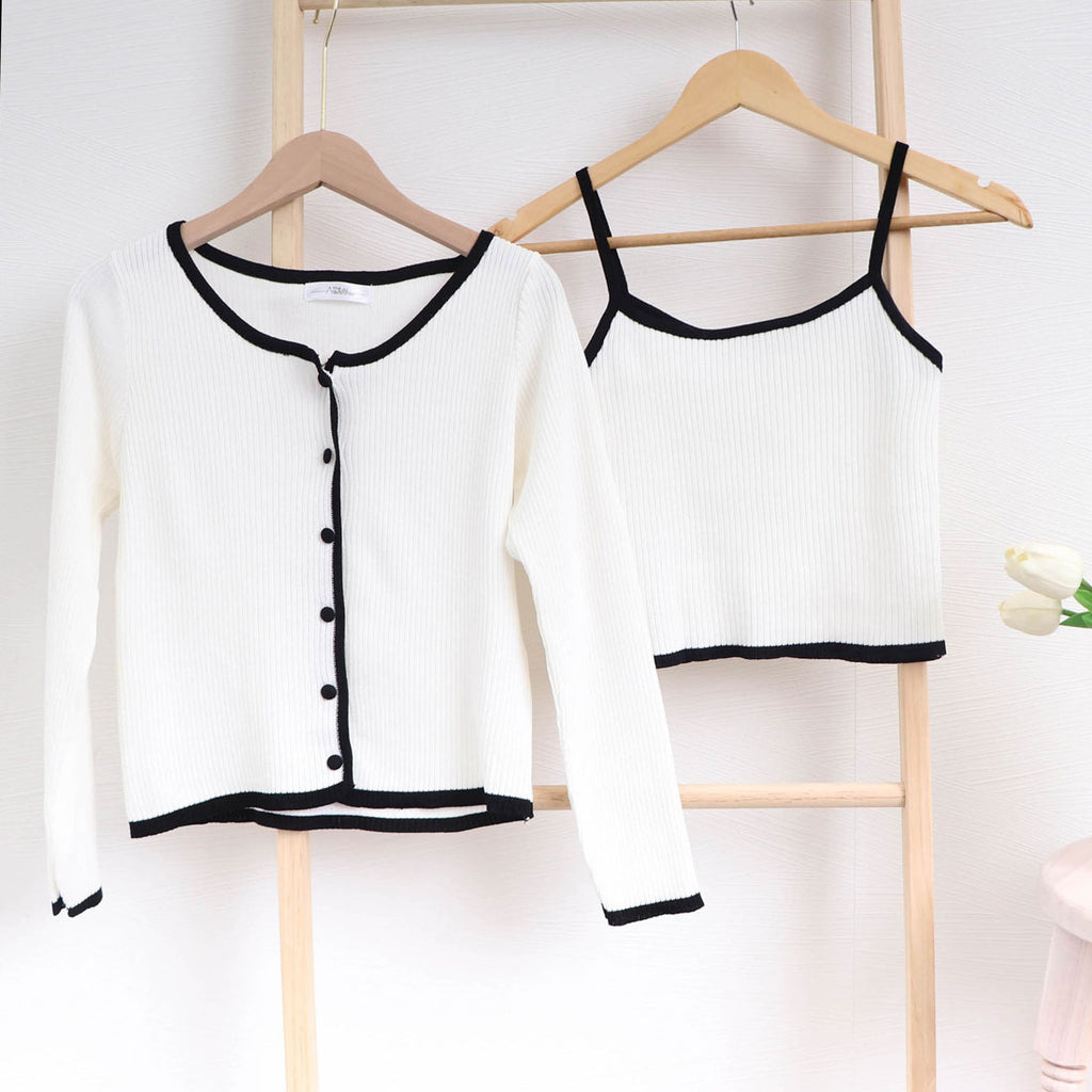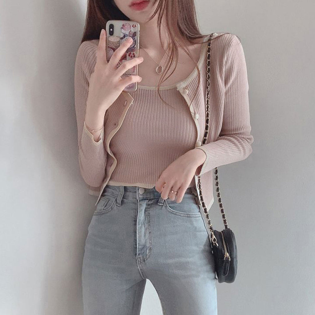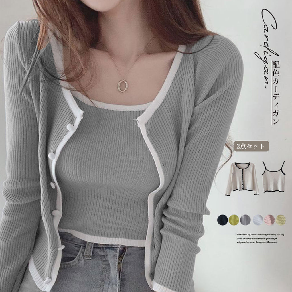 A 2-piece set of knit cardigan and camisole made of the same material