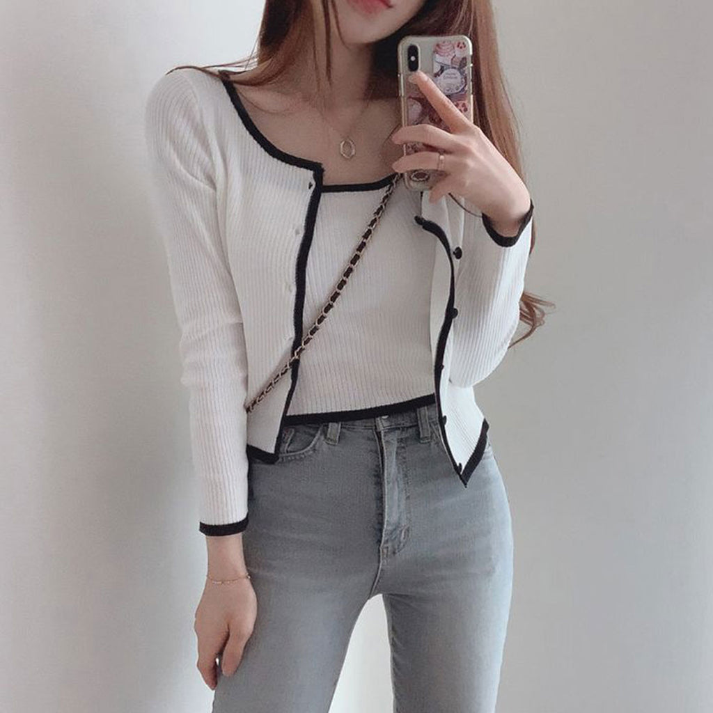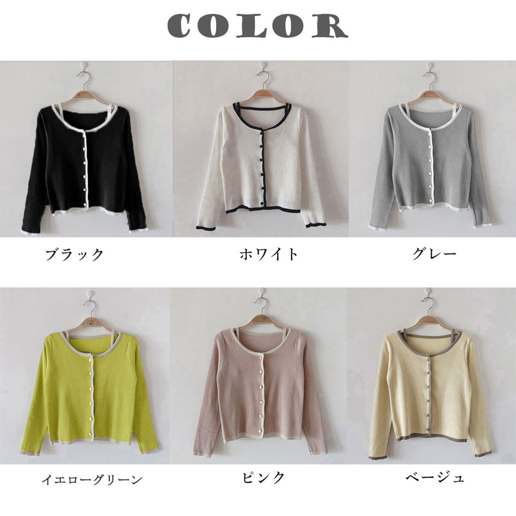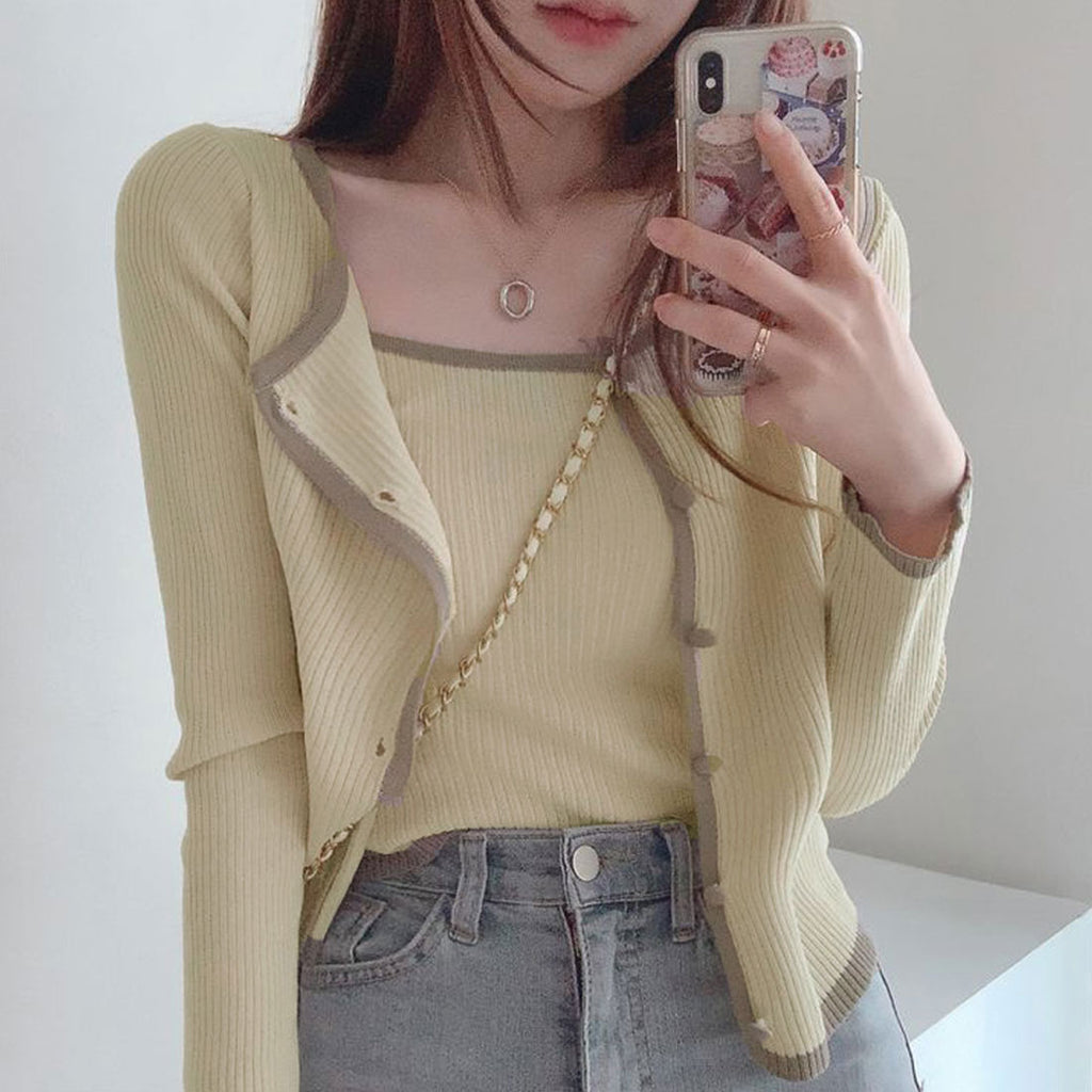 Short length knit top set-up, ladies' bicolor front opening, autumn clothes, ensemble, 20s 30s 40s, Korea