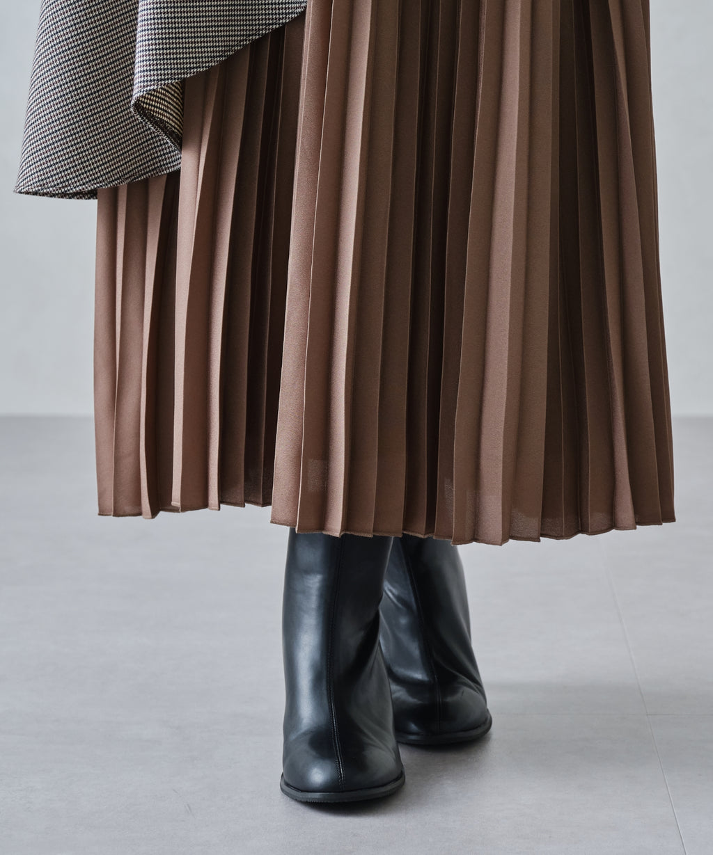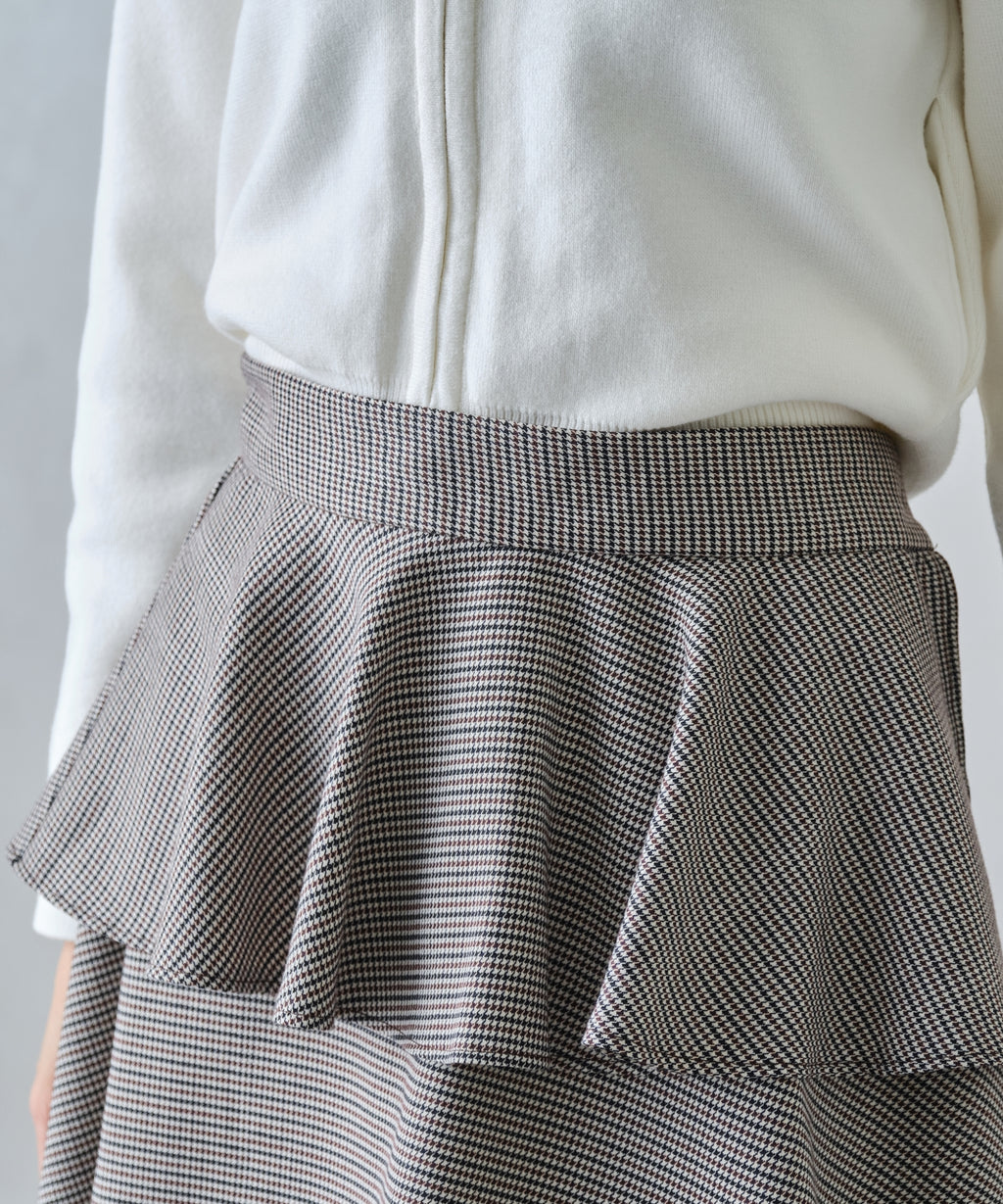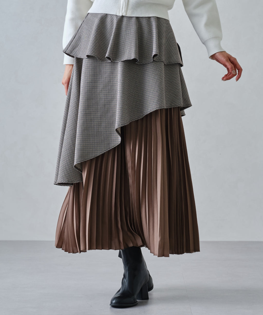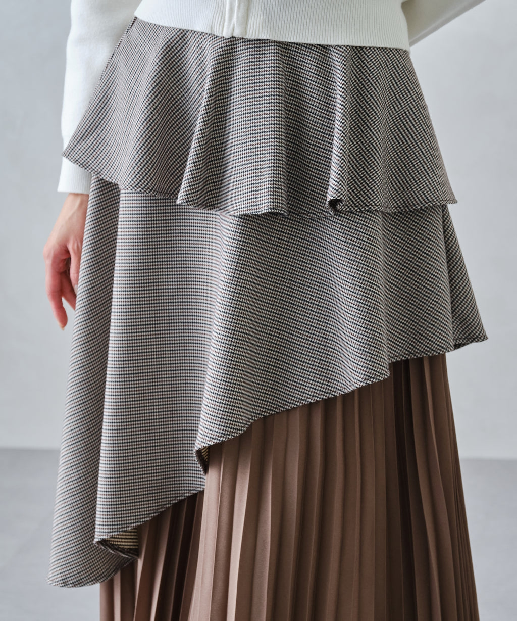 The cover belt creates a peplum silhouette, and when the cover belt is removed, it becomes a skirt that combines an asymmetrical flare skirt with a pleated skirt made of different materials.