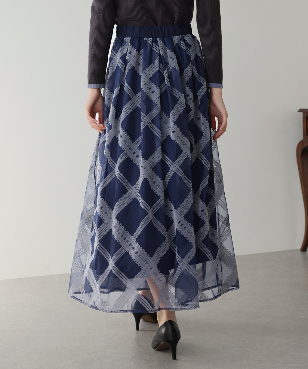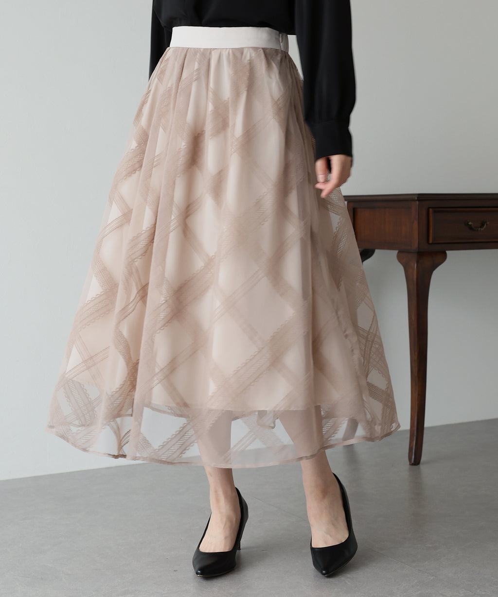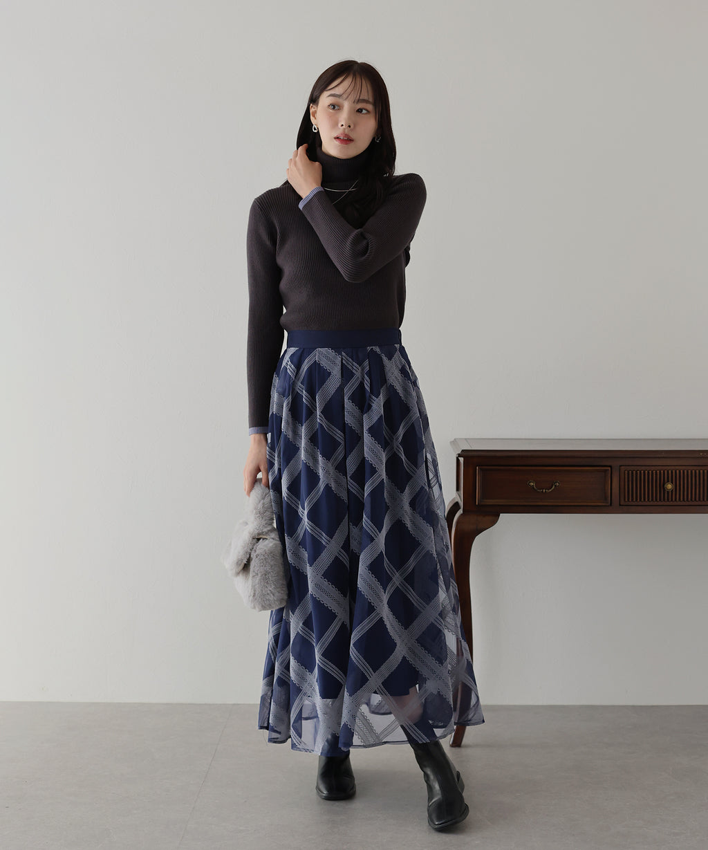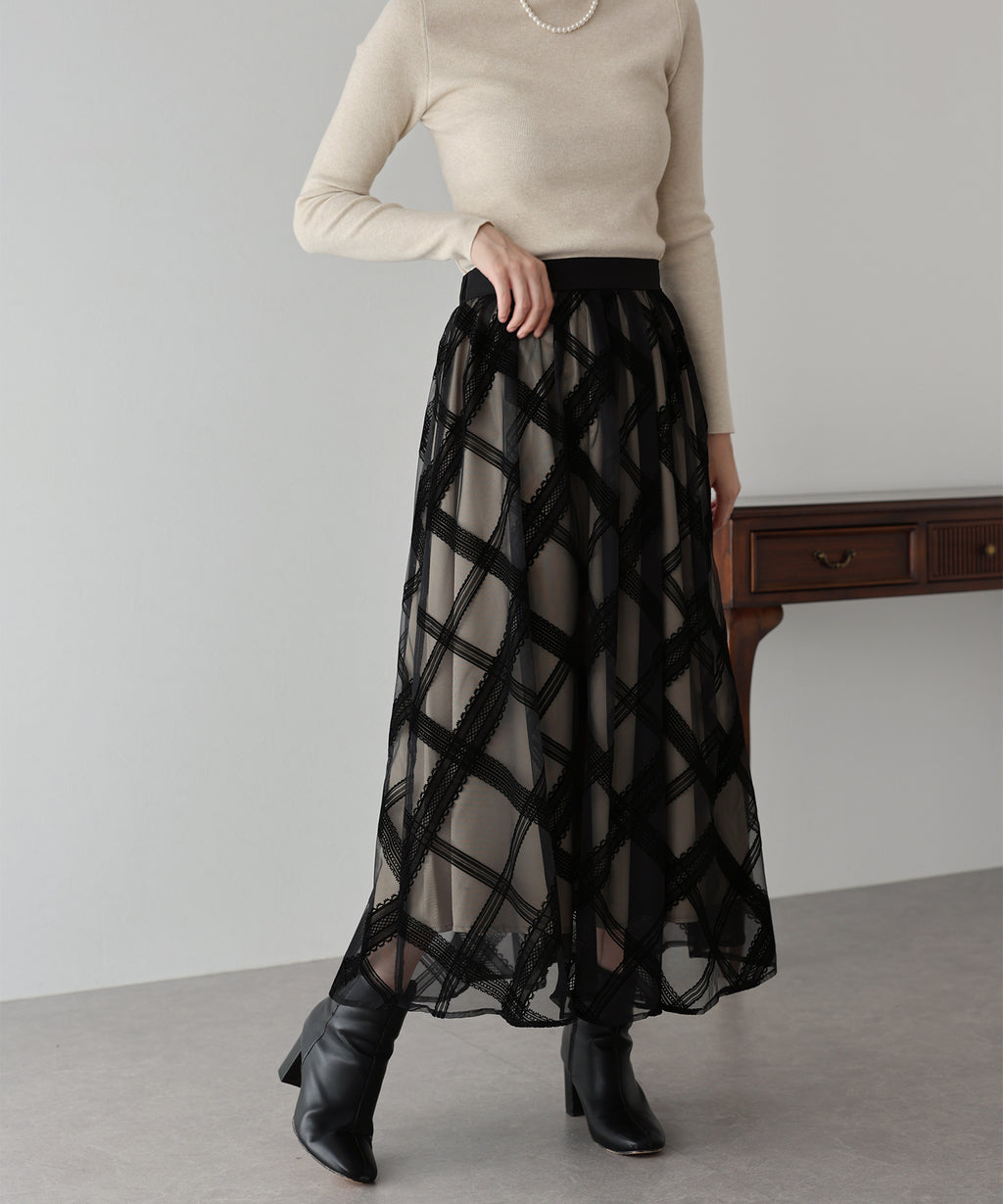 A checkered long skirt that creates a feminine impression.