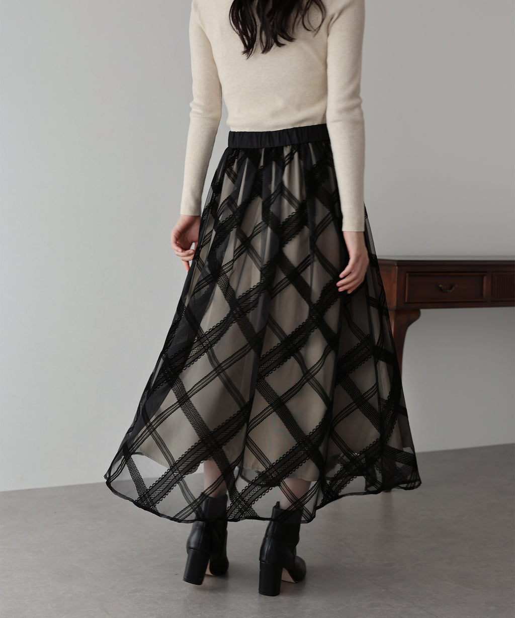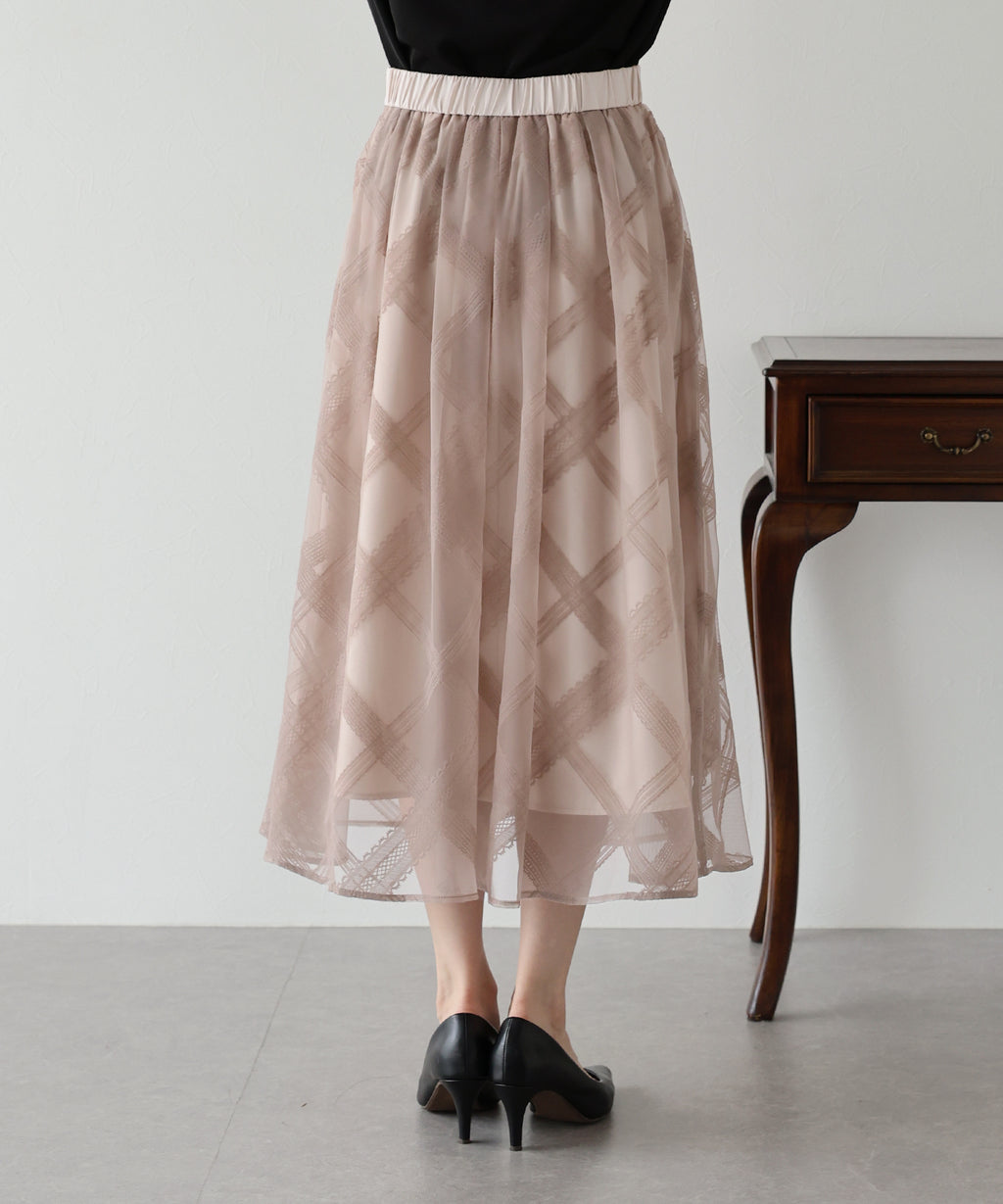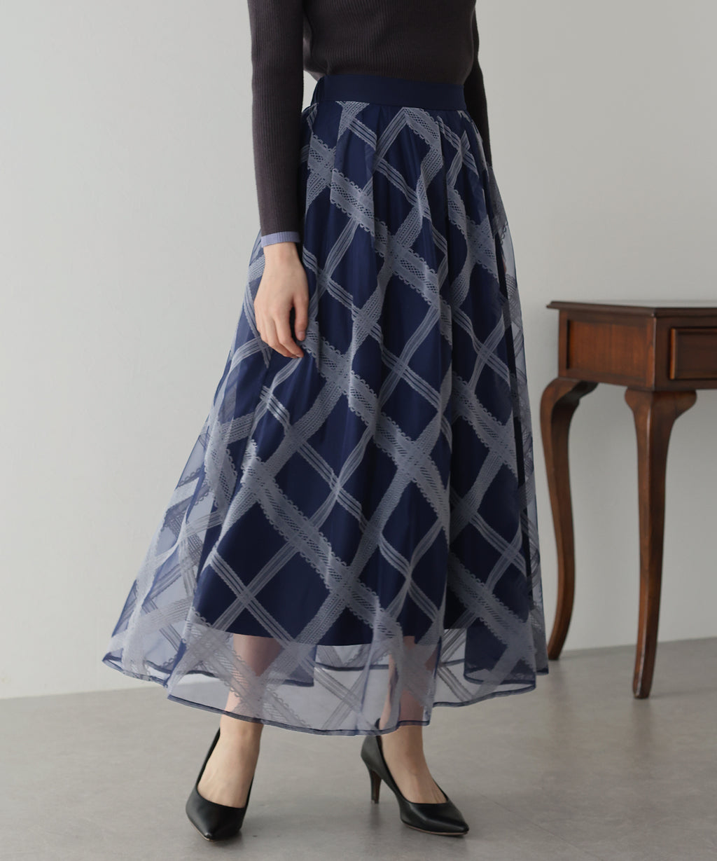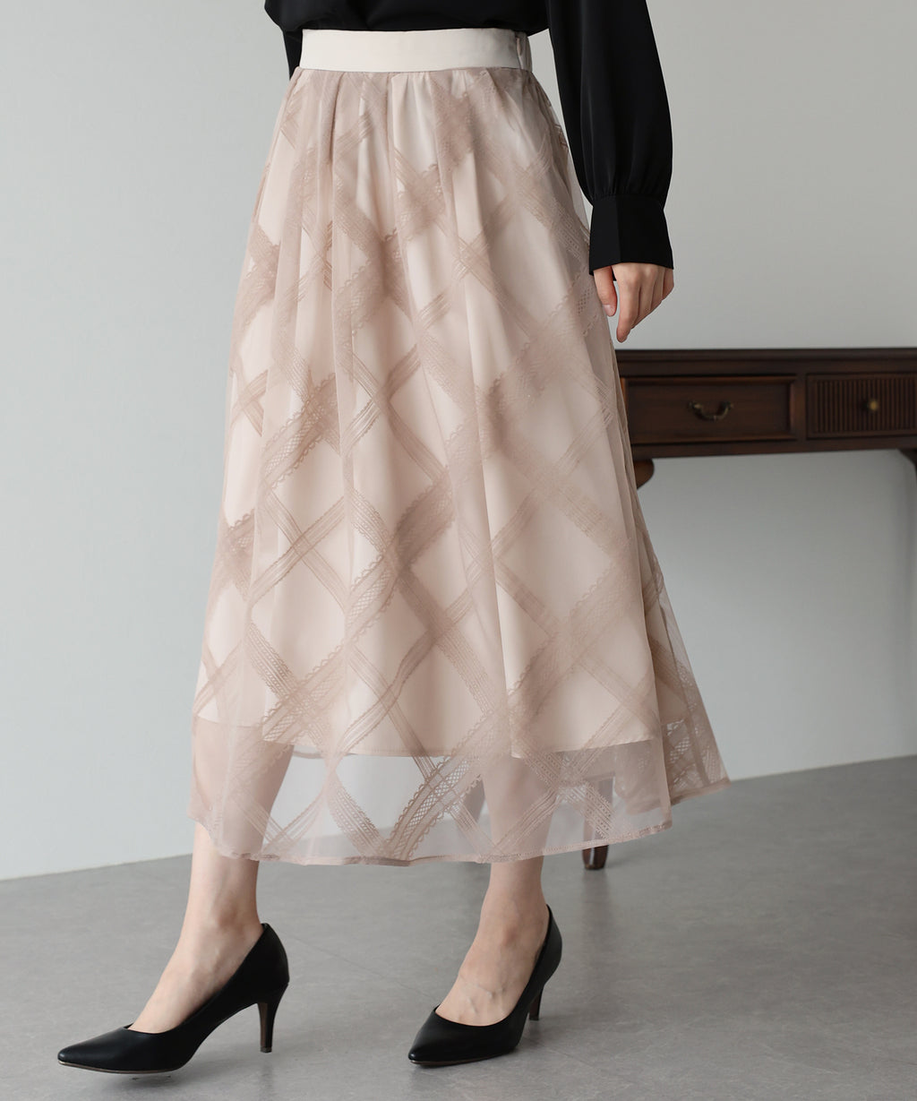 A checkered long skirt that creates a feminine impression.