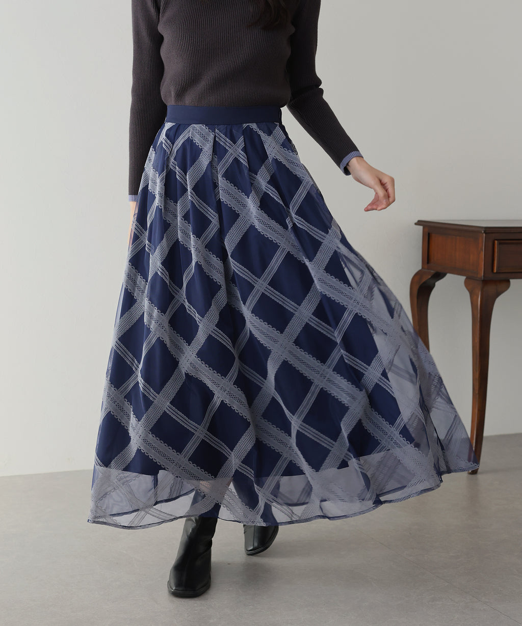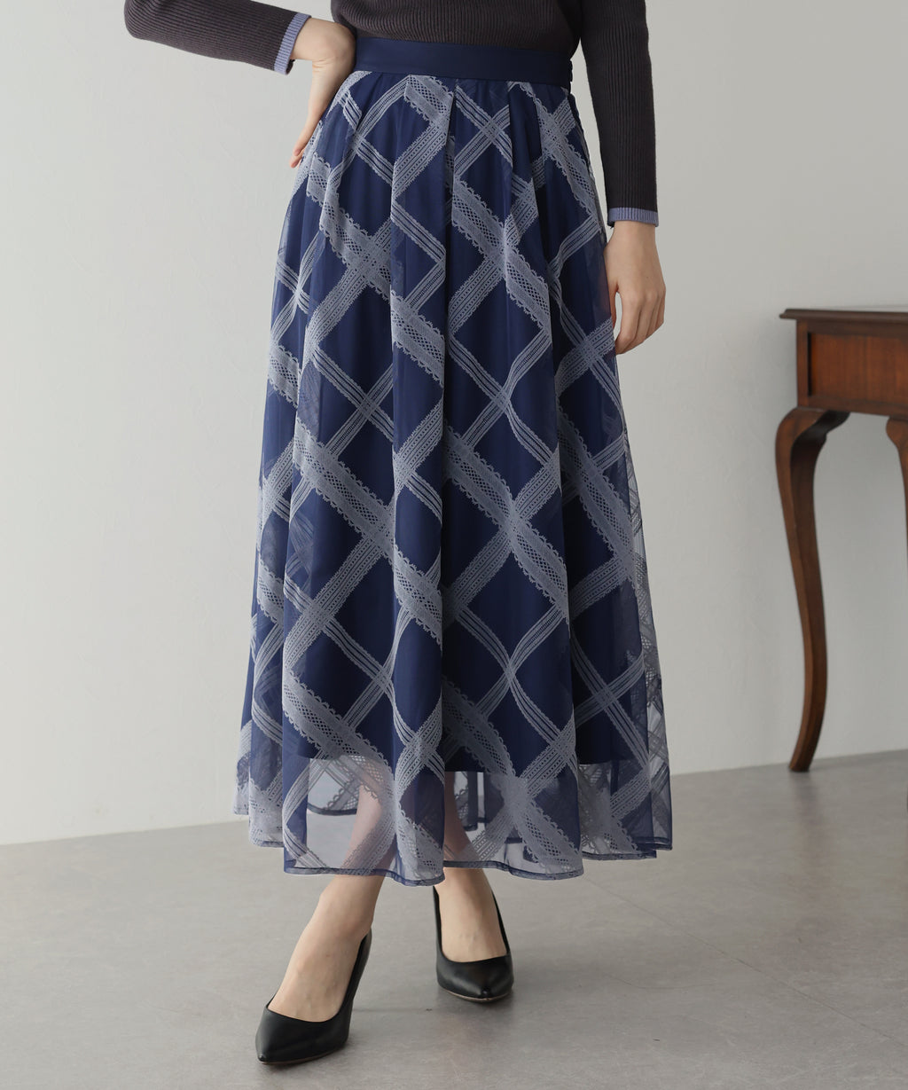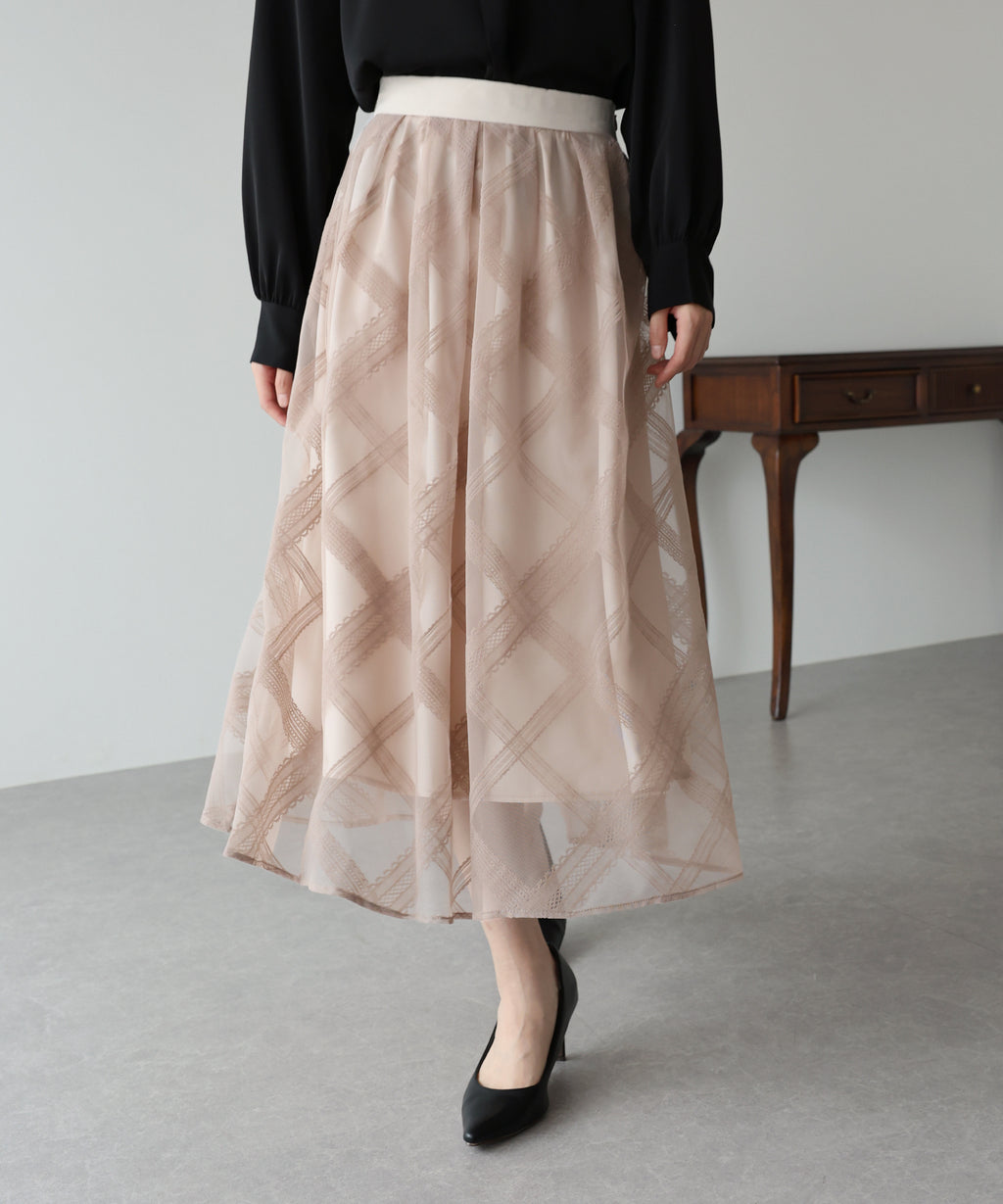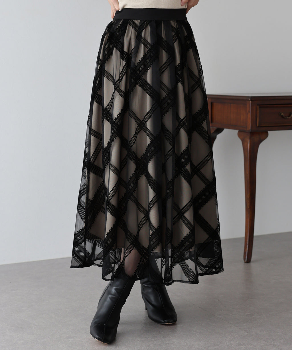 A checkered long skirt that creates a feminine impression.
