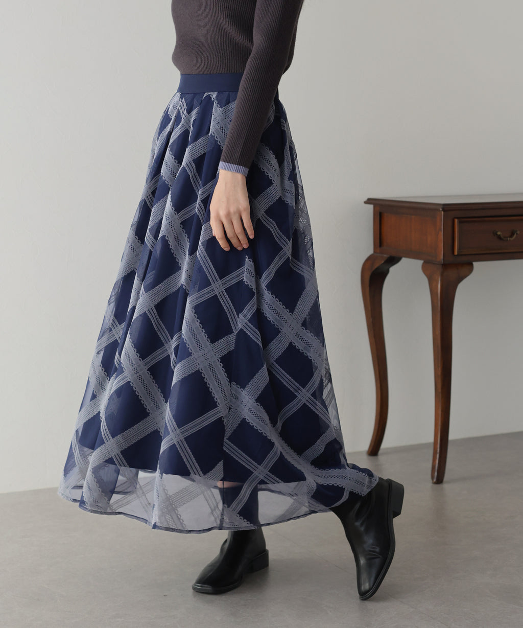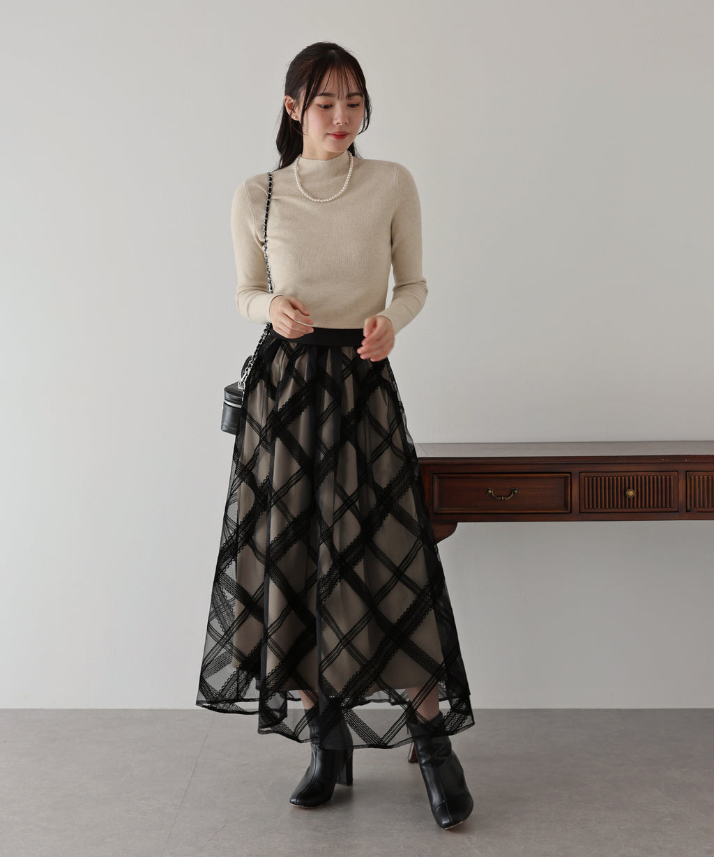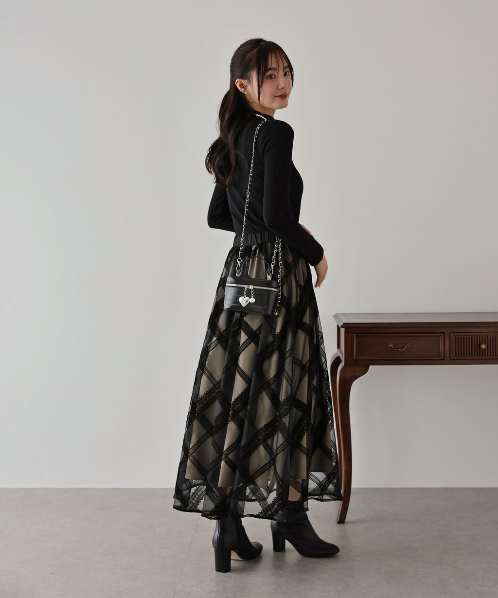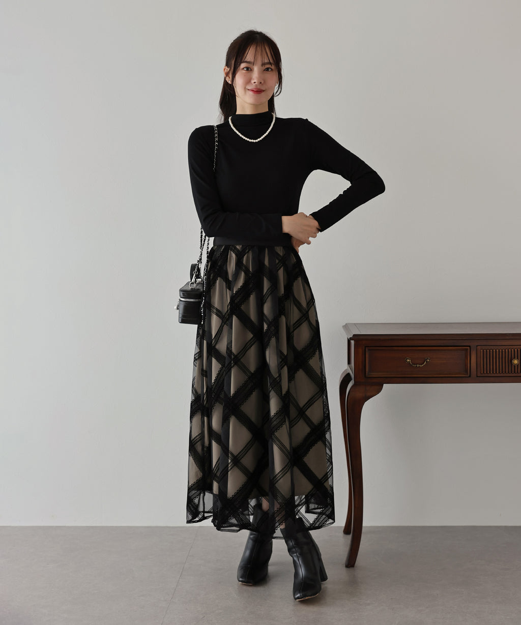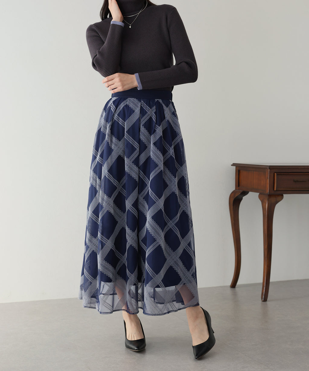 Just by pairing it with a simple top, you can complete a glamorous and classical coordinate.