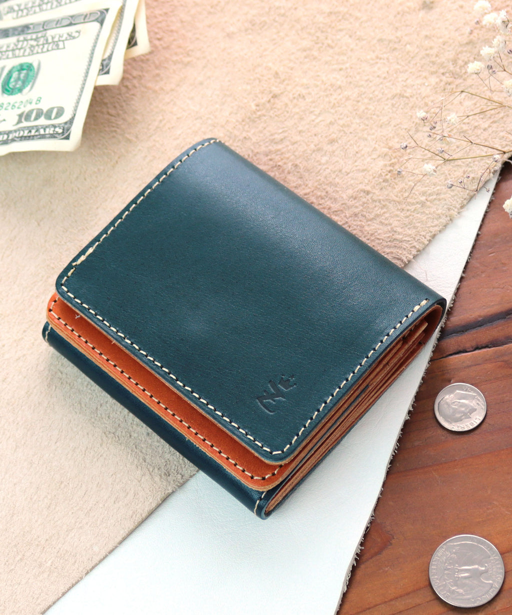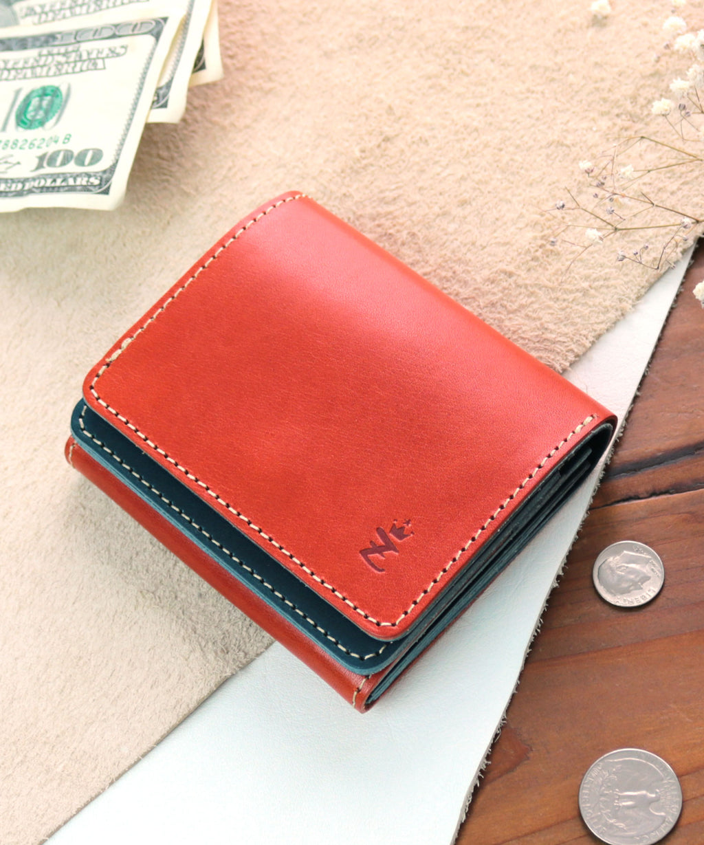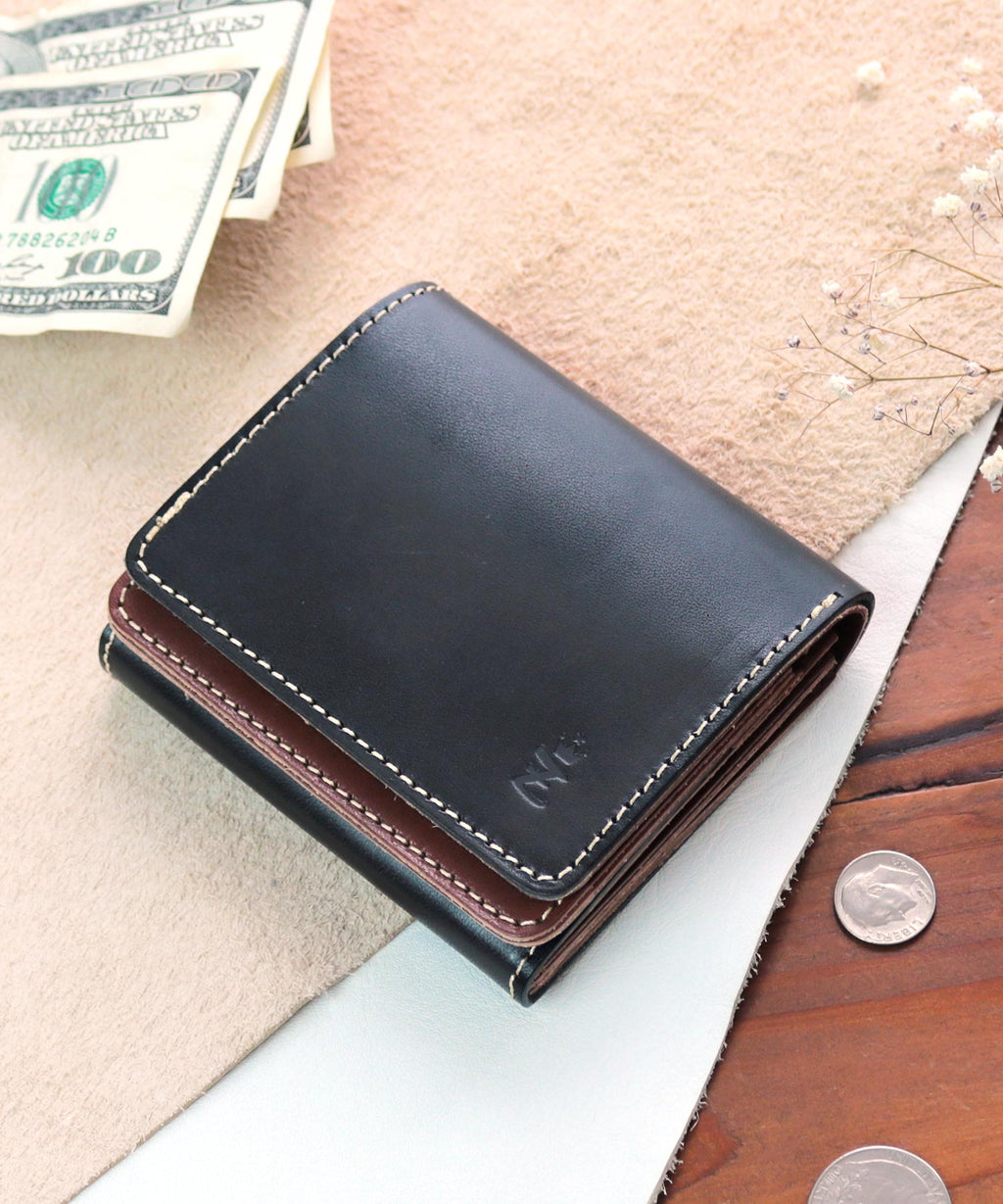 This is a new type of folding wallet with excellent functionality, featuring a double flap that divides the storage space into two.