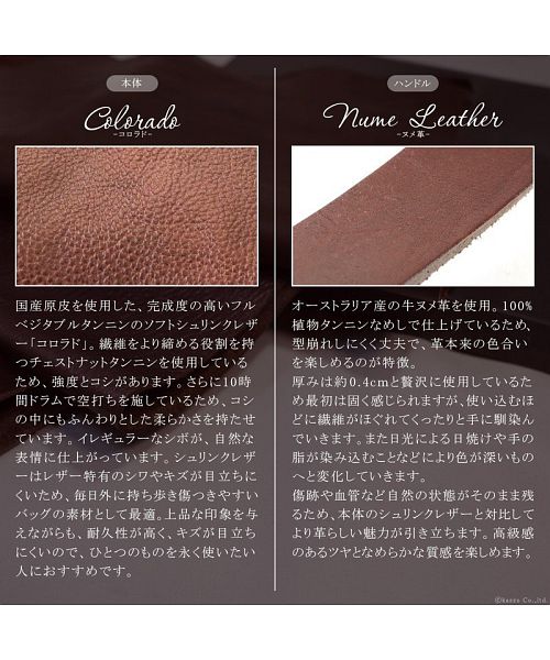 The main body uses high-quality full vegetable-tanned soft shrink leather "Colorado" made from domestically sourced raw hides.