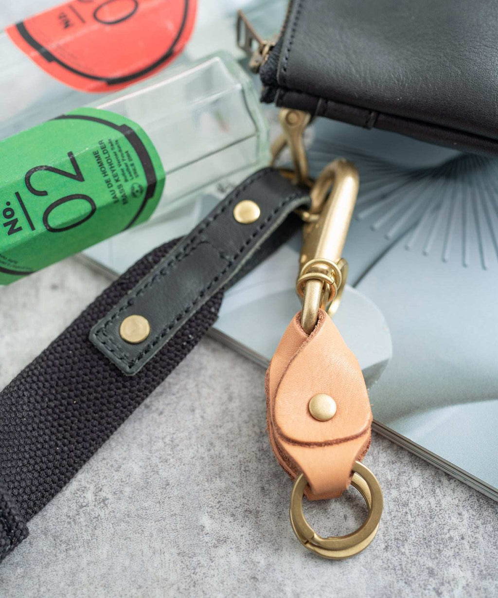 A key holder with a unique shape and a sense of heaviness, made by folding a thick piece of leather and passing metal fittings through it.