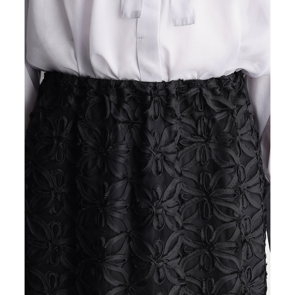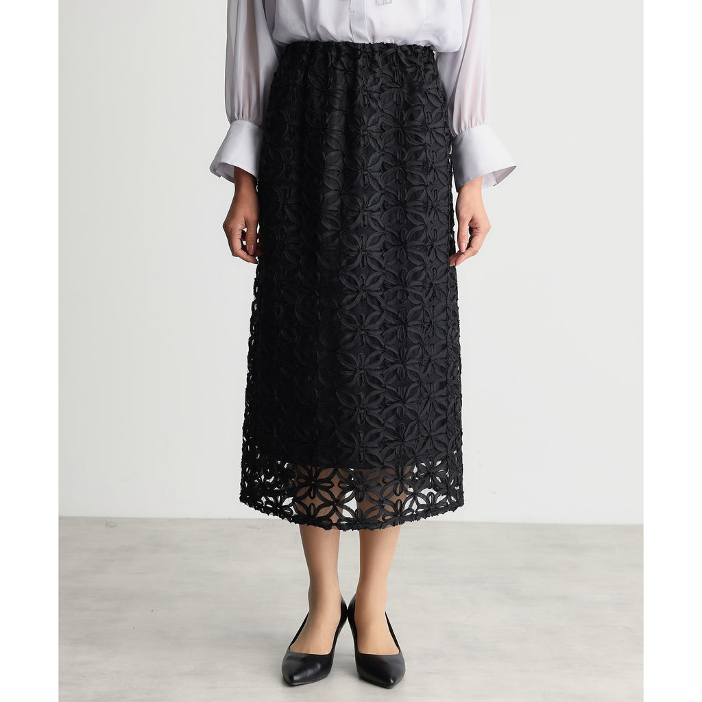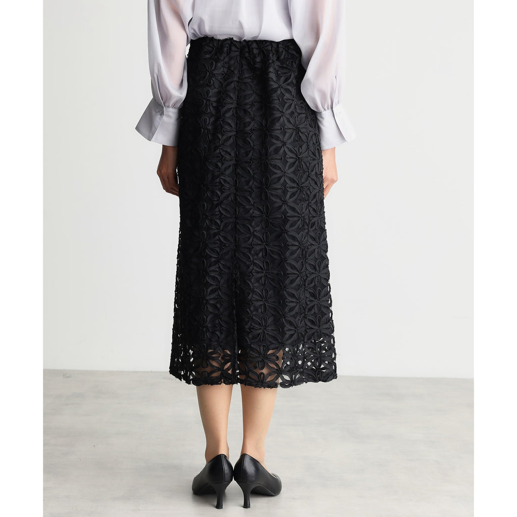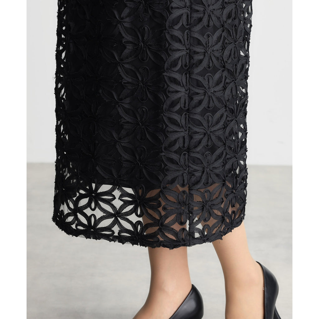 A delicate tight skirt made of sheer tulle fabric with floral pattern embroidery.