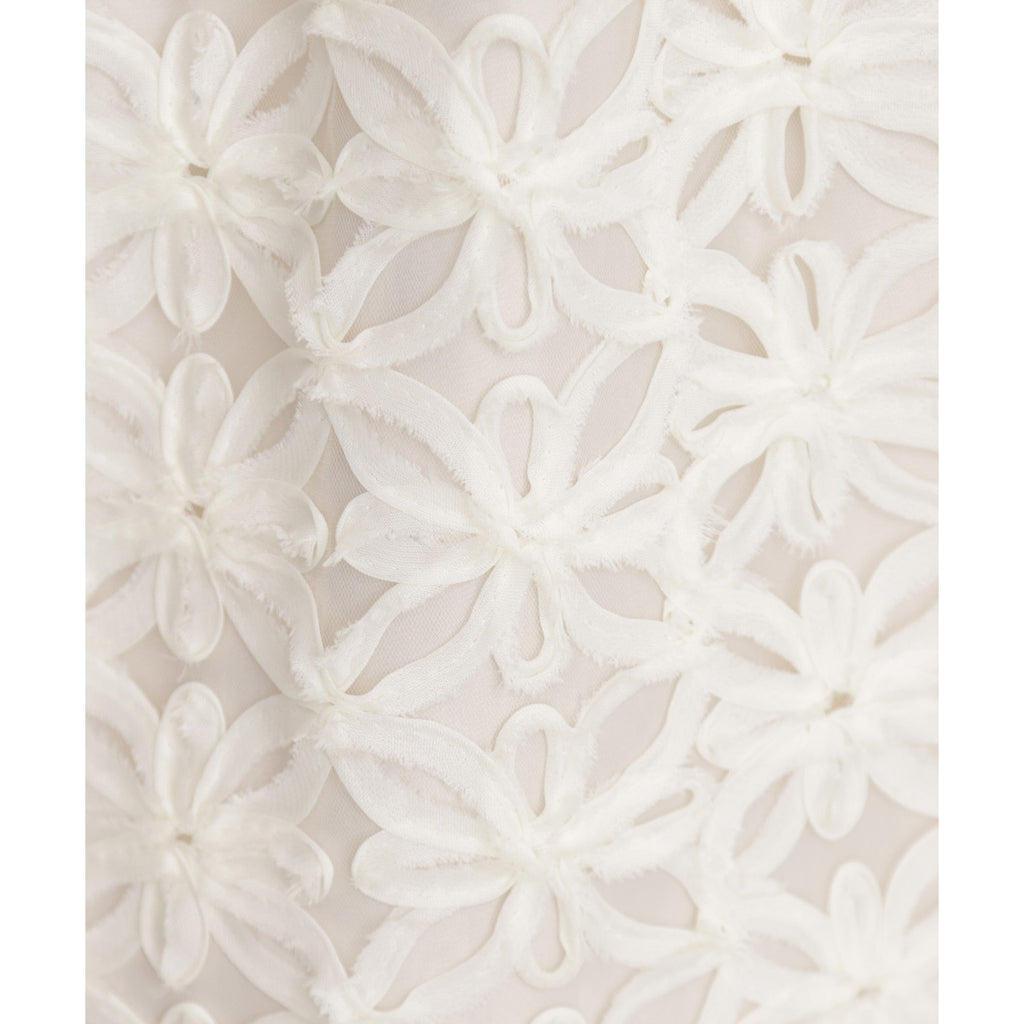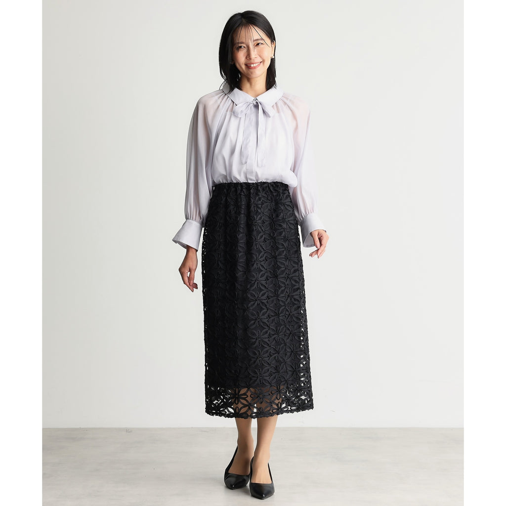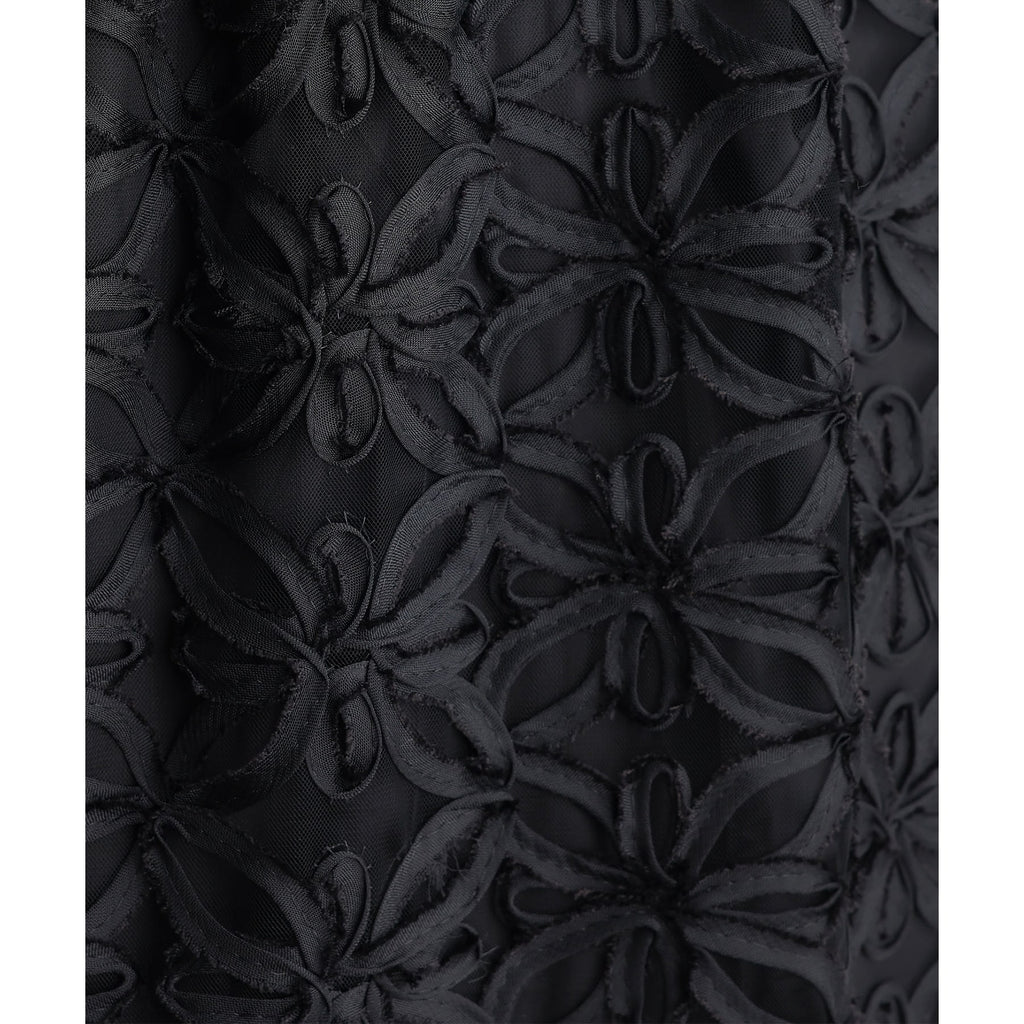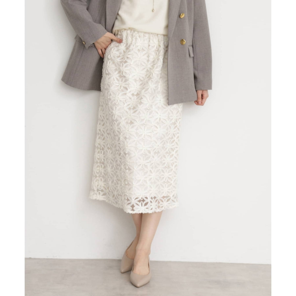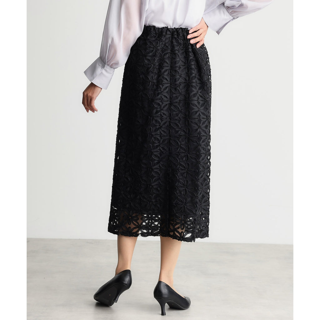 A delicate tight skirt made of sheer tulle fabric with floral pattern embroidery.