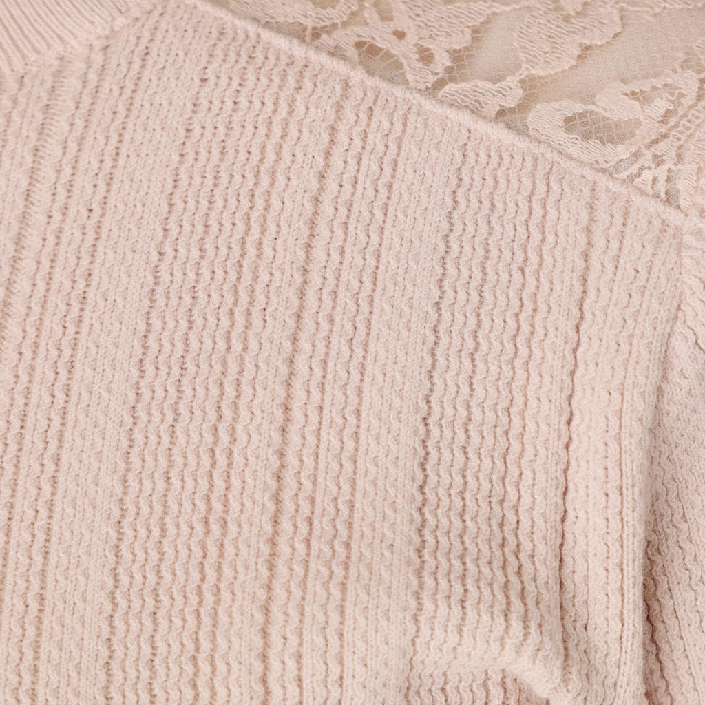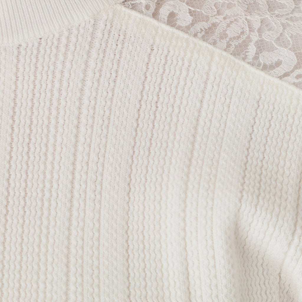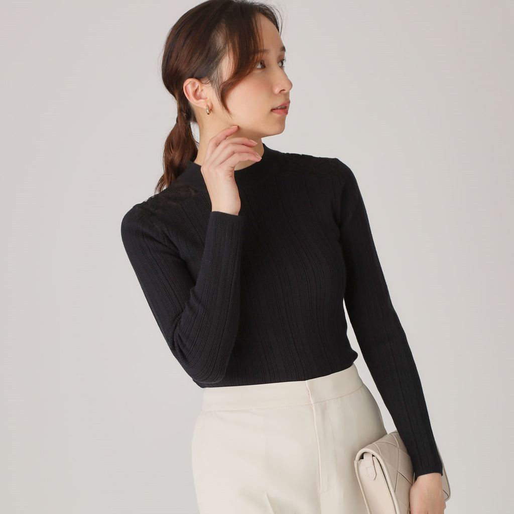 A knit top with delicate lace placed on the shoulders that enhances femininity.